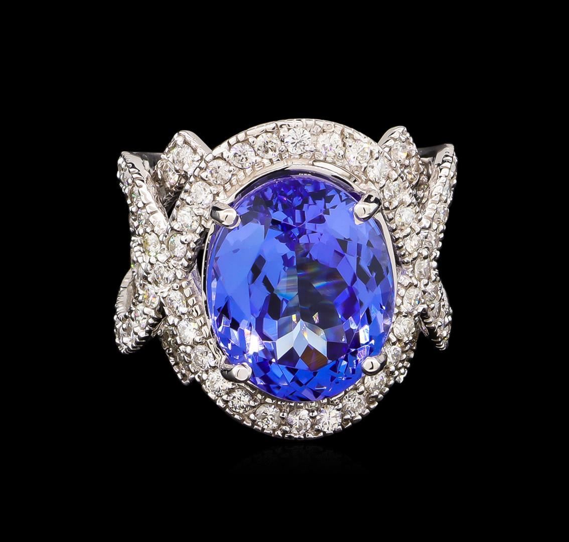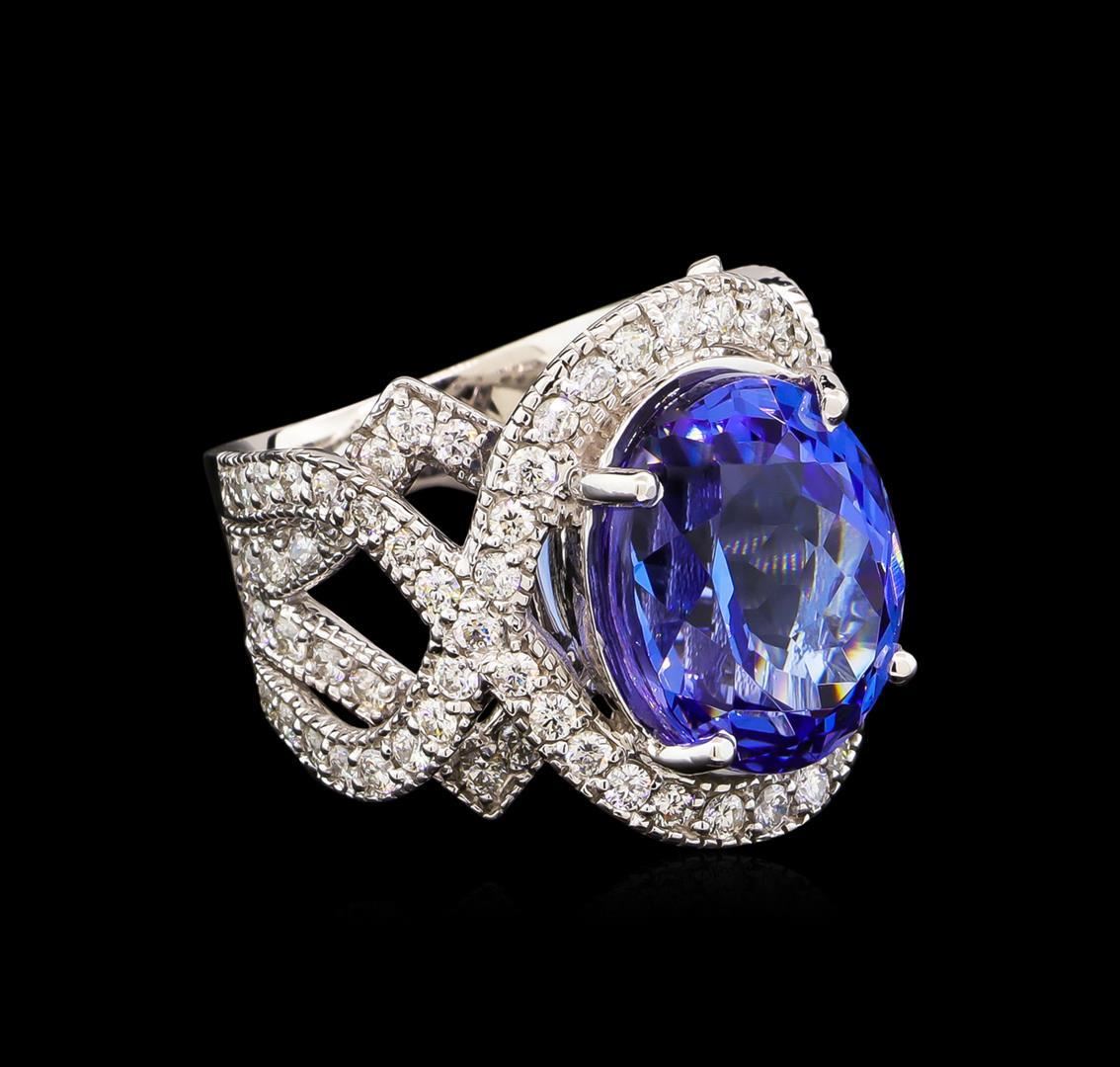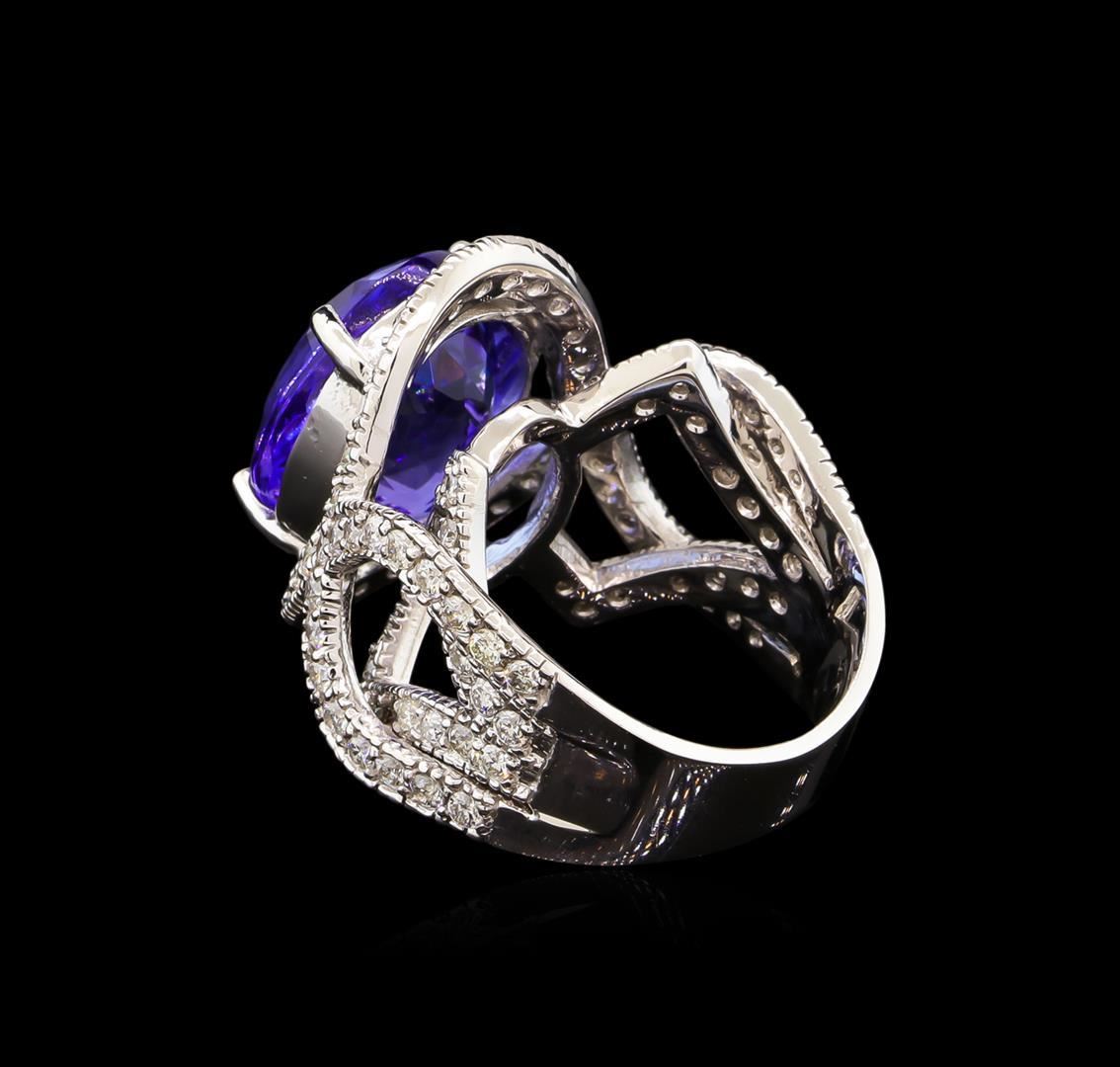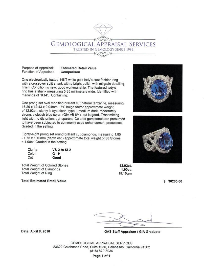 One electronically tested 14KT white gold lady's cast fashion ring with a crossover split shank with a bright polish with milgrain detailing finish. The featured lady's ring has a shank measuring 5.85 millimeters wide. Identified with markings of "K14". Condition is new, good workmanship. Containing: One prong set oval modified brilliant cut natural tanzanite, measuring 15.29 x 12.43 x 9.04mm, 7%. bulge factor, approximate weight of 12.92ct., clarity is eye clean, type I, medium dark, moderately strong, violetish blue color, (GIA vB 6/4), cut is good. Transmitting light with no distortion, transparent. Colored gemstones are presumed to have been subjected to commonly used enhancement processes. Graded in the setting. Eighty-Eight prong set round brilliant cut diamonds, measuring 1.85 - 1.75 x 1.10mm (depth est.) approximate total weight of 88 Stones = 1.90ct. Graded in the setting. Clarity: VS-2 to SI-2. Color: G - Good. Total Weight of Colored Stones 12.92ct. Total Weight of Diamonds 1.90ct. Total Weight of Ring 15.10gm. GAS Appraised.
