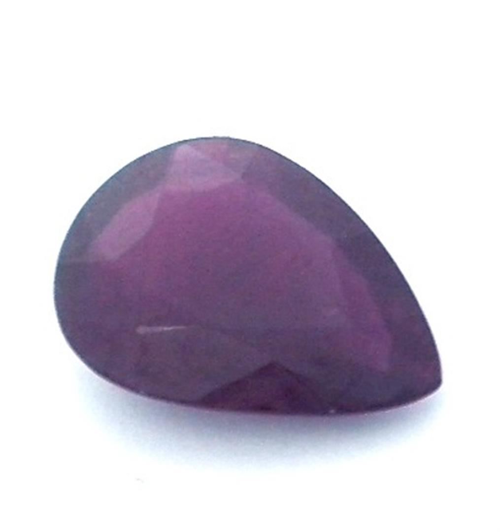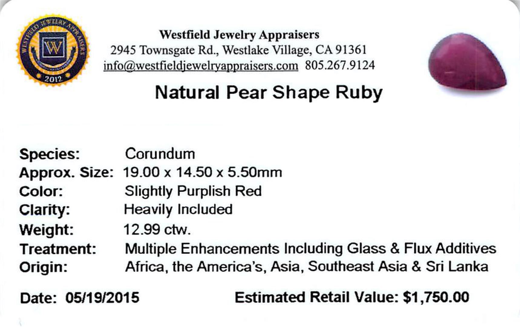 One pear mixed cut natural ruby, measuring 19.00 x 14.50 x 5.50mm, exact weight 12.99ct., clarity is heavily included, type II, dark, very slightly brownish, slightly purplish red color, (GIA slpR 7/3), cut is good. Transmitting light somewhat diffusely, transparent to translucent. Naturally occurring internal & external characteristics are present. Indications of laboratory high temperature heat treatment, with glass & flux additives. Ruby has a low tolerance to rhodium plating, repolishing the surface, & ultrasonic cleaning. Westfield Appraised.