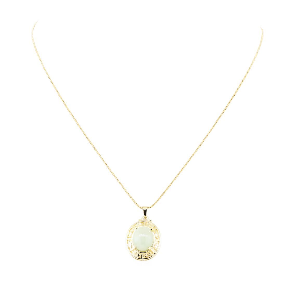 One oval pendant cast from 14KT yellow gold with an attached 18KT yellow gold sixteen inch long twisted chain featuring: 14KT and 18KT yellow gold weighing 6.7 grams containing one piece of jade measuring 12mm by 10mm.