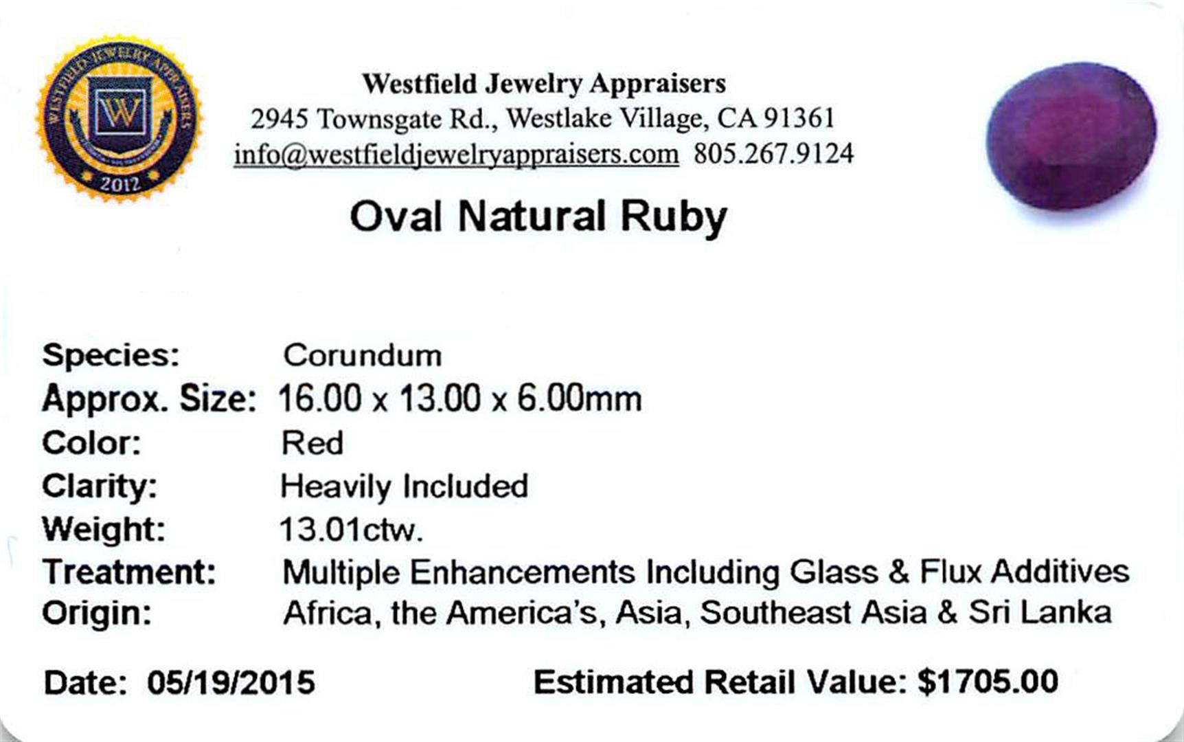 One oval mixed cut natural ruby, measuring 16.00 x 13.00 x 6.50mm, exact weight 13.01ct., clarity is heavily included, type II, dark, very slightly brownish, slightly purplish red color, (GIA slpR 7/3), cut is good. Transmitting light somewhat diffusely, transparent to translucent. Naturally occurring internal & external characteristics are present. Indications of laboratory high temperature heat treatment, with glass & flux additives. Ruby has a low tolerance to rhodium plating, repolishing the surface, & ultrasonic cleaning. Westfield Appraised.