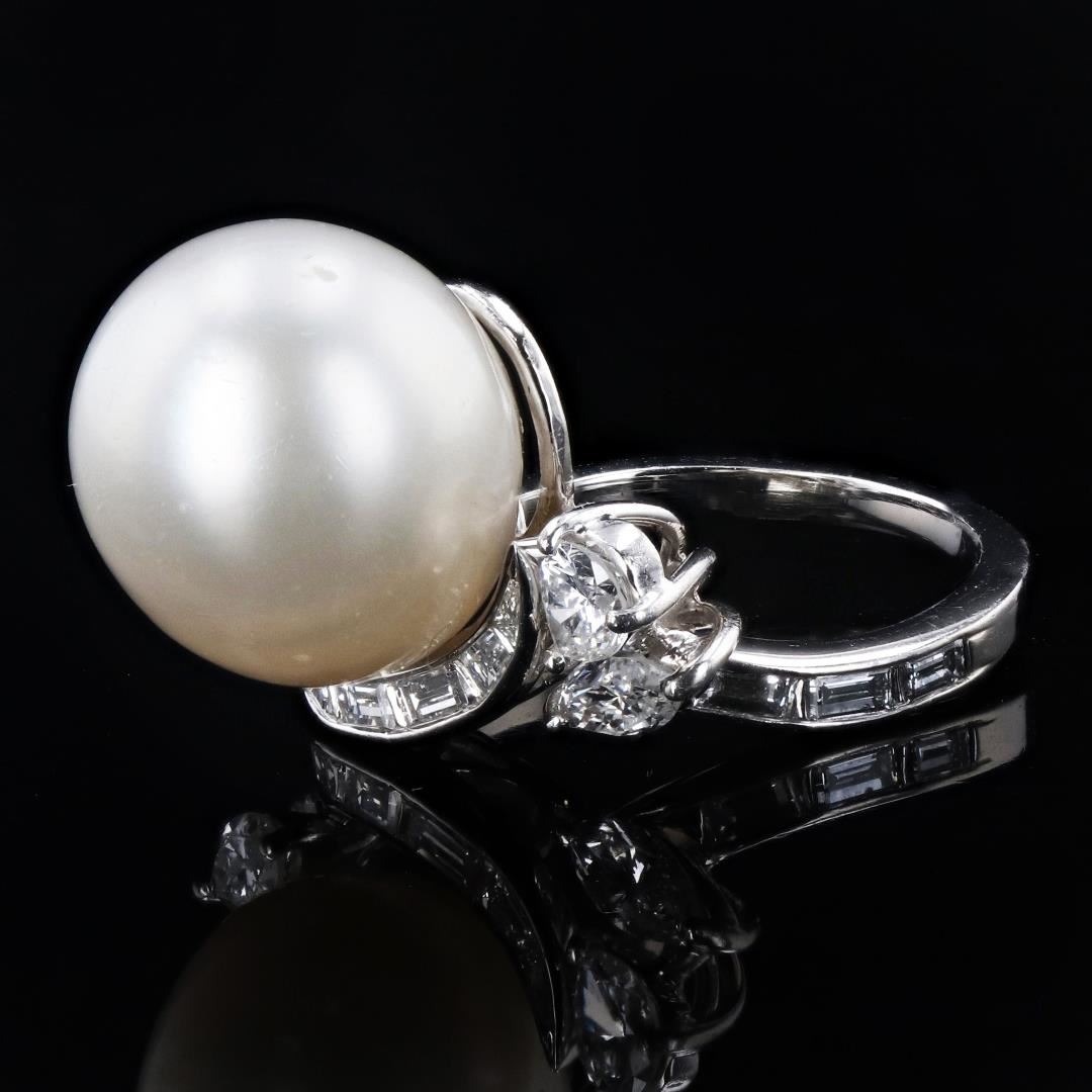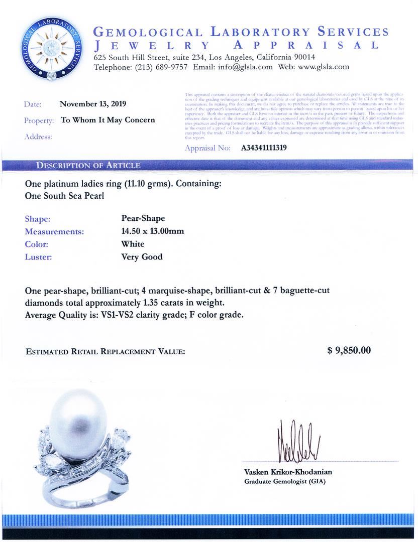 One platinum ladies ring (11.10 grms). Containing: One South Sea Pearl Shape: Pear-Shape Measurements: 14.50 x 13.00mm Color: White Luster: Very Good One pear-shape, brilliant-cut 4 marquise-shape, brilliant-cut & 7 baguette-cut diamonds total approximately 1.35 carats in weight Average Quality is: VS1-VS2 clarity grade, F color grade.