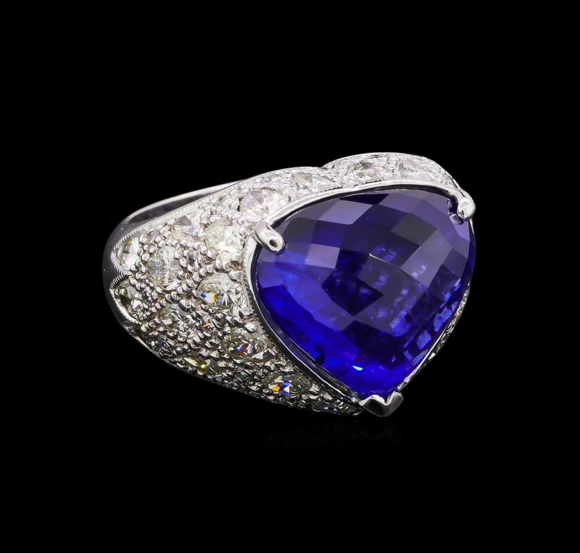 One electronically tested 18KT white gold ladies cast sapphire and diamond ring. The featured sapphire is set within a diamond studded curvature supported by a lattice under gallery and tapering shoulders, completed by a four millimeter wide band. Bright and patterned finish. Identified with markings of "750". Condition is good. Containing: One prong set triangle cabochon cut natural blue sapphire, measuring 11.90 x 12.90 x 7.90mm, approximate weight of 13.10ct., clarity is moderately included, type II, medium dark, very slightly grayish, blue color, (GIA B 6/3), cut is good. Transmitting light with a minimum of distortion, transparent. Naturally occurring internal & external characteristics are present. Graded in the setting. Twenty-Eight prong set pear shaped cut diamonds, measuring 3.00. x 2.25 x 1.42mm (depth est.) approximate total weight of 28 Stones = 1.61ct. Measurements are an average for the group. Graded in the setting, Graded in the setting. Clarity: VS-2 to SI-2 . Color: I - K Twenty-Two prong set round brilliant cut diamonds, measuring 1.30 - 1.20 x 0.75mm (depth est.) approximate total weight of 22 Stones = 0.18ct. Graded in the setting. Clarity: SI-1 to I-1 . Color: F - H. Total Weight of Colored Stones 13.10ct.. Total Weight of Diamonds 1.79ct.. Total Weight of Ring 10.19gm. AIG Appraised.