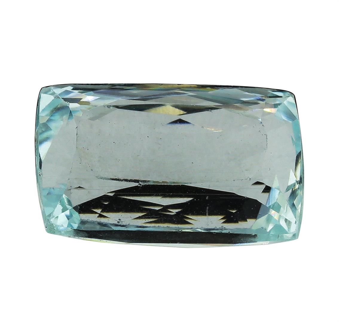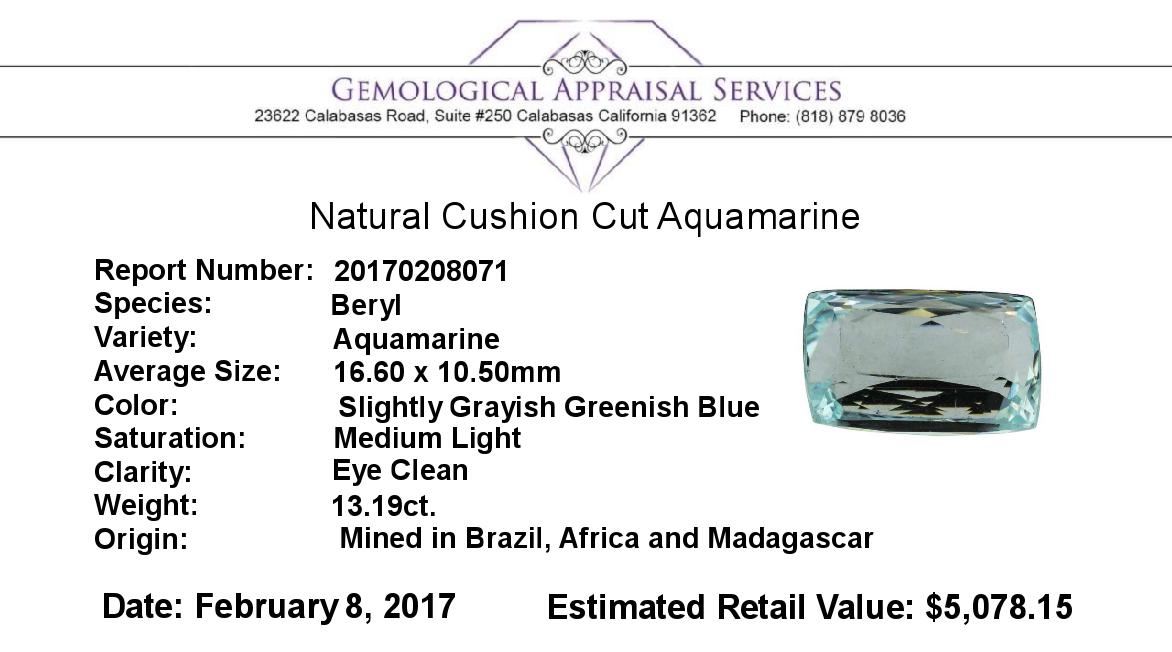 One natural cushion cut aquamarine with an exact weight of 13.19ct., clarity is eye clean, slightly grayish greenish blue, medium light. Gemological Appraisals Services estimates the retail value at $5078.15 GAS Appraised.