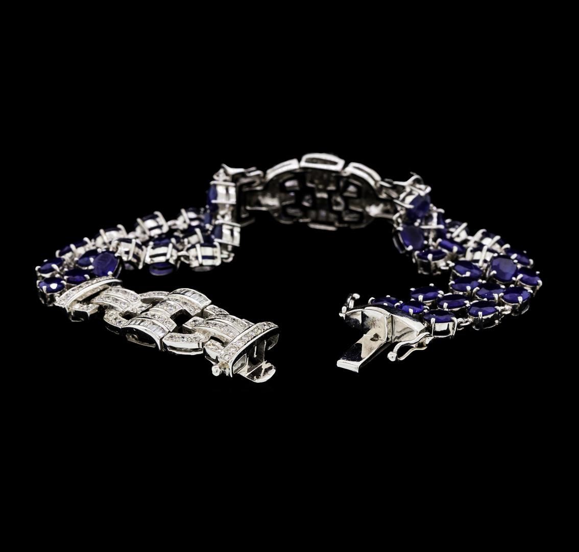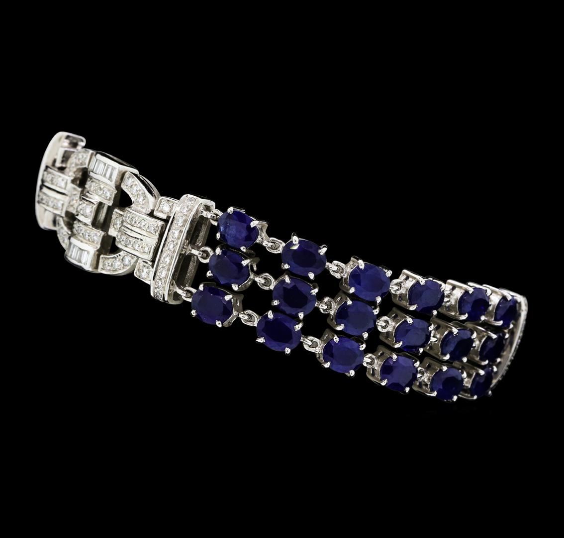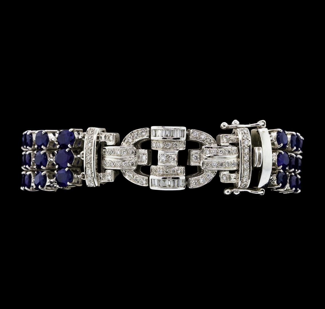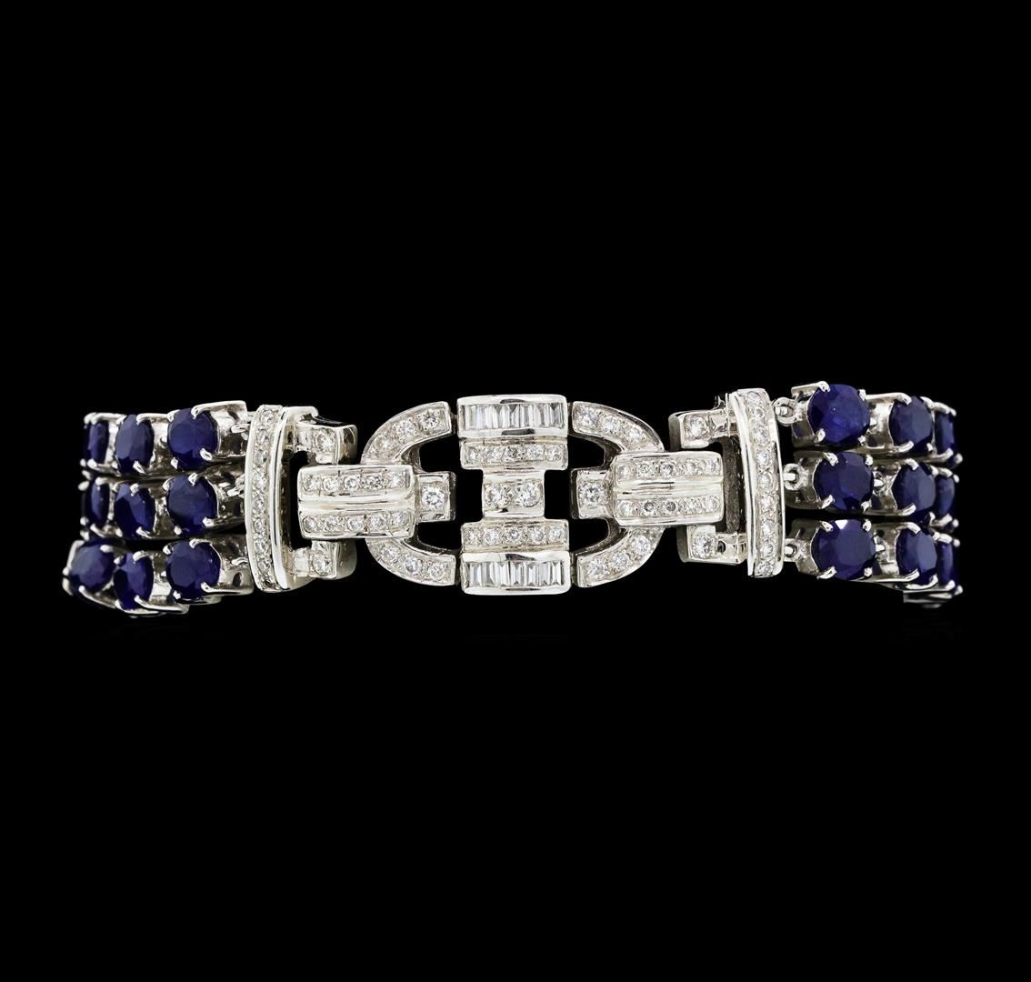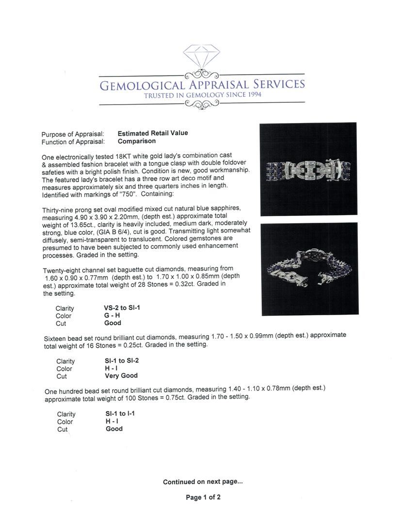 One electronically tested 18KT white gold lady's combination cast & assembled fashion bracelet with a tongue clasp with double foldover safeties with a bright polish finish. The featured lady's bracelet has a three row art deco motif and measures approximately six and three quarters inches in length. Identified with markings of '750'. Condition is new, good workmanship. Containing: Thirty-nine prong set oval modified mixed cut natural blue sapphires, measuring 4.90 x 3.90 x 2.20mm, (depth est.) approximate total weight of 13.65ct., clarity is heavily included, medium dark, moderately strong, blue color, (GIA B 6/4), cut is good. Transmitting light somewhat diffusely, semi-transparent to translucent. Colored gemstones are presumed to have been subjected to commonly used enhancement processes. Graded in the setting. Twenty-Eight channel set baguette cut diamonds, measuring from 1.60 x 0.90 x 0.77mm (depth est.) to 1.70 x 1.00 x 0.85mm (depth est.) approximate total weight of 28 Stones = 0.32ct. Graded in the setting. Color G - H Clarity VS-2 to SI-1 Cut Good Sixteen bead set round brilliant cut diamonds, measuring 1.70 - 1.50 x 0.99mm (depth est.) approximate total weight of 16 Stones = 0.25ct. Graded in the setting. Color H - I Clarity SI-1 to SI-2 Cut Very Good One Hundred bead set round brilliant cut diamonds, measuring 1.40 - 1.10 x 0.78mm (depth est.) approximate total weight of 100 Stones = 0.75ct. Graded in the setting. Color H - I Clarity SI-1 to I-1 Cut Good. Total Weight of Colored Stones 13.65ct.. Total Weight of Diamonds 1.32ct.. Total Weight of Bracelet 34.00gm GAS Appraised at $15295.00. GAS Appraised.