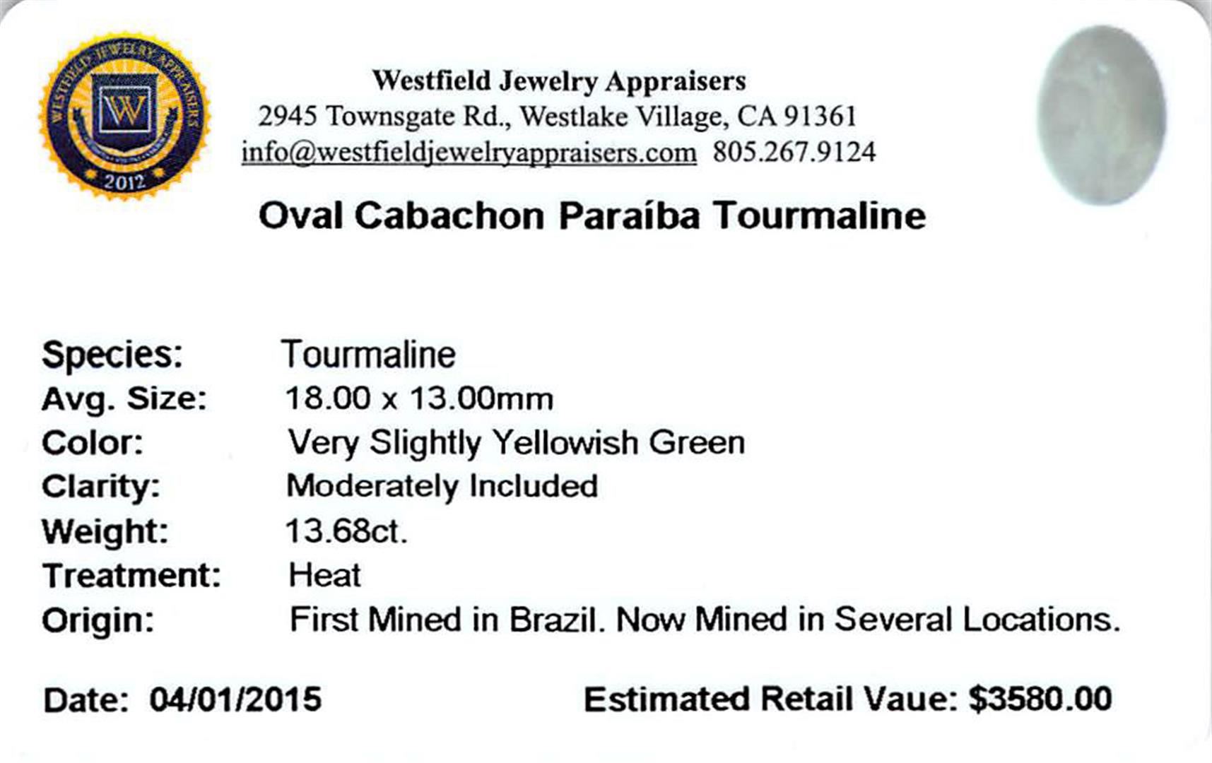 One oval cabochon cut natural Paraiba tourmaline exact weight 13.68ct., clarity is moderately included, cut is good. Westfield Appraised.