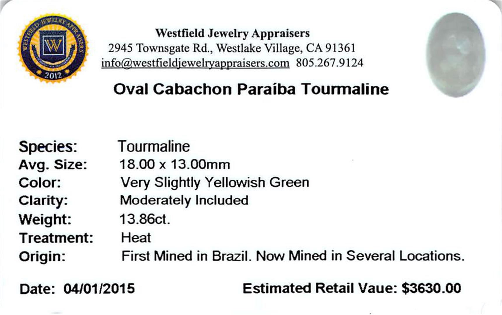 One oval cabochon cut natural Paraiba tourmaline exact weight 13.86ct., clarity is moderately included, cut is good. Westfield Appraised.
