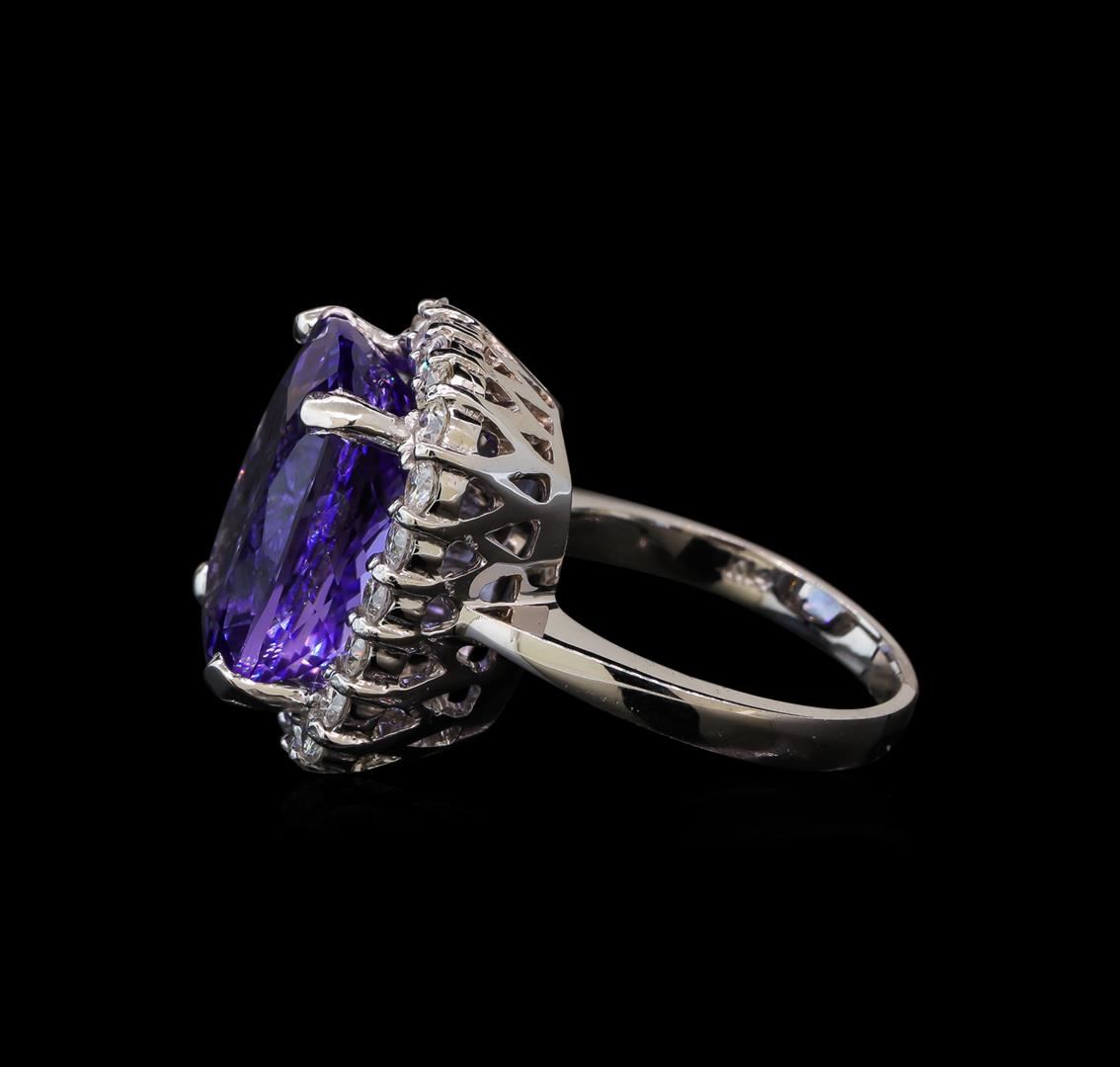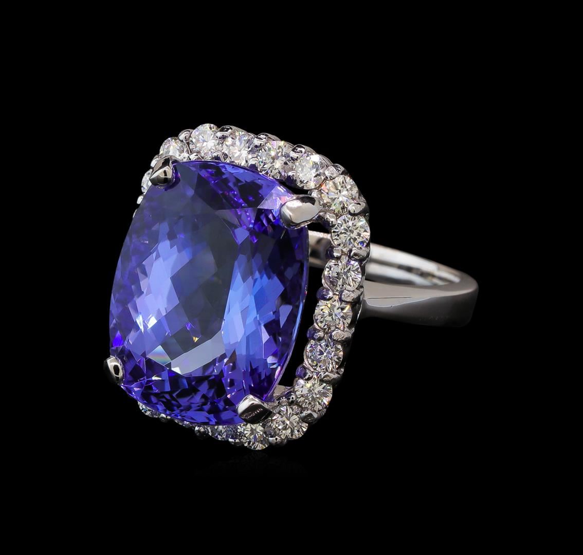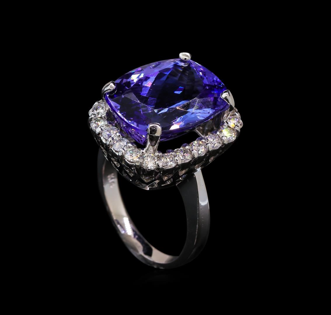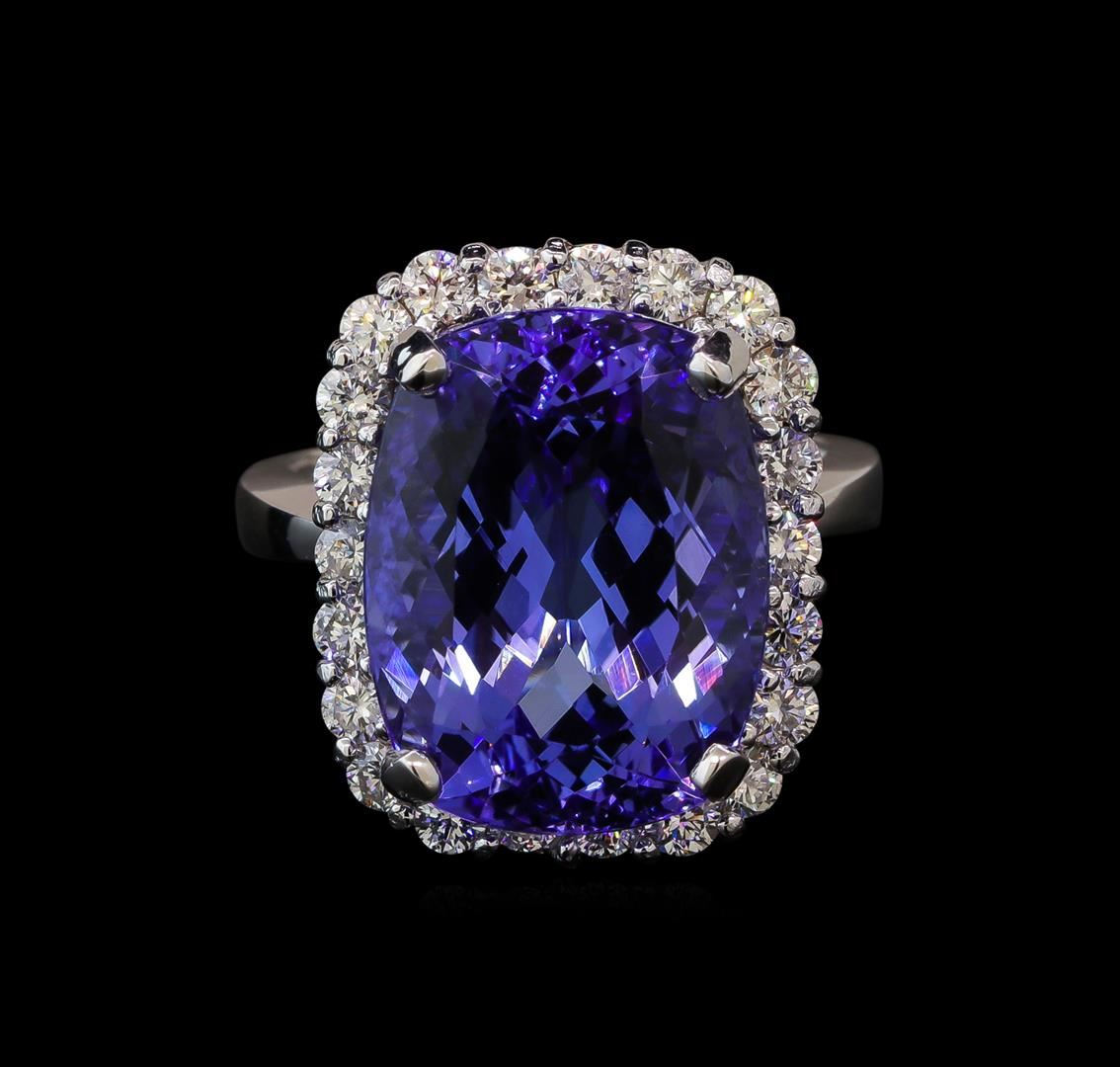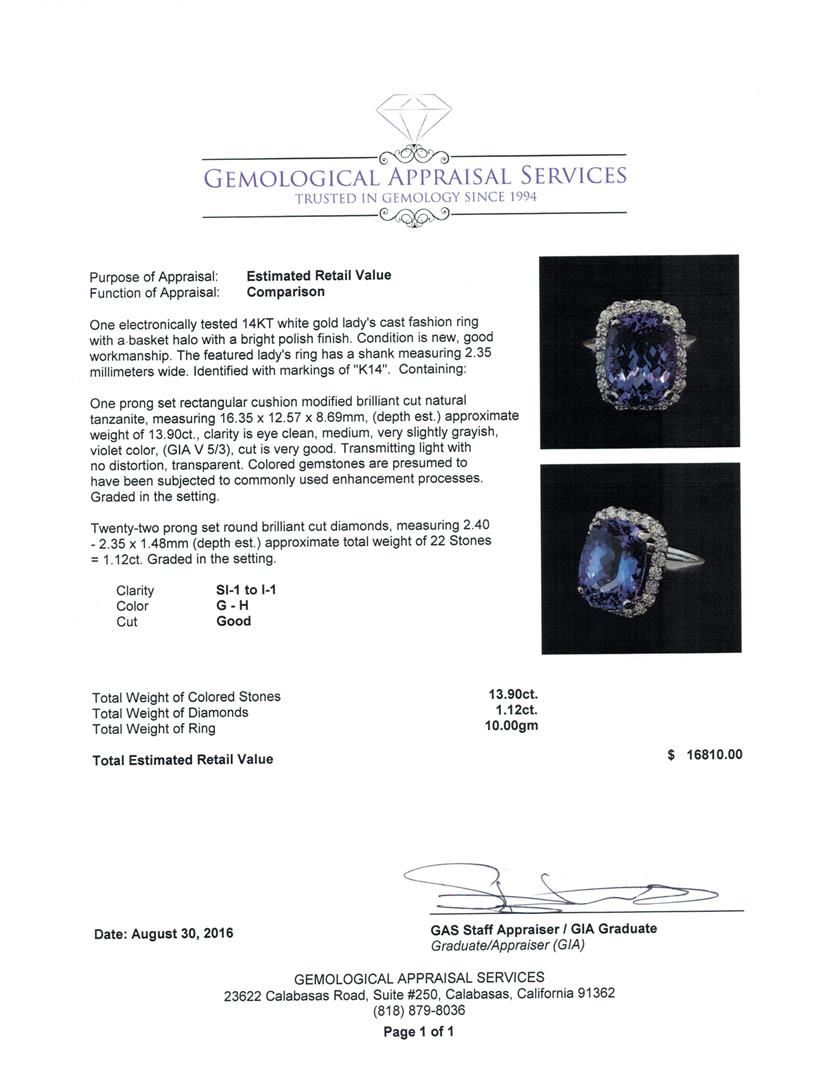 One electronically tested 14KT white gold lady's cast fashion ring with a basket halo with a bright polish finish. The featured lady's ring has a shank measuring 2.35 millimeters wide. Identified with markings of 'K14'. Condition is new, good workmanship. Containing: One prong set rectangular cushion modified brilliant cut natural tanzanite, measuring 16.35 x 12.57 x 8.69mm, (depth est.) approximate weight of 13.90ct., clarity is eye clean, medium, very slightly grayish, violet color, (GIA V 5/3), cut is very good. Transmitting light with no distortion, transparent. Colored gemstones are presumed to have been subjected to commonly used enhancement processes. Graded in the setting. Twenty-Two prong set round brilliant cut diamonds, measuring 2.40 - 2.35 x 1.48mm (depth est.) approximate total weight of 22 Stones = 1.12ct. Graded in the setting. Clarity SI-1 to I-1. Color: G - H Cut Good. Total Weight of Colored Stones 13.90ct. Total Weight of Diamonds 1.12ct. Total Weight of Ring 10.00gm. GAS Appraised at $16,810.00.