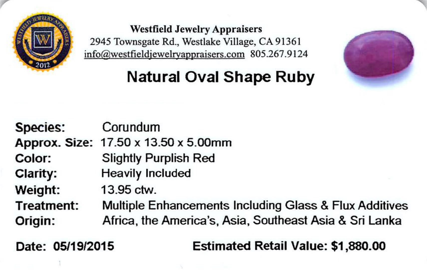 One oval mixed cut natural ruby, measuring 17.50 x 13.50 x 5.00mm, exact weight 13.95ct., clarity is heavily included, type II, medium dark, very slightly brownish, slightly purplish red color, (GIA slpR 6/3), cut is good. Transmitting light somewhat diffusely, transparent to translucent. Naturally occurring internal & external characteristics are present. Indications of laboratory high temperature heat treatment, with glass & flux additives. Ruby has a low tolerance to rhodium plating, repolishing the surface, & ultrasonic cleaning. Westfield Appraised.
