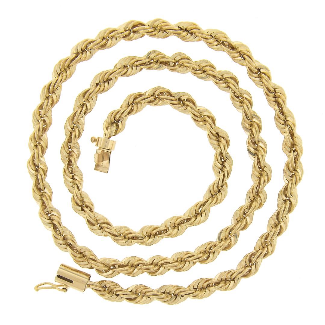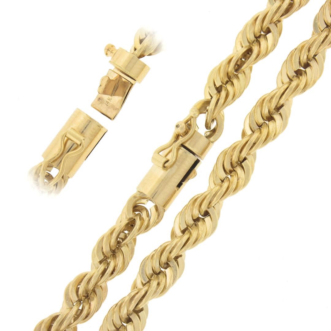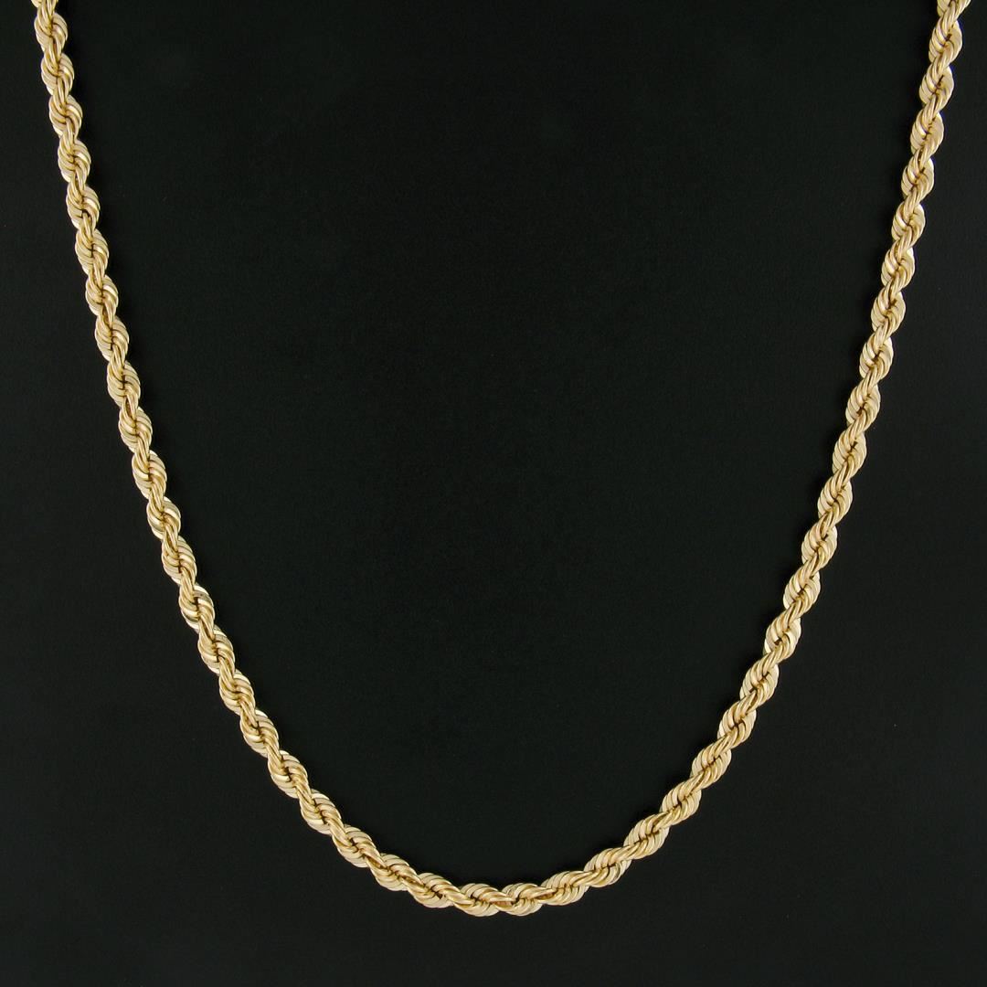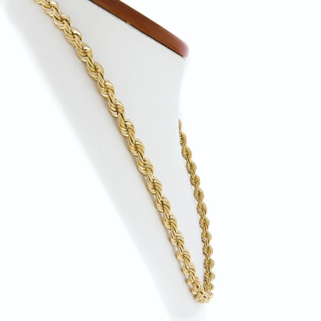 A solid 14k yellow gold rope link necklace. It weighs a total of 52.69 grams, measures 5.7mm wide, and measures 20 inches in length.