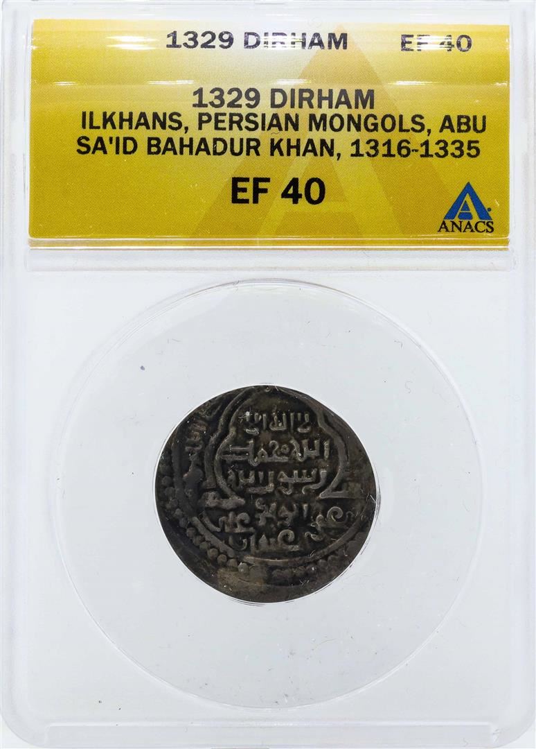One 1329 Ilkhans Dirham Persian Mongols Coin ANACS EF40. ANACS Appraised.