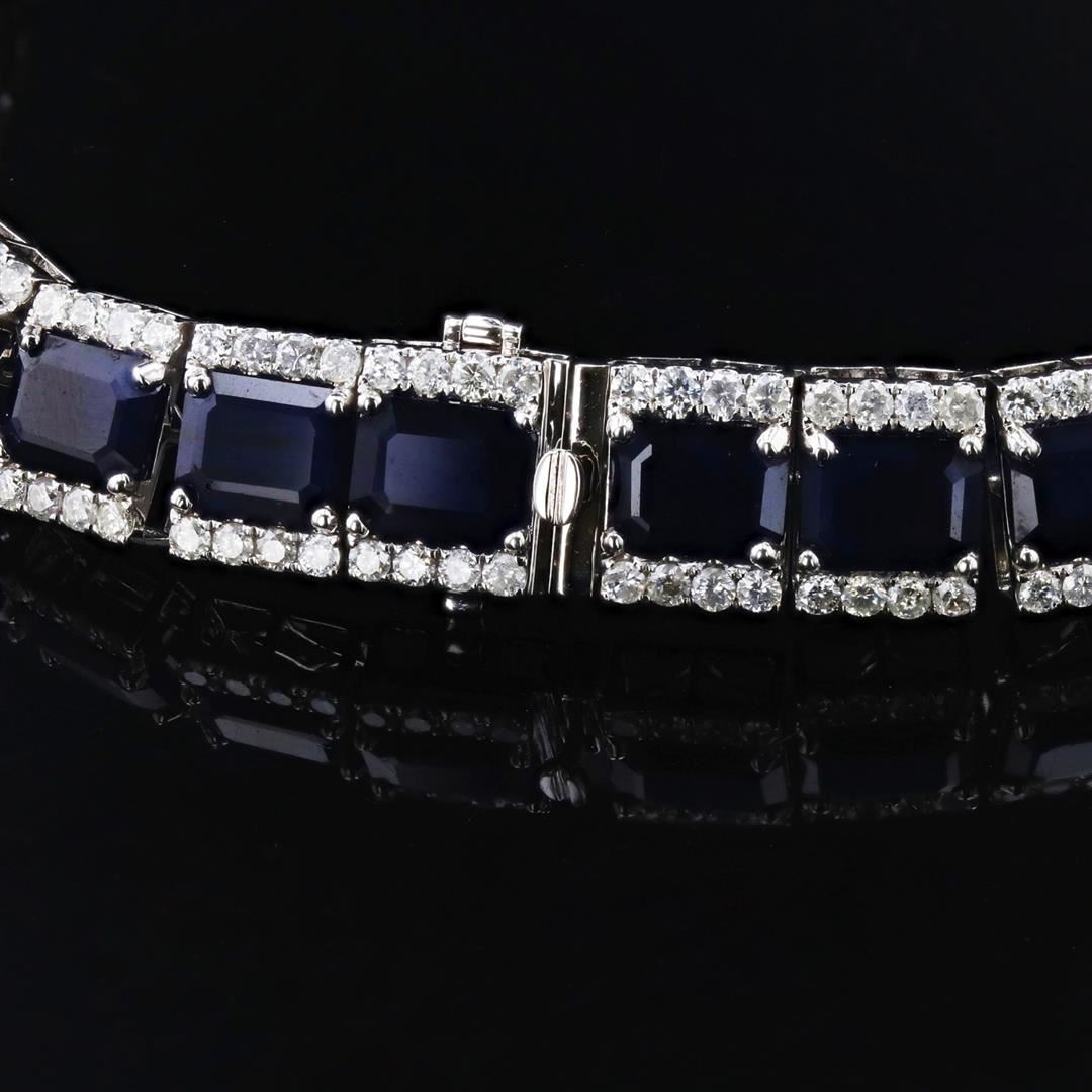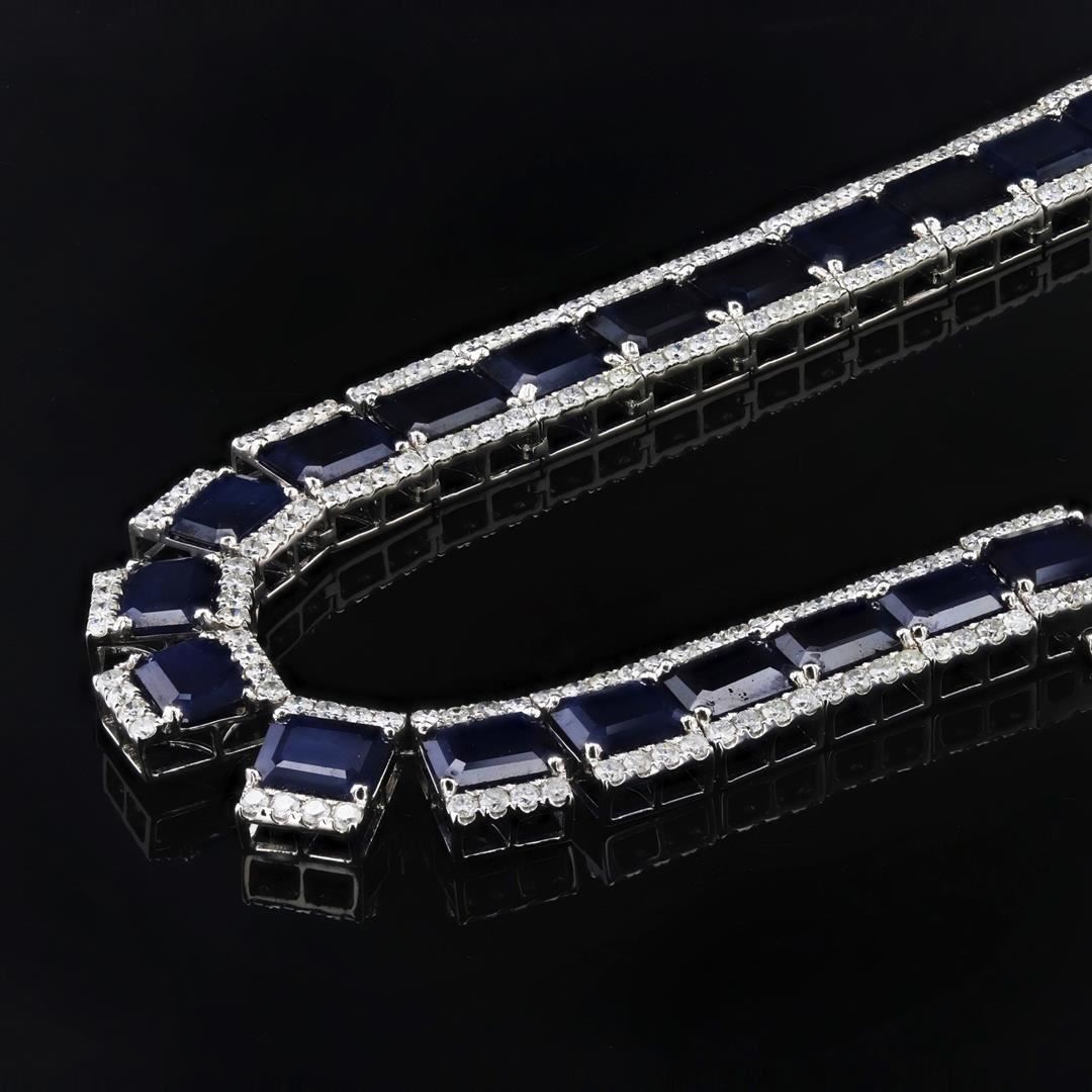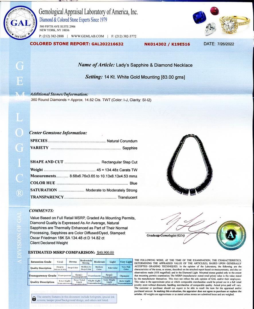 Name of Article: Lady's Sapphire & Diamond Necklace Setting: 14 Kt. White Gold Mounting [83.00 gms] Additional Stones/Information: 360 Round Diamonds = Approx. 14.82 Ct. TWT (Color: I - J, Clarity: SI to I2) Center Gemstone Information: SPECIES: Nat