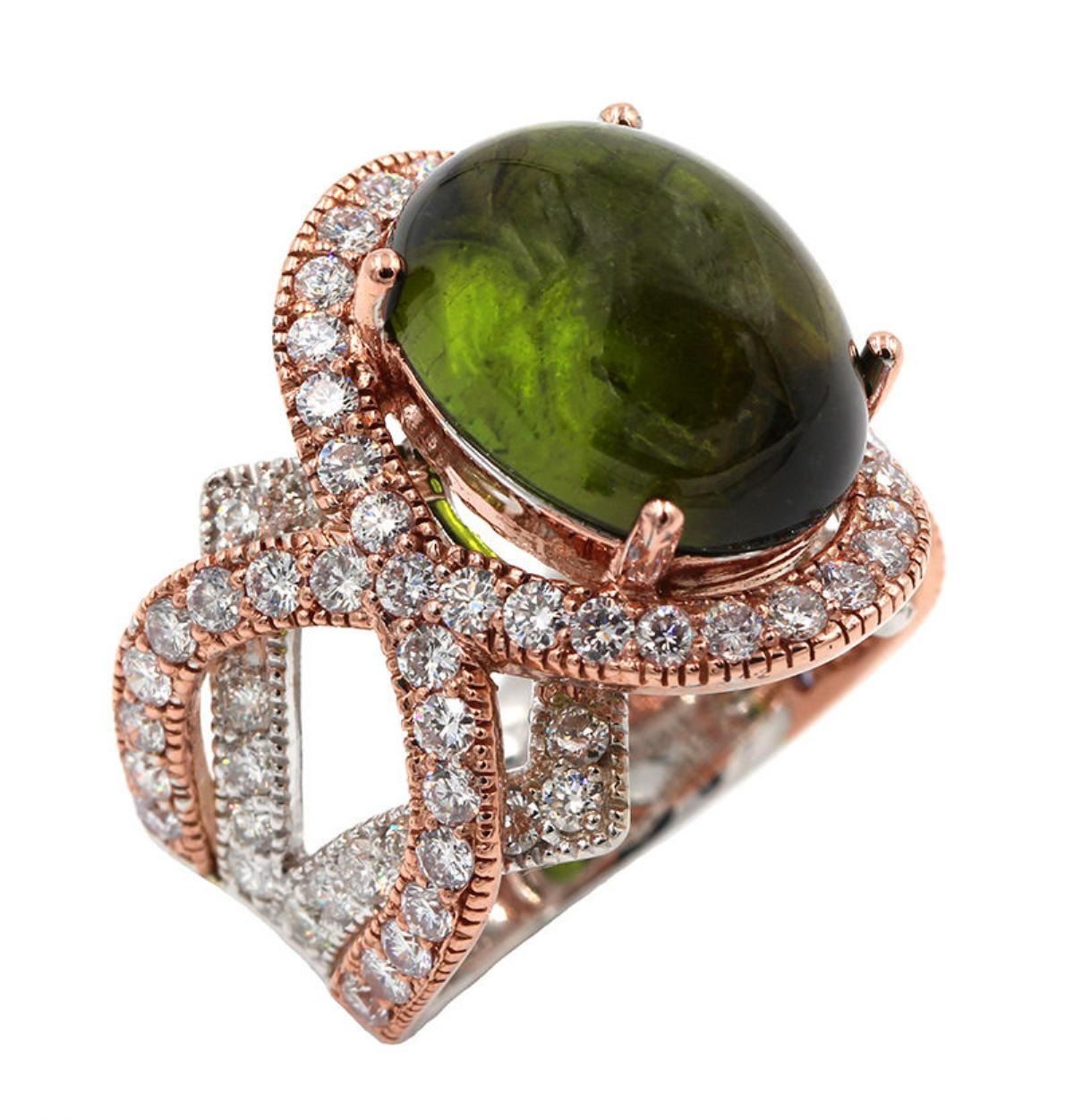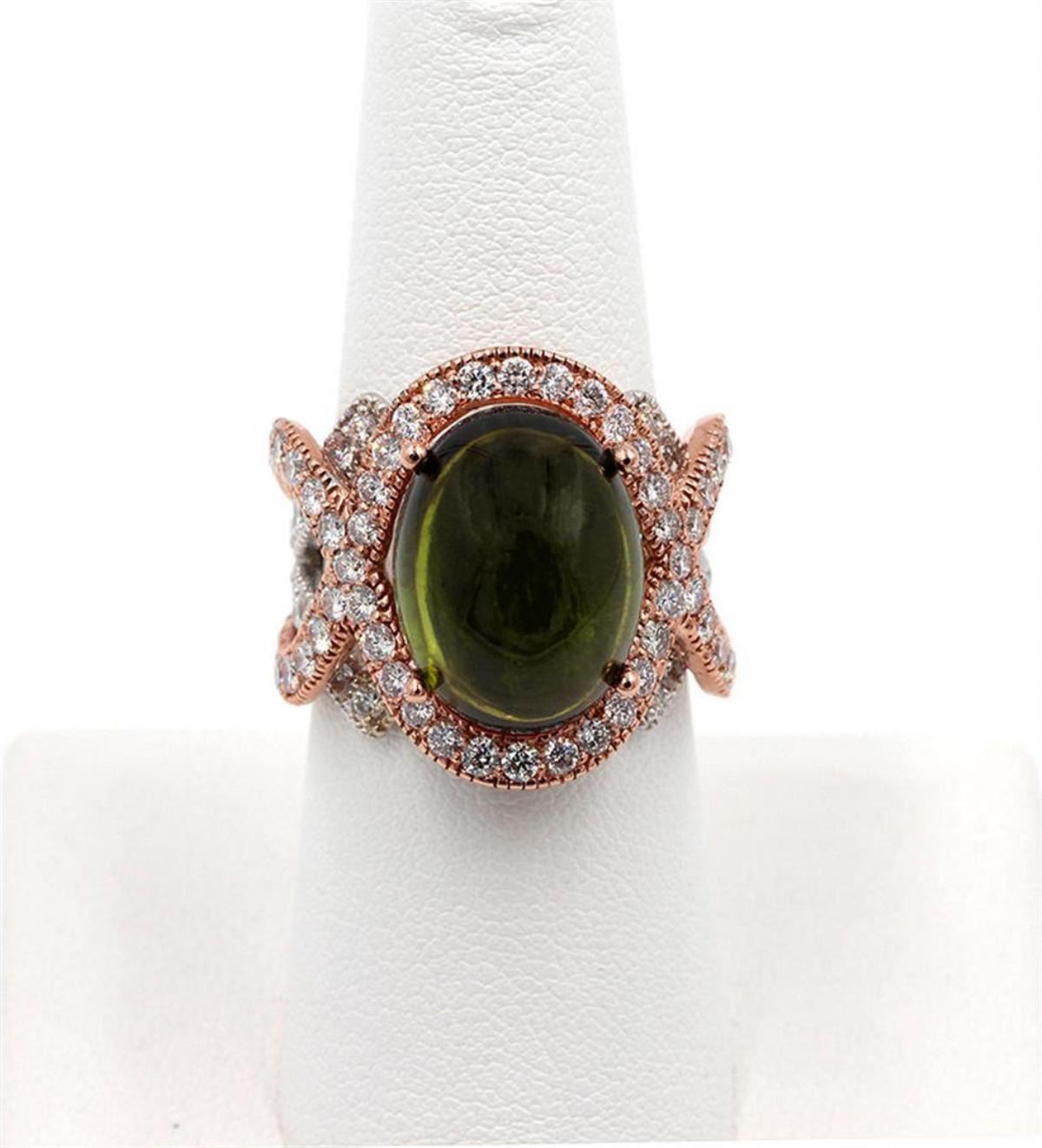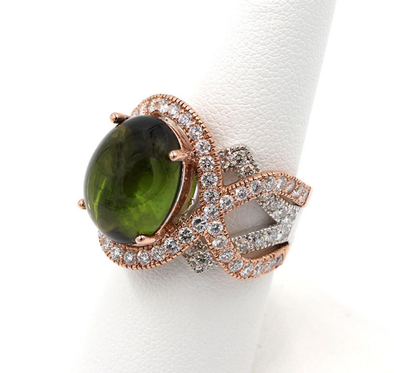 One Cass Green Tourmaline Diamond Cocktail Two-Toned Ring in 14k Rose Gold. Size 7 but is resizable. The ring design is a four crossed and four prong extravaganza style. The metal type is 14k White Gold and 14k Rose Gold (2 tone) with a total weight of 14.79 grams. The main stone is not enhanced / natural with a cabochon shape. Main stone is 11.62 carats, deep color clarity, fancy green color, with excellent cut. Side diamonds equate 2.49 total carats with G-H color. Diamond clarity is SI1, shape is round cut, and the cut is excellent on all the 24 side diamonds. Total carat weight of stones is 14.11 with an overall number of 25 diamonds. This ring is brand new. Included with independent certification with a retail value of $12,600.