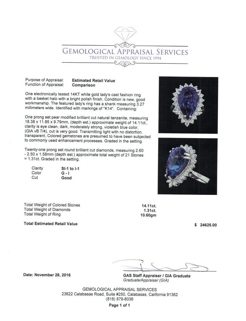 One electronically tested 14KT white gold lady's cast fashion ring with a basket halo with a bright polish finish. The featured lady's ring has a shank measuring 3.27 millimeters wide. Identified with markings of 'K14'. Condition is new, good workmanship. Containing: One prong set pear modified brilliant cut natural tanzanite, measuring 18.38 x 11.85 x 9.79mm, (depth est.) approximate weight of 14.11ct., clarity is eye clean, dark, moderately strong, violetish blue color, (GIA vB 7/4), cut is very good. Transmitting light with no distortion, transparent. Colored gemstones are presumed to have been subjected to commonly used enhancement processes. Graded in the setting. Twenty-One prong set round brilliant cut diamonds, measuring 2.60 - 2.50 x 1.58mm (depth est.) approximate total weight of 21 Stones = 1.31ct. Graded in the setting. Clarity SI-1 to I-1. Color: G - I Cut Good. Total Weight of Colored Stones 14.11ct.. Total Weight of Diamonds 1.31ct.. Total Weight of Ring 10.60gm. GAS Appraised.