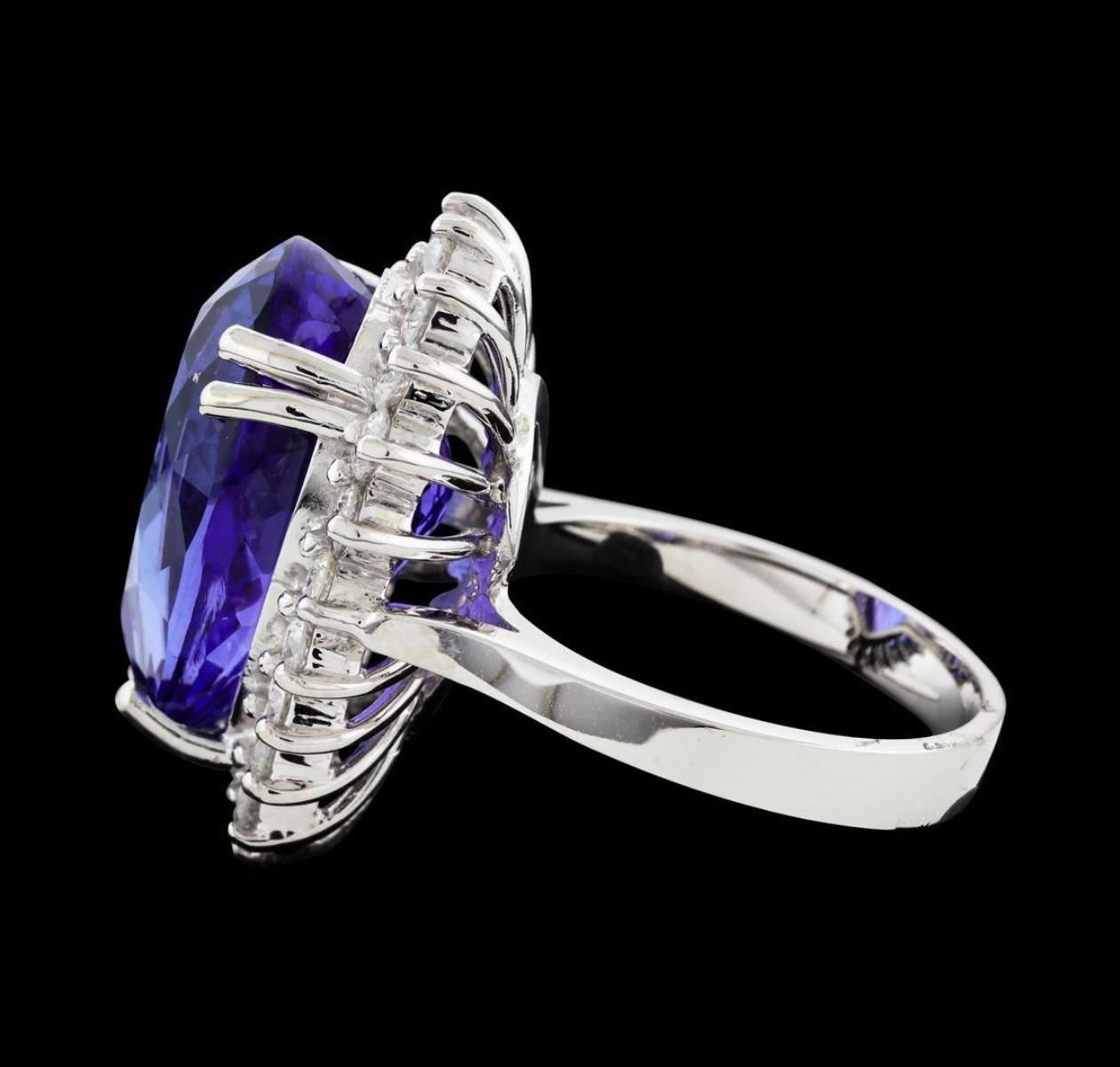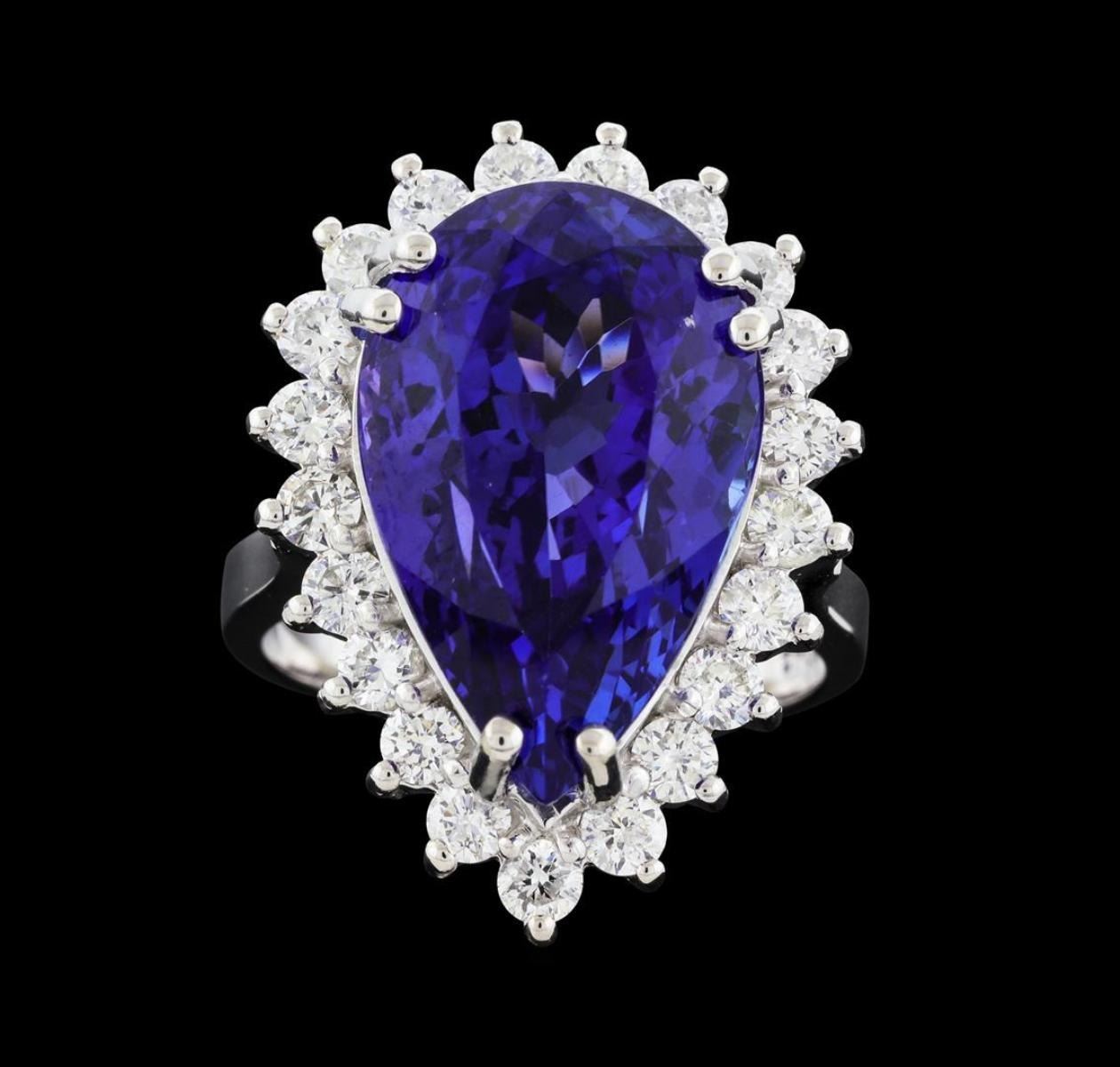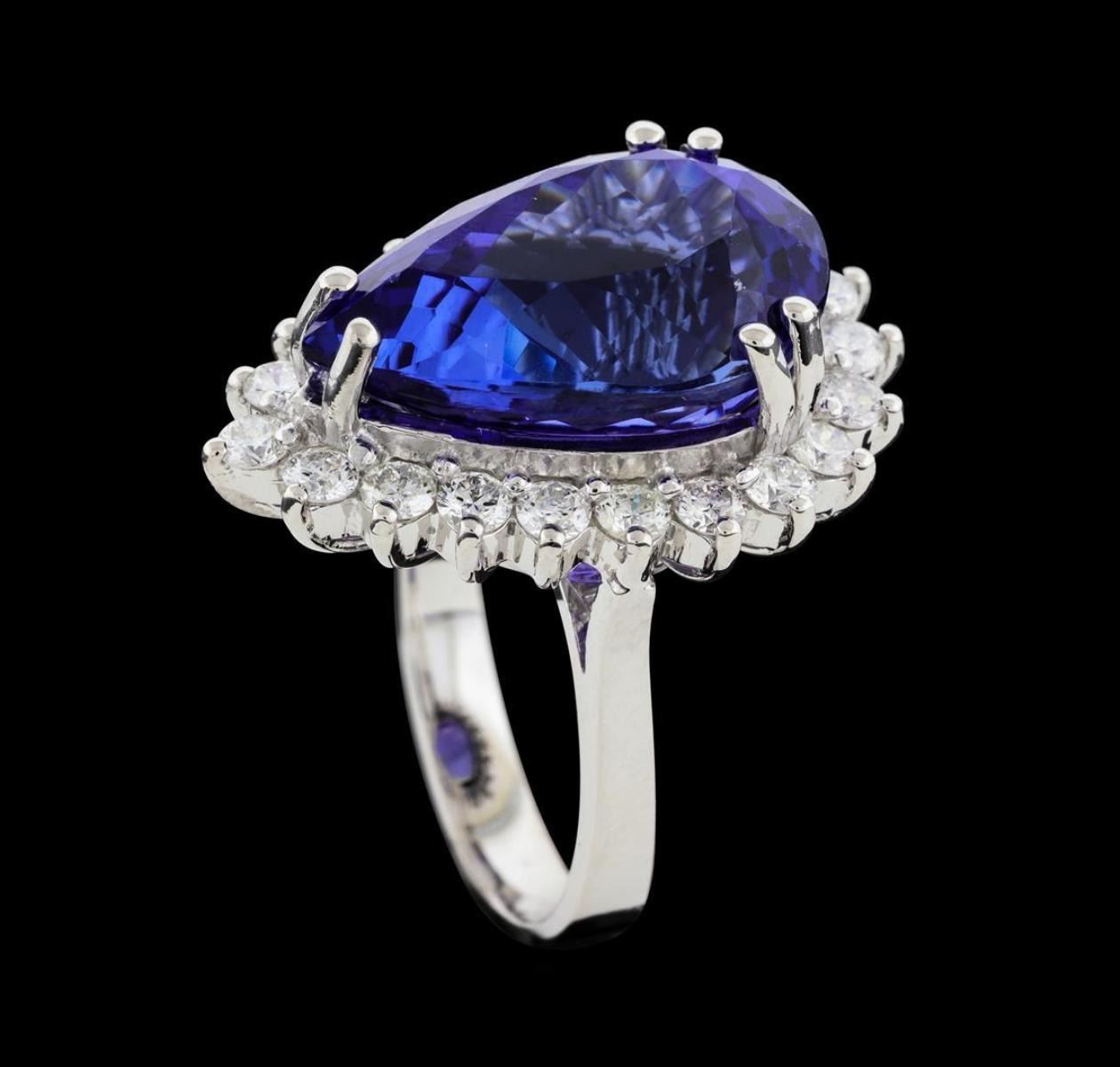 One electronically tested 14KT white gold lady's cast fashion ring with a basket halo with a bright polish finish. The featured lady's ring has a shank measuring 3.27 millimeters wide. Identified with markings of 'K14'. Condition is new, good workmanship. Containing: One prong set pear modified brilliant cut natural tanzanite, measuring 18.38 x 11.85 x 9.79mm, (depth est.) approximate weight of 14.11ct., clarity is eye clean, dark, moderately strong, violetish blue color, (GIA vB 7/4), cut is very good. Transmitting light with no distortion, transparent. Colored gemstones are presumed to have been subjected to commonly used enhancement processes. Graded in the setting. Twenty-One prong set round brilliant cut diamonds, measuring 2.60 - 2.50 x 1.58mm (depth est.) approximate total weight of 21 Stones = 1.31ct. Graded in the setting. Clarity SI-1 to I-1. Color: G - I Cut Good. Total Weight of Colored Stones 14.11ct.. Total Weight of Diamonds 1.31ct.. Total Weight of Ring 10.60gm. GAS Appraised.