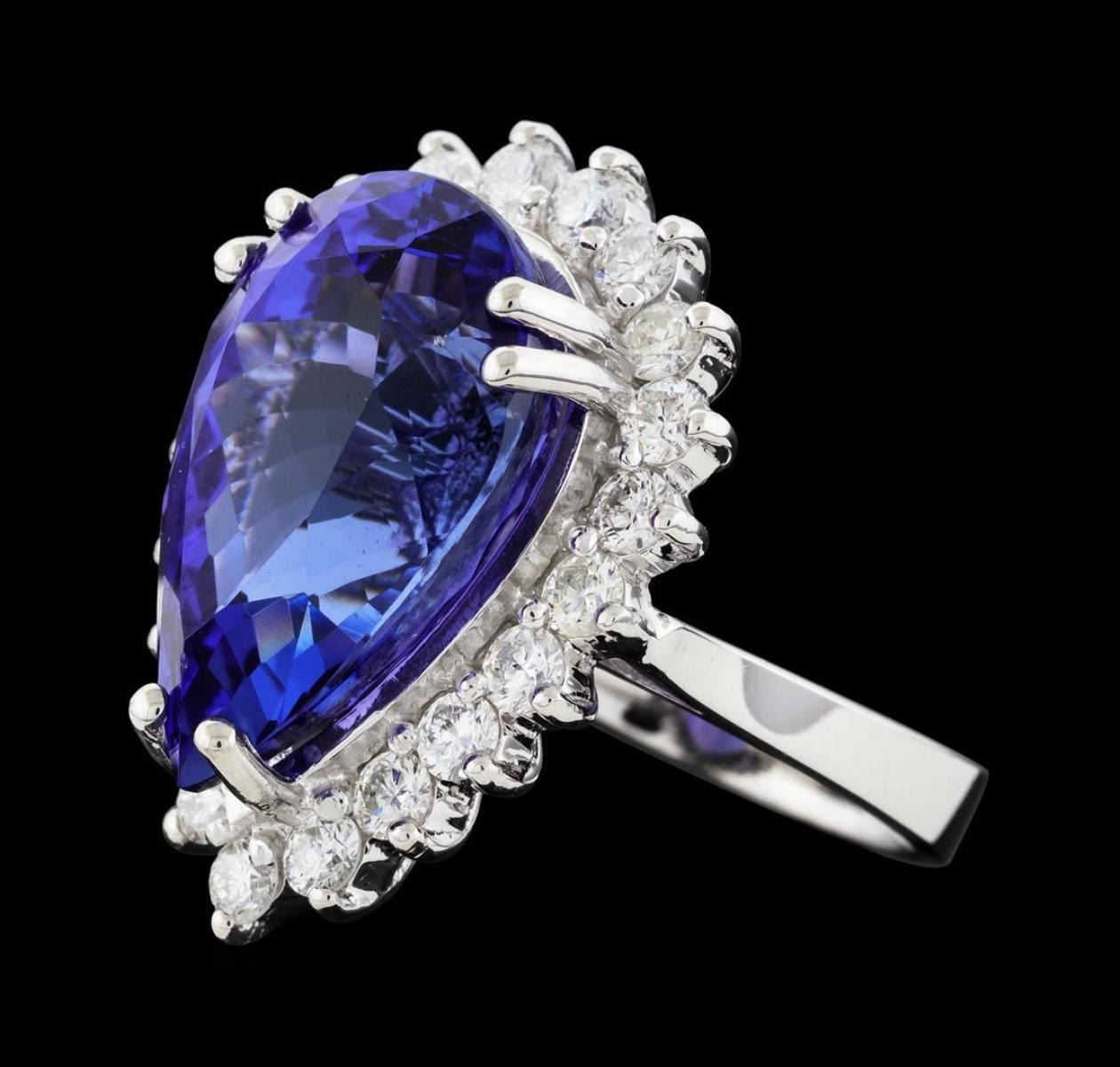 One electronically tested 14KT white gold lady's cast fashion ring with a basket halo with a bright polish finish. The featured lady's ring has a shank measuring 3.27 millimeters wide. Identified with markings of 'K14'. Condition is new, good workmanship. Containing: One prong set pear modified brilliant cut natural tanzanite, measuring 18.38 x 11.85 x 9.79mm, (depth est.) approximate weight of 14.11ct., clarity is eye clean, dark, moderately strong, violetish blue color, (GIA vB 7/4), cut is very good. Transmitting light with no distortion, transparent. Colored gemstones are presumed to have been subjected to commonly used enhancement processes. Graded in the setting. Twenty-One prong set round brilliant cut diamonds, measuring 2.60 - 2.50 x 1.58mm (depth est.) approximate total weight of 21 Stones = 1.31ct. Graded in the setting. Clarity SI-1 to I-1. Color: G - I Cut Good. Total Weight of Colored Stones 14.11ct.. Total Weight of Diamonds 1.31ct.. Total Weight of Ring 10.60gm. GAS Appraised.