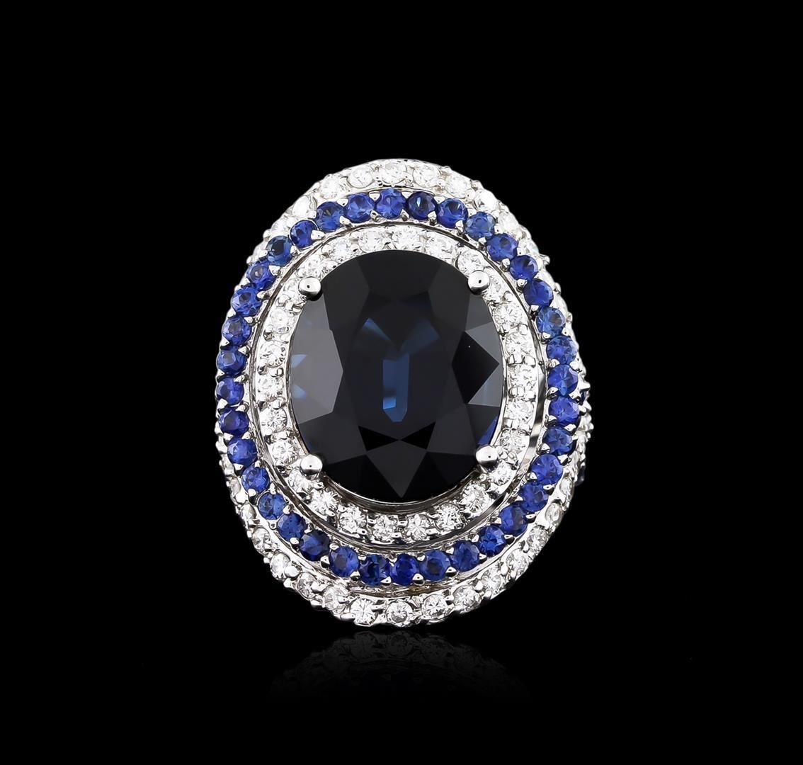 One electronically tested 18KT white gold ladies cast sapphire and diamond ring with a bright polish finish. The featured sapphire is set within tiered sapphire and diamond bezels supported by elaborate sapphire and diamond set three-way split shoulders, completed by a three and one-half millimeter wide band. Identified with markings of "18K". Condition is new, good workmanship. Containing: One prong set oval mixed cut natural blue sapphire, measuring 14.80 x 12.41 x 7.71mm, 6% bulge factor, approximate weight of 12.28ct., clarity is eye clean, type II, dark, very slightly grayish, blue color, (GIA B 7/3), cut is good. Transmitting light with no distortion, transparent. No indications of heating. GIA Gemological Report attached. Graded in the GIA Laboratory, Report #2161929026.Sixty-six prong set round mixed cut natural blue sapphires, measuring 1.90 - 1.80 x 1.20 mm, approximate total weight of 1.93ct., clarity is eye clean, type II, medium dark, moderately strong, violetish blue color, (GIA vB 6/4), cut is good. Transmitting light with no distortion, transparent. Color grade is an average for the group. Graded in the setting. Seventy-Two prong set round brilliant cut diamonds, measuring 1.70 - 1.60 x 0.99mm (depth est.) approximate total weight of 72 Stones = 1.34ct. Graded in the setting. Clarity: VS-1 to VS-2. Color: G - I. Total Weight of Colored Stones 14.21ct. Total Weight of Diamonds 1.34ct. Total Weight of Ring 17.09 grams. AIG Appraised.