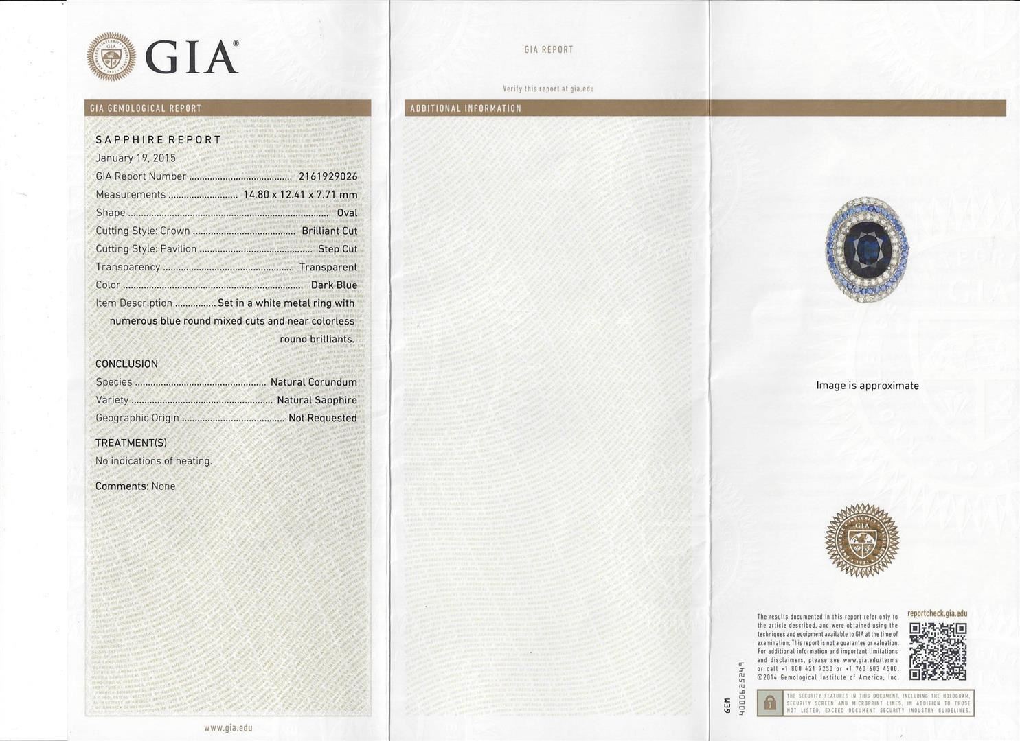 One electronically tested 18KT white gold ladies cast sapphire and diamond ring with a bright polish finish. The featured sapphire is set within tiered sapphire and diamond bezels supported by elaborate sapphire and diamond set three-way split shoulders, completed by a three and one-half millimeter wide band. Identified with markings of "18K". Condition is new, good workmanship. Containing: One prong set oval mixed cut natural blue sapphire, measuring 14.80 x 12.41 x 7.71mm, 6% bulge factor, approximate weight of 12.28ct., clarity is eye clean, type II, dark, very slightly grayish, blue color, (GIA B 7/3), cut is good. Transmitting light with no distortion, transparent. No indications of heating. GIA Gemological Report attached. Graded in the GIA Laboratory, Report #2161929026.Sixty-six prong set round mixed cut natural blue sapphires, measuring 1.90 - 1.80 x 1.20 mm, approximate total weight of 1.93ct., clarity is eye clean, type II, medium dark, moderately strong, violetish blue color, (GIA vB 6/4), cut is good. Transmitting light with no distortion, transparent. Color grade is an average for the group. Graded in the setting. Seventy-Two prong set round brilliant cut diamonds, measuring 1.70 - 1.60 x 0.99mm (depth est.) approximate total weight of 72 Stones = 1.34ct. Graded in the setting. Clarity: VS-1 to VS-2. Color: G - I. Total Weight of Colored Stones 14.21ct. Total Weight of Diamonds 1.34ct. Total Weight of Ring 17.09 grams. AIG Appraised.