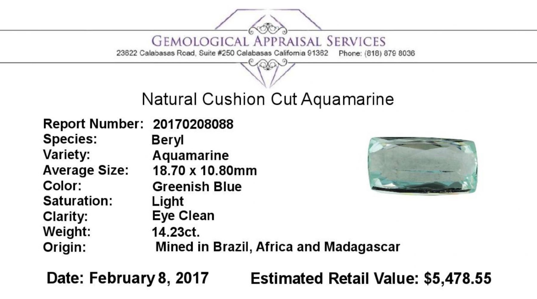 One natural cushion cut aquamarine with an exact weight of 14.23ct., clarity is eye clean, greenish blue, light. Gemological Appraisals Services estimates the retail value at $5478.55 GAS Appraised.