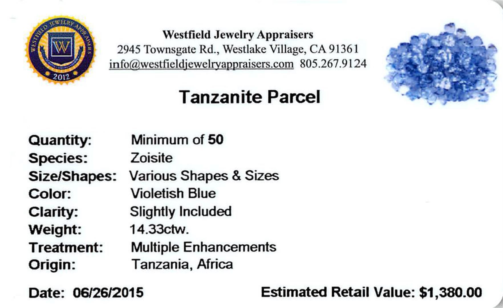 _x000D_Fifty round mixed cut natural tanzanites, measuring 3.00 - 3.00 x 1.95 mm, exact total weight 14.33ct., clarity is slightly included, type I, medium, very slightly grayish, violetish blue color, (GIA vB 5/3), cut is good. Measurements & the color grade are an average for the group, Color grade is an average for the group, Transmitting light with no distortion, transparent, Naturally occurring internal & external characteristics are present, Indications of multiple laboratory enhancements, including high temperature heat treatment. Westfield Appraised.