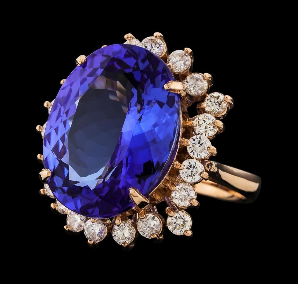 One electronically tested 14KT rose gold lady's cast fashion ring with a staggered basket halo with a bright polish finish. The featured lady's ring has a shank measuring 2.85 millimeters wide. Identified with markings of 'K14'. Condition is new, good workmanship. Containing: One prong set oval modified brilliant cut natural tanzanite, measuring 18.30 x 13.90 x 7.80mm, (depth est.) 5%. bulge factor, approximate weight of 14.54ct., clarity is eye clean, medium, moderately strong, violetish blue color, (GIA vB 5/4), cut is very good. Transmitting light with no distortion, transparent. Colored gemstones are presumed to have been subjected to commonly used enhancement processes. Graded in the setting. Twenty-Two prong set round brilliant cut diamonds, measuring 2.50 - 2.40 x 1.52mm (depth est.) approximate total weight of 22 Stones = 1.22ct. Graded in the setting. Clarity SI-1 to I-1. Color: G - H Cut Good. Total Weight of Colored Stones 14.54ct.. Total Weight of Diamonds 1.22ct.. Total Weight of Ring 9.40gm. GAS Appraised.