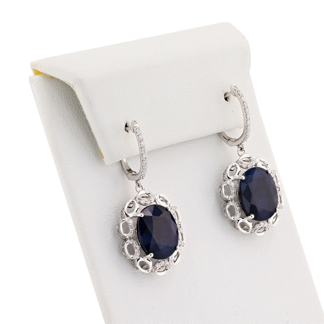 ONE 14K WHITE GOLD STAMPED LADIE'S CUSTOM MADE DIAMOND AND BLUE SAPPHIRE EARRINGS. 7.80 GR TW. MAIN CENTER GEMSTONE(S): IDENTITY: TWO CENTER COUNTS BLUE SAPPHIRE SET IN PRONGS SETTING STYLE. CARAT WEIGHT: 14.80 CTS. SHAPE AND MEASUREMEMT: OVAL SHAPE. APPROX 12.72 X 10.88 MM. QUALITY: ENHANCED AND "DIFFUSED" QUALITY BLUE SAPPHIRE. PERMANENT TREATEMENT. 2 - ADJACENT GEMSTONES: IDENTITY: NATURAL DIAMONDS. SHAPE: ROUND BRILLIANT CUT. CARAT WEIGHT: 0.46 CT. QUALITY: H-I COLOR, I-1 to I-2 CLARITY. ALL FINE CUTTING AND PROPORTIONS. ALL PRONGS SETTINGS STYLE. TOTAL GEMSTONES WEIGHT: 15.26 CTS TW.