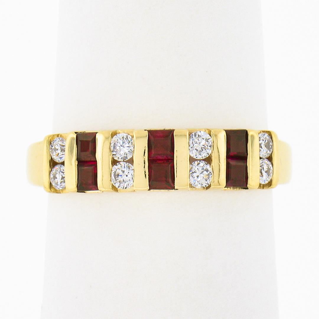 A solid 14k yellow gold band ring, alternated 6 square step cut natural runbies (0.30ctw ), and 8 round cut natural diamonds (F/G - VS1/VS2 ; 0.24ctw). The ring is size 5.5, weighs a total of 2.85 grams, and measures 4.45mm wide.