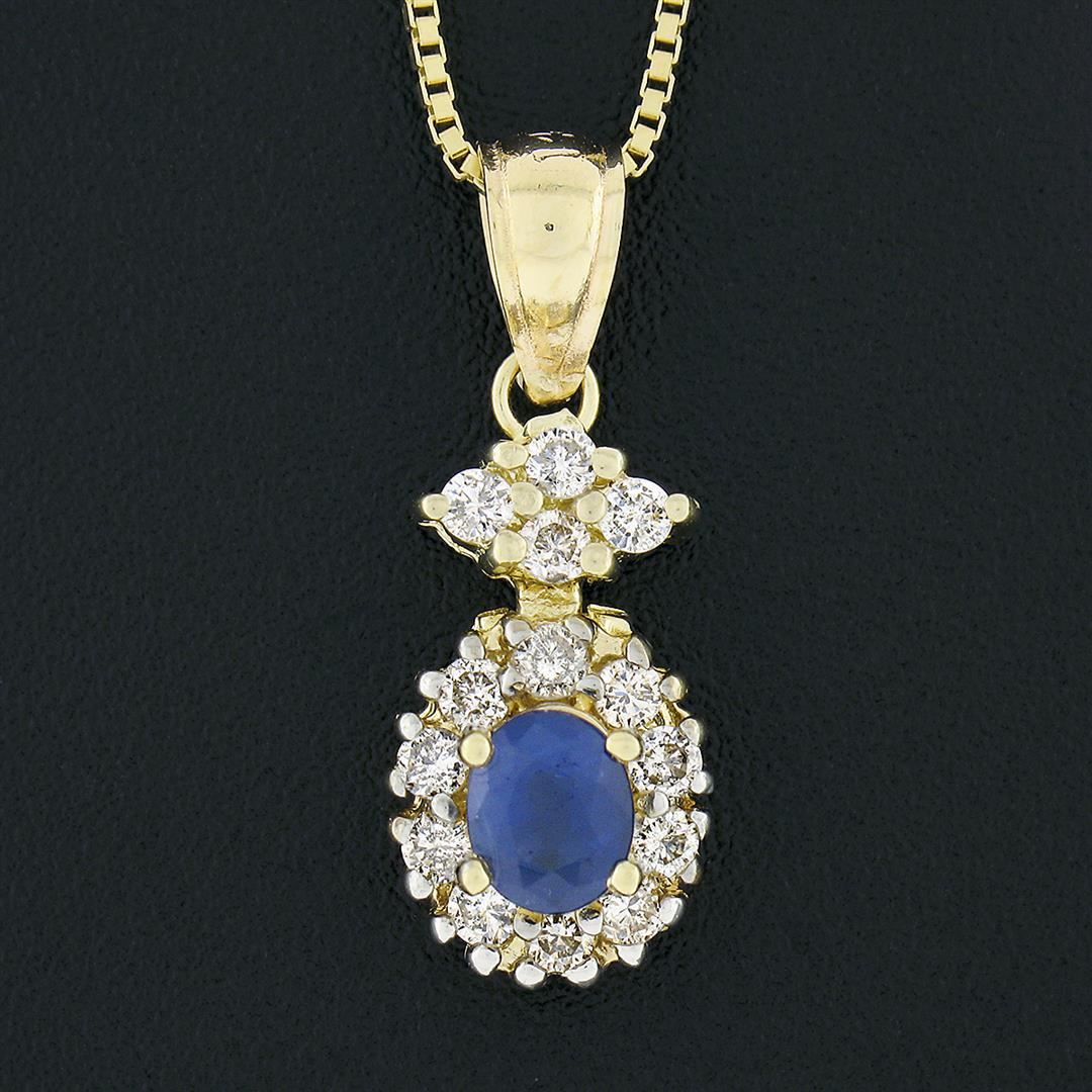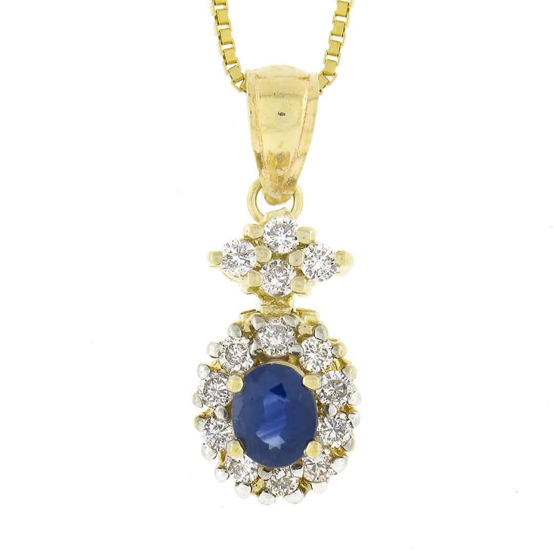 A solid 14k yellow gold pendant necklace, with 1 oval brilliant cut natural blue sapphire (0.40ctw), surrounded with 14 round brilliant cut natural diamonds (H/I - SI2/I1 ; 0.45ctw). The pendant weighs a total of 4.27 grams, measures 21.0x8.20mm including