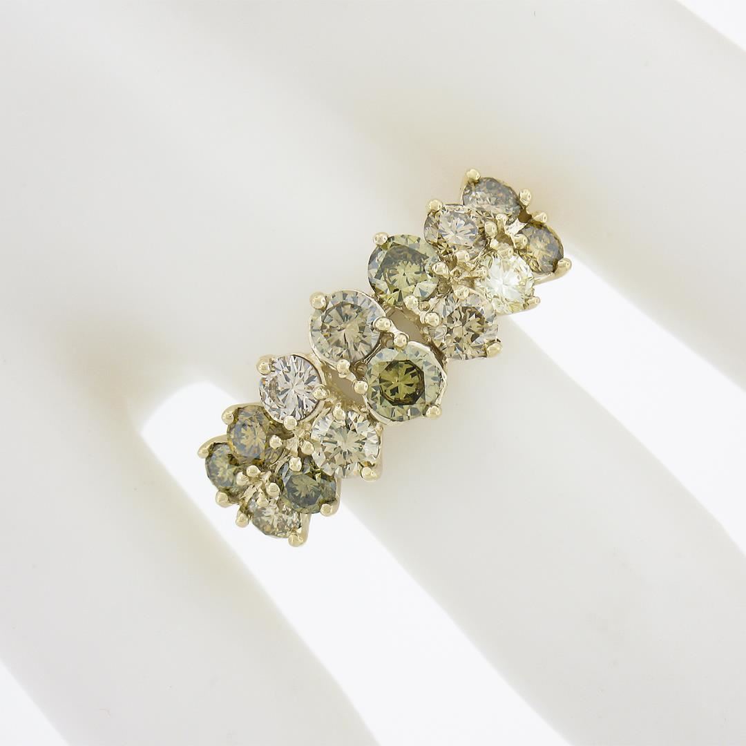 A solid 14k yellow gold 2 row band ring, with 14 round cut fancy colors natural diamonds (VS2-SI2 ; 2.24ctw). The ring is size 6.5, weighs a total of 4.47 grams, and measures 9.2mm wide.