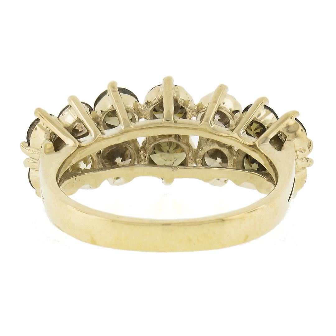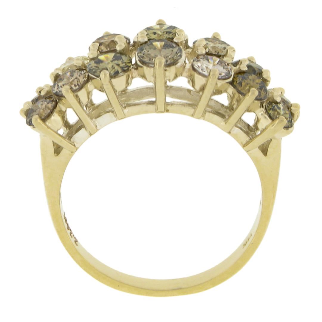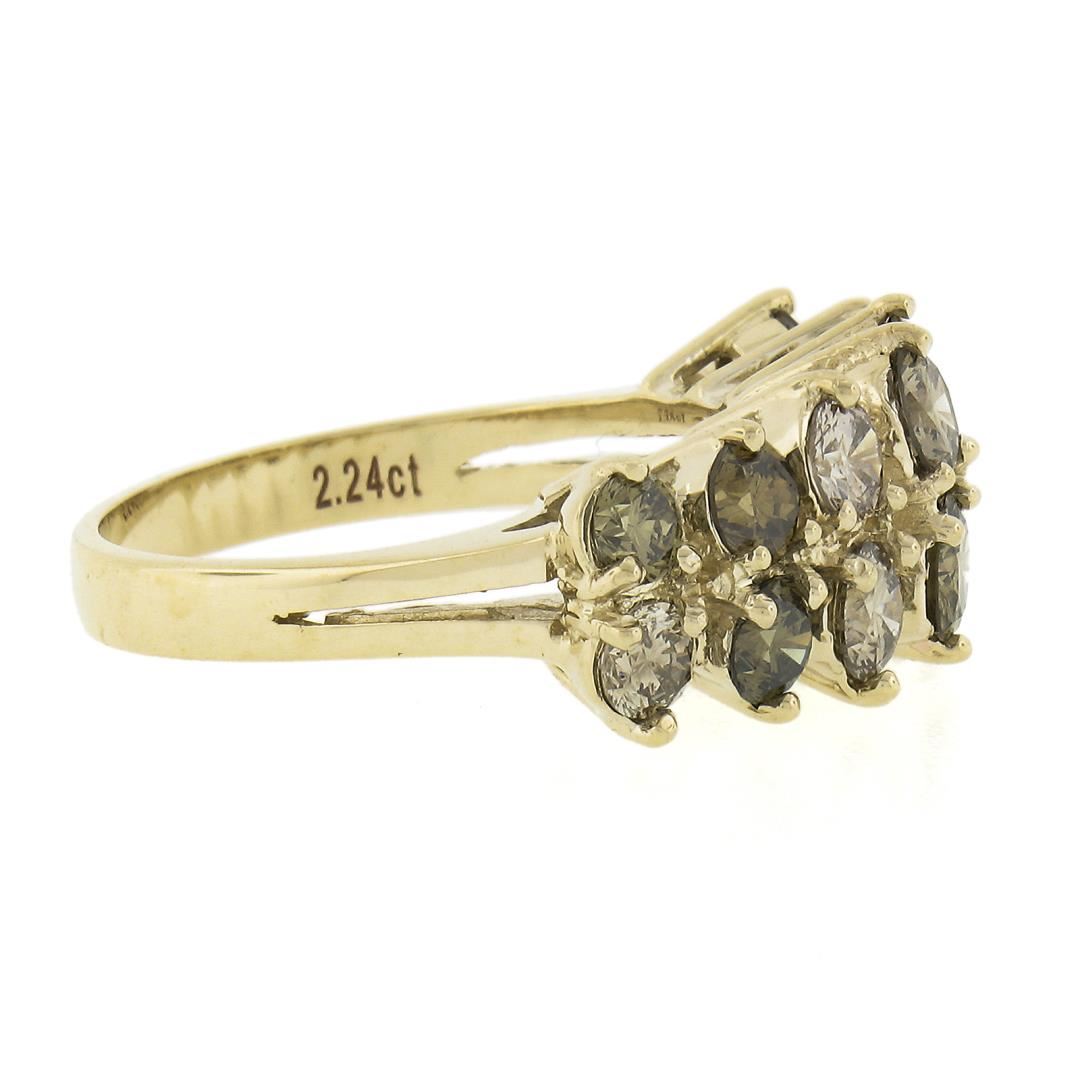 A solid 14k yellow gold 2 row band ring, with 14 round cut fancy colors natural diamonds (VS2-SI2 ; 2.24ctw). The ring is size 6.5, weighs a total of 4.47 grams, and measures 9.2mm wide.