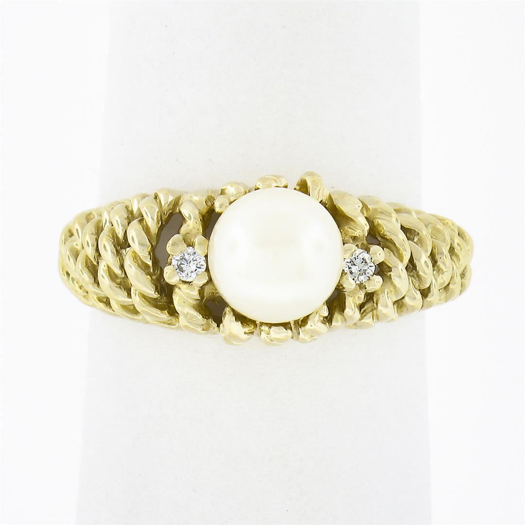 A solid 14k yellow gold ring, with 1 round shape cultured pearl (6.3mm), and 2 round brilliant cut natural diamonds (G/H - VS2/SI1 ; 0.04ctw). The ring is size 6.0, weighs a total of 4.66 grams, and measures 8.10mm wide.