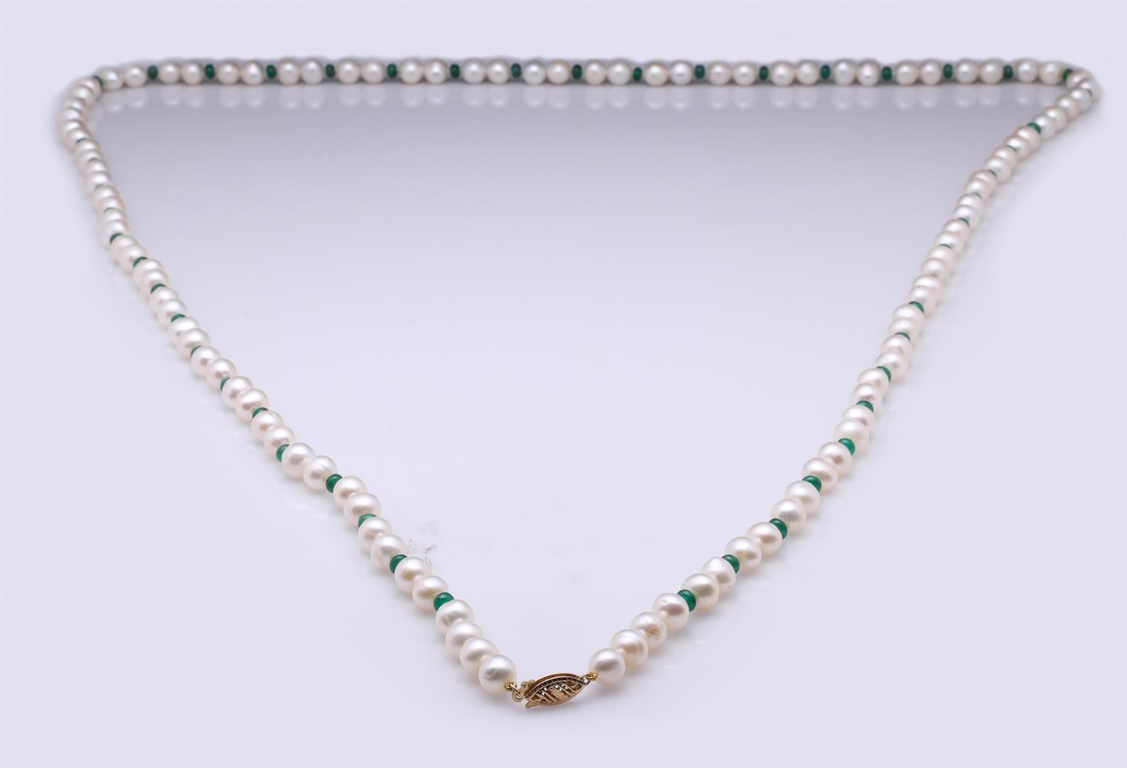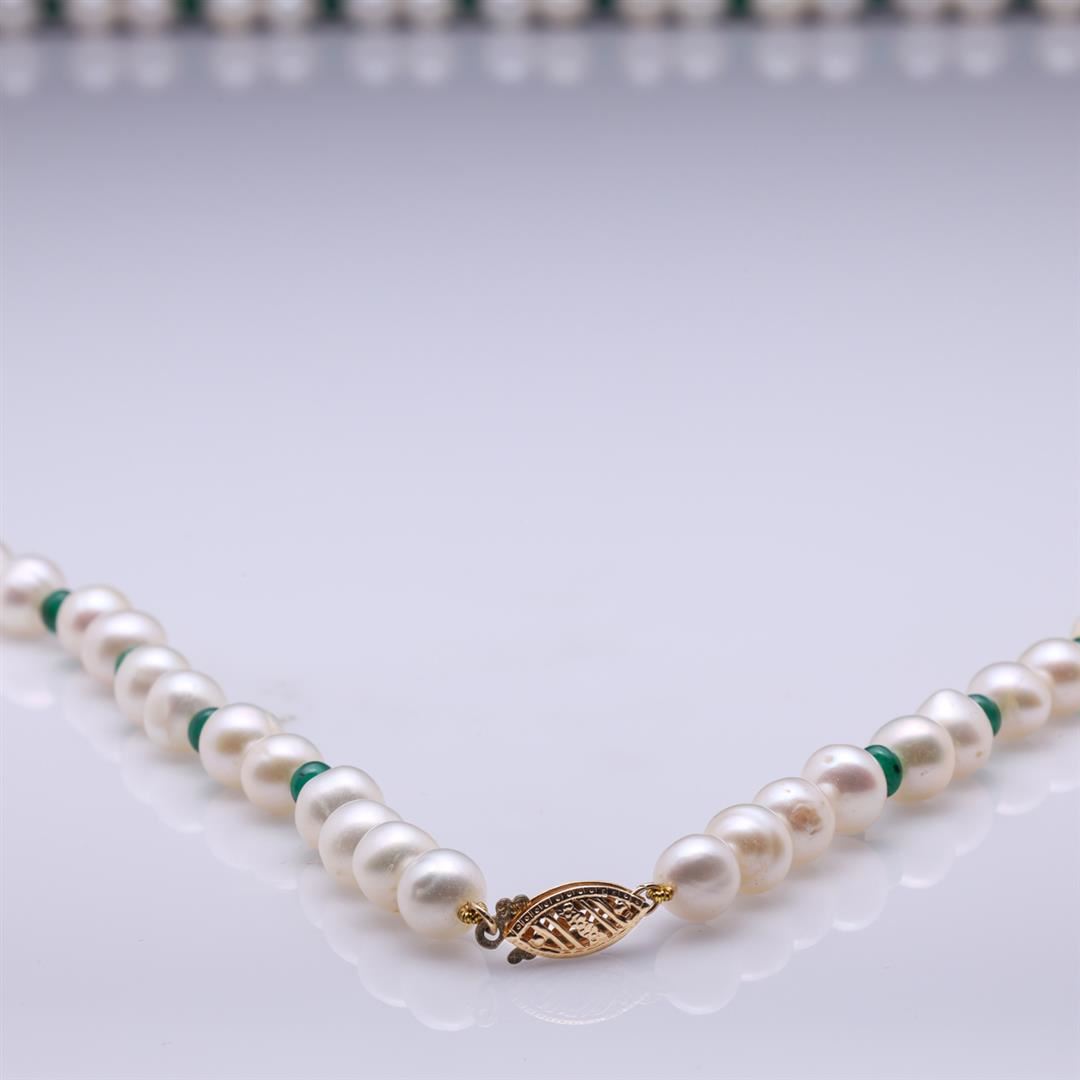 Pearl & Emerald Necklace with a 14K Yellow Gold Clasp measuring 39 inches in length. Total weight of 65.5 gm. Estimated retail value $1,500.