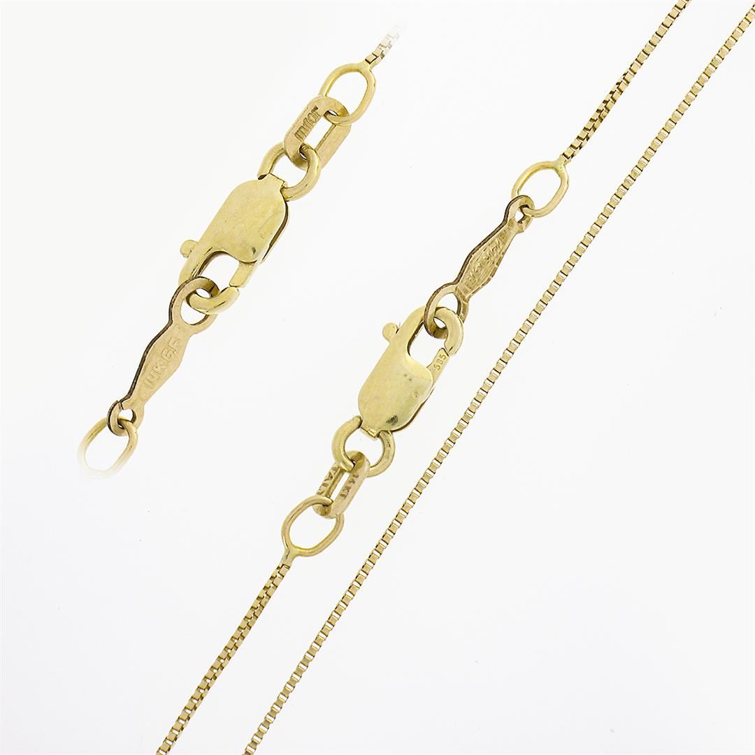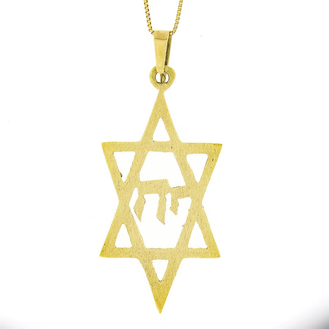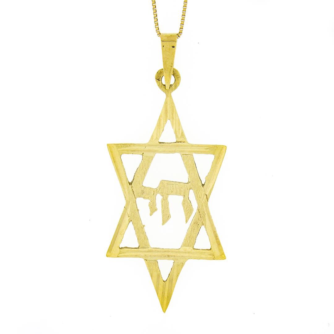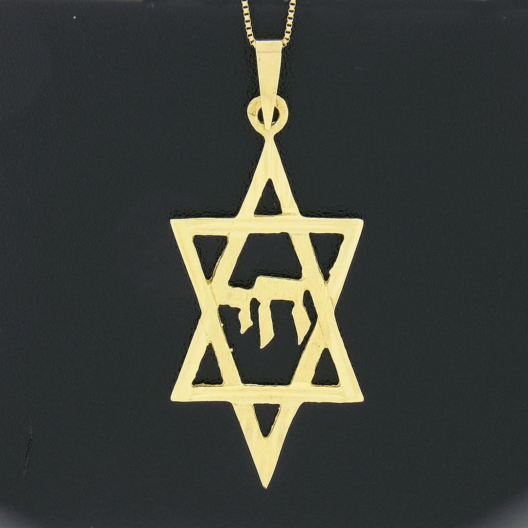 A solid 14k yellow gold reversible star of david pendant necklace. 24 inch box link chain, 3.54 grams total weight, pendant measures 43.0x18.45mm.