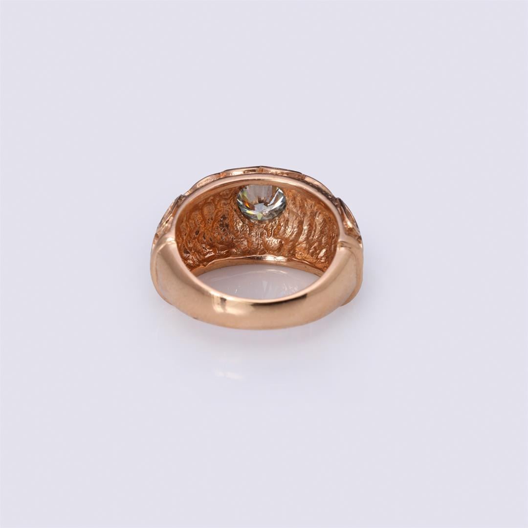 14k rose gold ring; the exterior of the ring deeply engraved with designs in high relief and set with round cut moissanite with a hint of light blue coloring, marked 14k to interior; gross weight 8.1 g, size 6 3/4