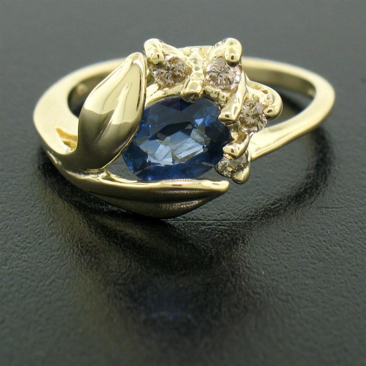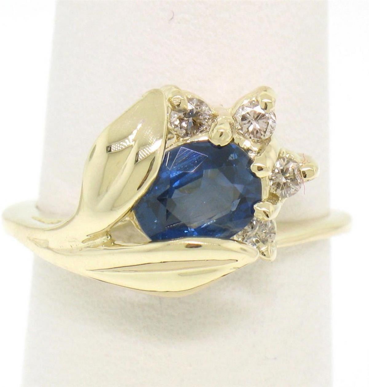 One 14K Solid Yellow Gold 1.14Ctw Oval Sapphire Blooming Flower Ring w/ Round Diamond Accents. Item Details: Material: 14K Solid Yellow Gold, Weight: 3.1 Grams, Stone(s): (1) Natural Genuine Sapphire - Oval Cut - Prong Set - Medium Royal Blue Color - 1.00ct (approx.), (4) Natural Genuine Diamonds - Round Brilliant Cut - Prong Set - I Color - VS2 Clarity - 0.14ctw (approx.), Total Carat Weight: 1.14 (approx.), Ring Size: 5.0 (We can custom size this ring.), Ring Width: 10.54mm, Ring Height: 7.60mm rise off the finger, Condition: Like New!