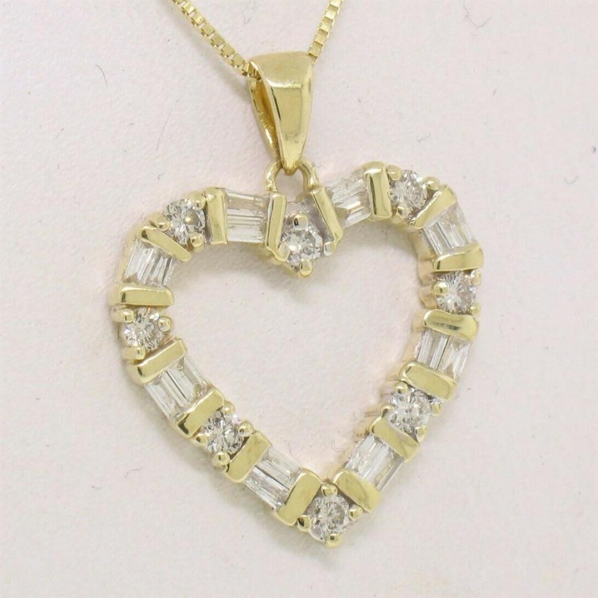 One 14K Yellow Gold 0.70ctw Round & Baguette Cut Diamond Open Heart Pendant Necklace. Item Details: Material: 14K Solid Yellow Gold, Weight: 3.20 Grams , Stone: (8) Natural Genuine Diamonds - Round Brilliant Cut - G Color - SI1 Clarity - 0.20ctw (approx.), (16) Natural Genuine Diamonds - Baguette Cut - G Color - SI1 Clarity - 0.50ctw (approx.), Dimensions: 16.94x16.41mm, Chain: 17.5" - 14K Solid Yellow Gold 1.0mm Box Link Chain, Condition: Like New,