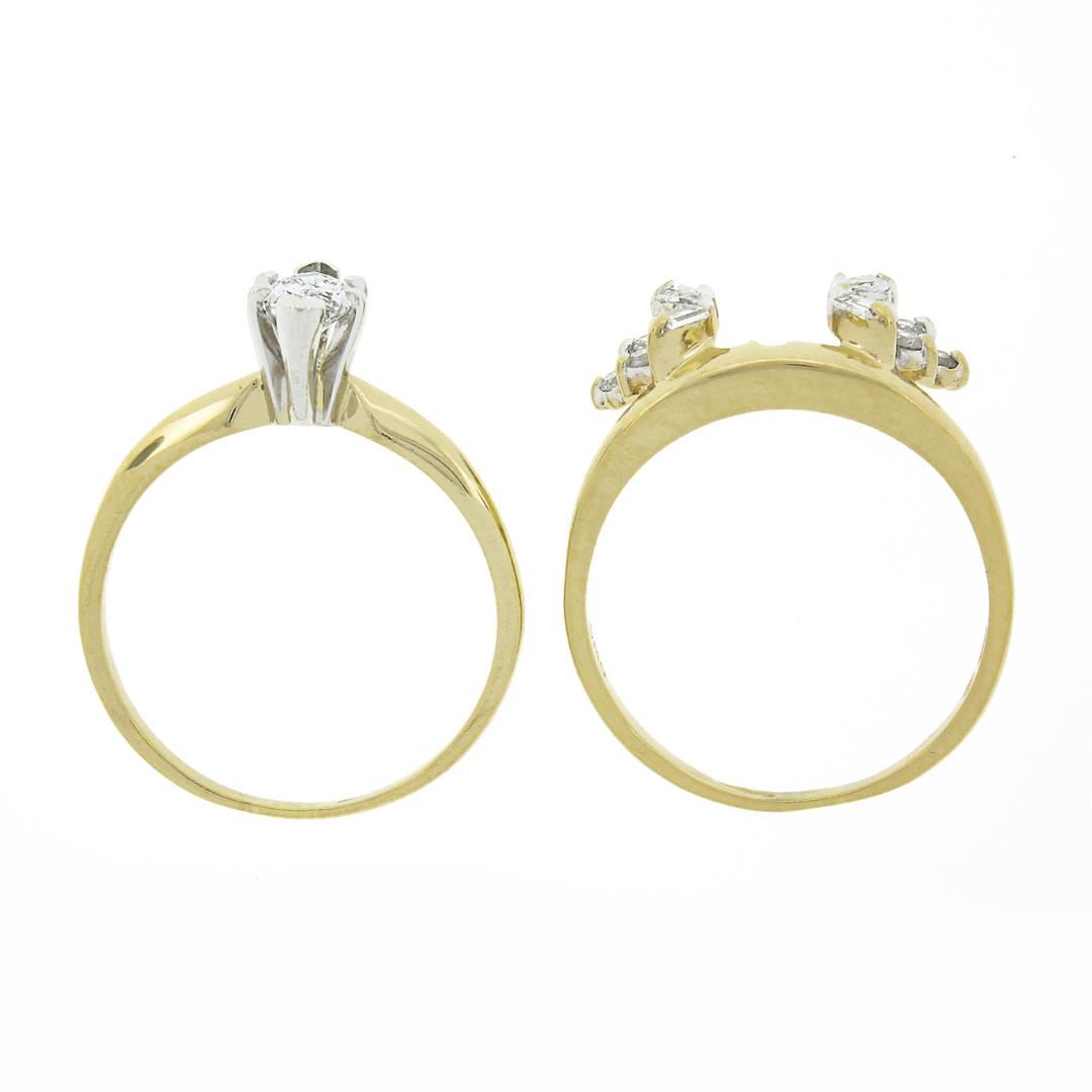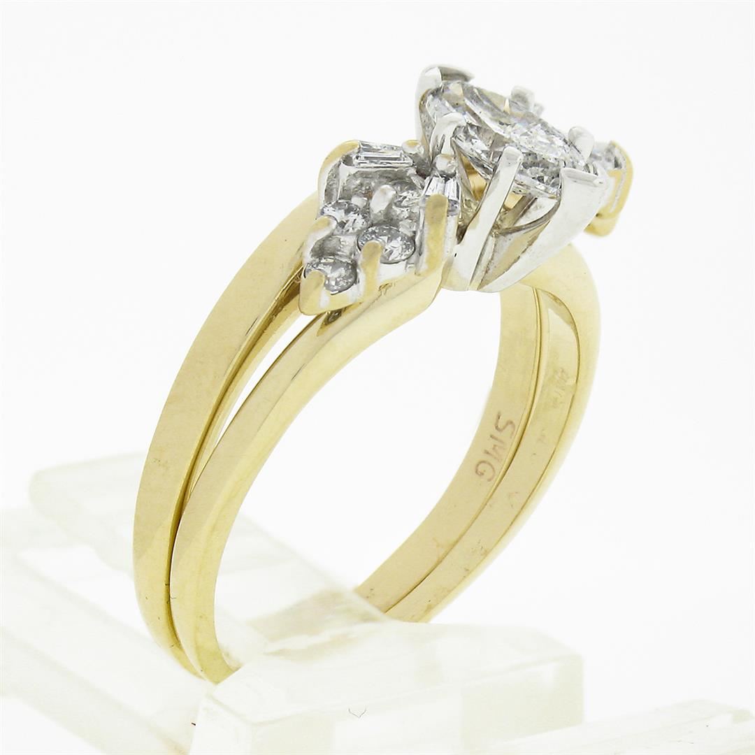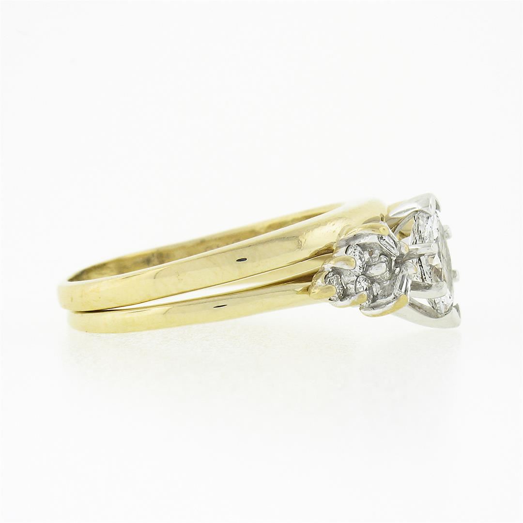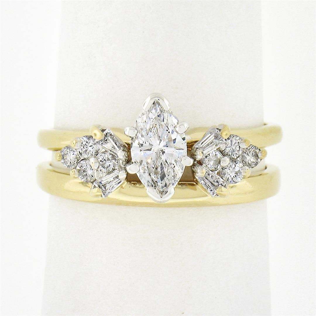 A solid 14k yellow & white gold engagement wedding ring set. with 1 marquise cut natural diamond (G - SI2 ; 4.1x7.25mm - 0.40ct), and 8 round brilliant cut natural diamonds ( G/H - SI1/SI2 ; 0.20ctw), with 4 baguette cut natural diamonds ( G/H - VS2/SI1 ; 0.10ctw). The ring is size 6.0, weighs a total of 4.18 grams, and measures 8.10mm wide.