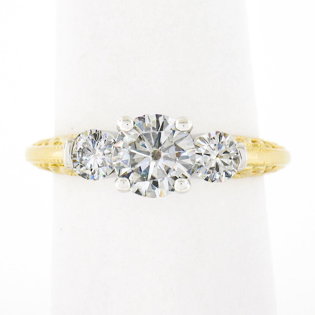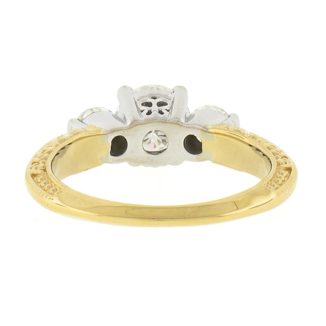 A solid 14k yellow & white gold ring, with 4 round cut synthetic moissanites. The ring is size 7.0, weighs a total of 4.81 grams, and measures 6.6mm wide.