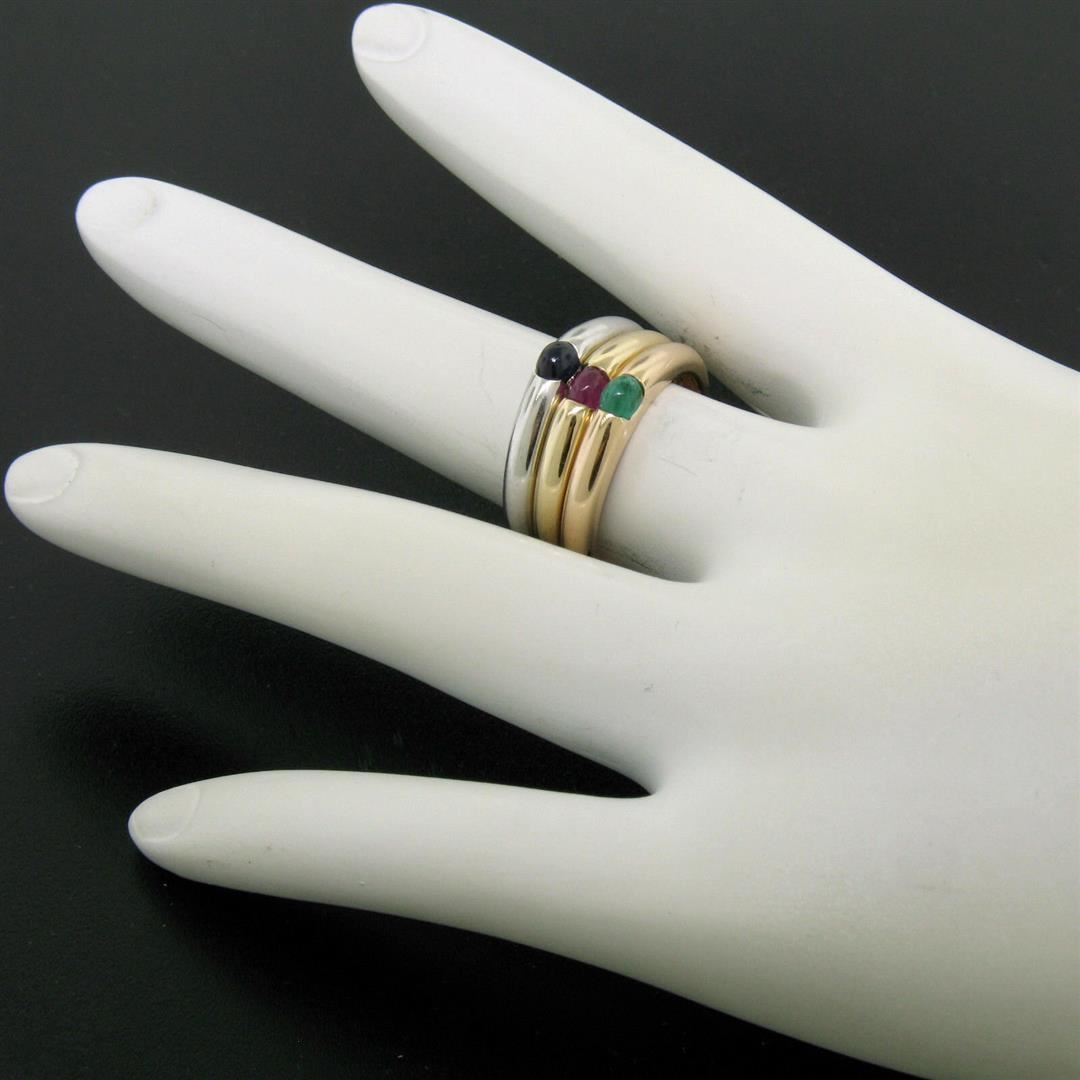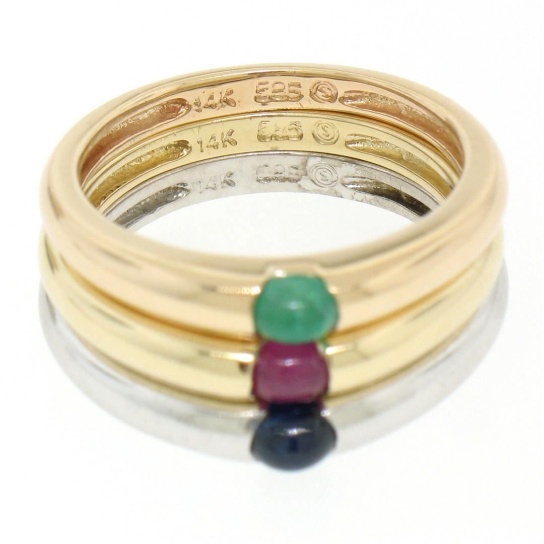 One 14K Tri-Color Gold 3 Stackable Tension Set Emerald Sapphire Ruby Solitaire Rings. Item Details: Material: Solid 14K White, Yellow, and Rose Gold, Weight: 7.4 Grams (all together), Stone(s): (1) Natural Genuine Emerald - Cabochon Cut - Tension Set - Green Color - 0.20ct (approx.), (1) Natural Genuine Ruby - Cabochon Cut - Tension Set - Red Color - 0.30ct (approx.), (1) Natural Genuine Sapphire - Cabochon Cut - Tension Set - Blue Color - 0.30ct (approx.), Total Carat Weight: 0.80 (approx.), Ring Size: 6.5, Ring Width: 3.10mm (each), 9.5 (all together). Ring Height: 4.25mm rise off the finger. Condition: Like New!