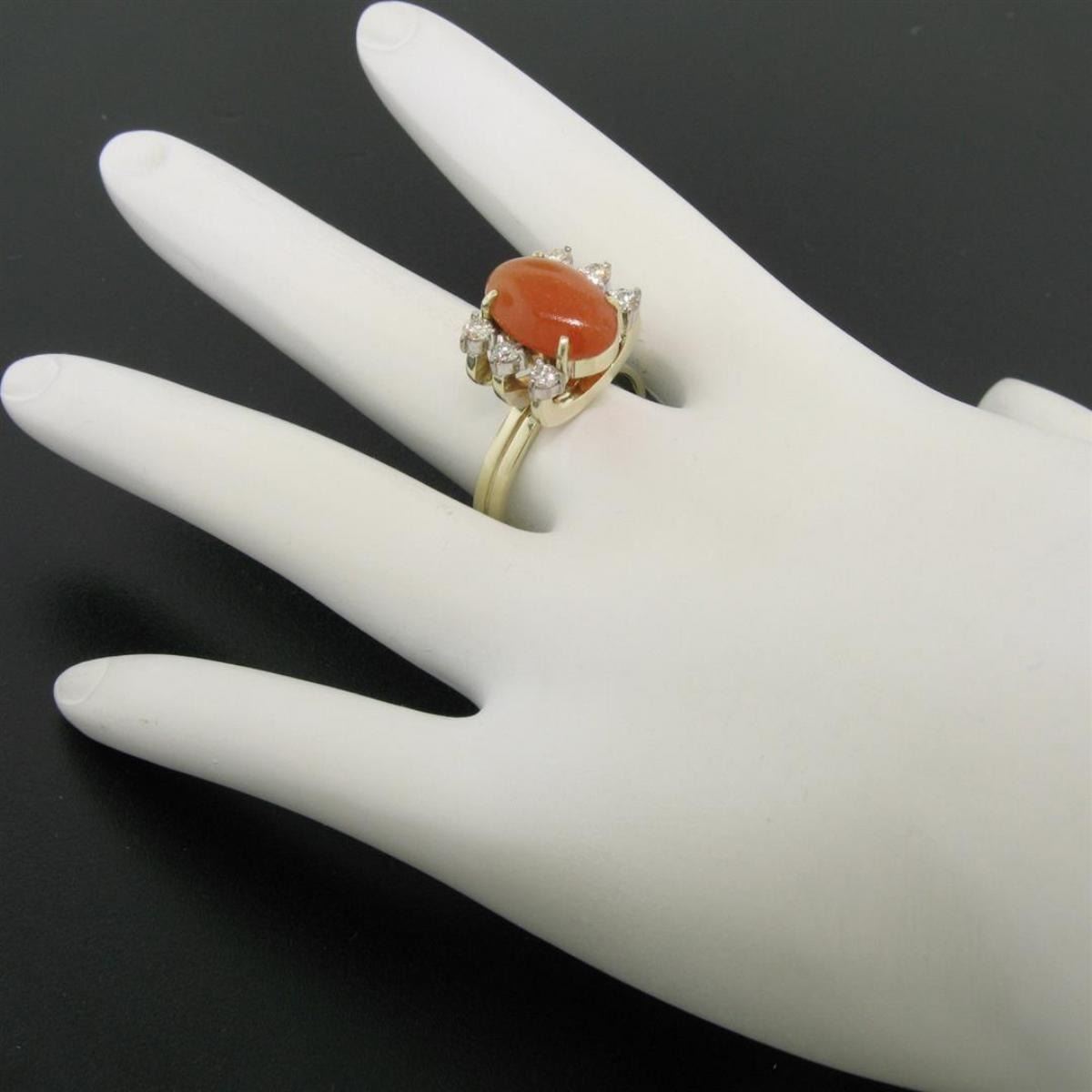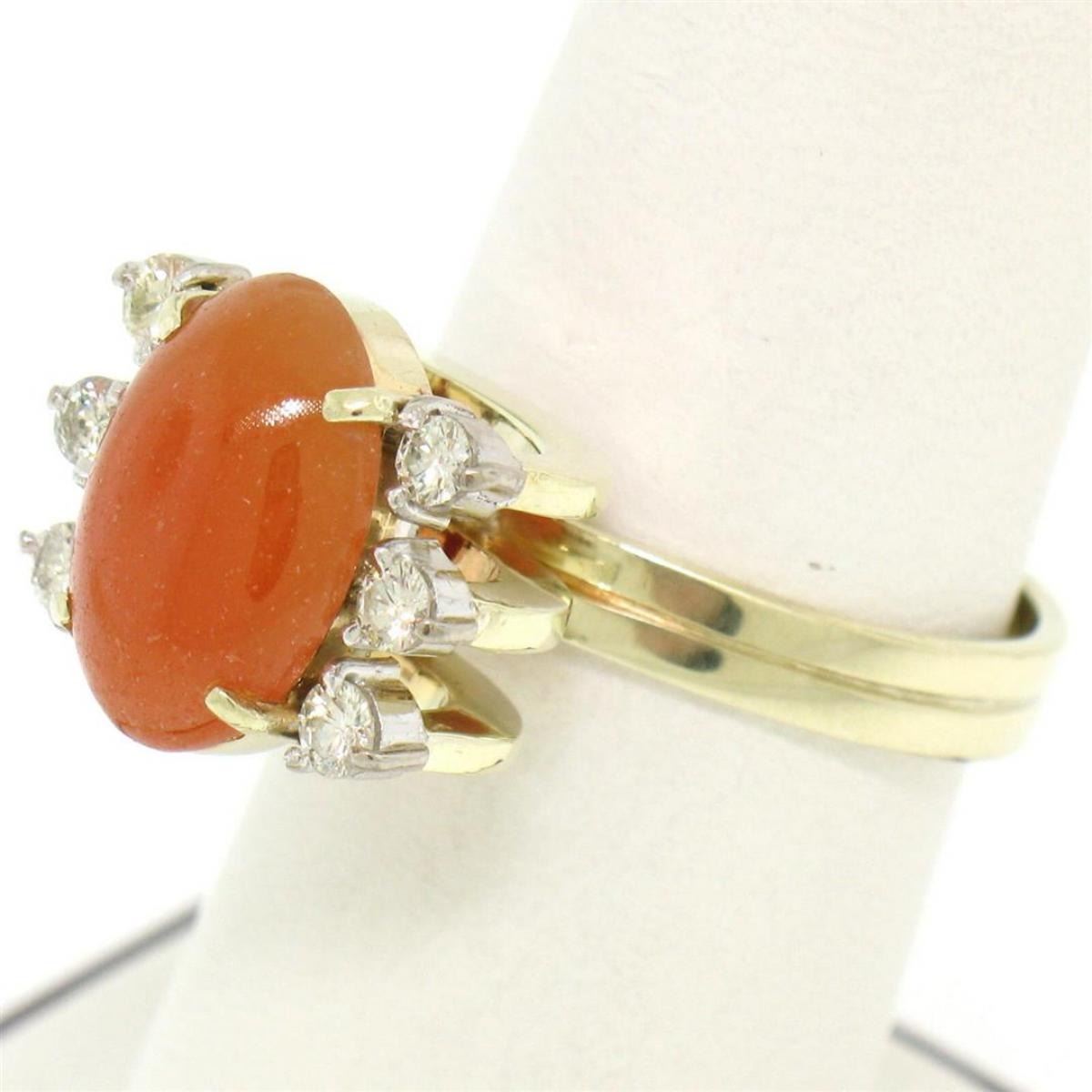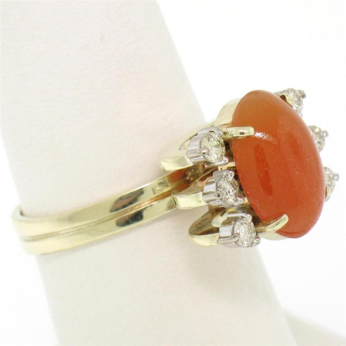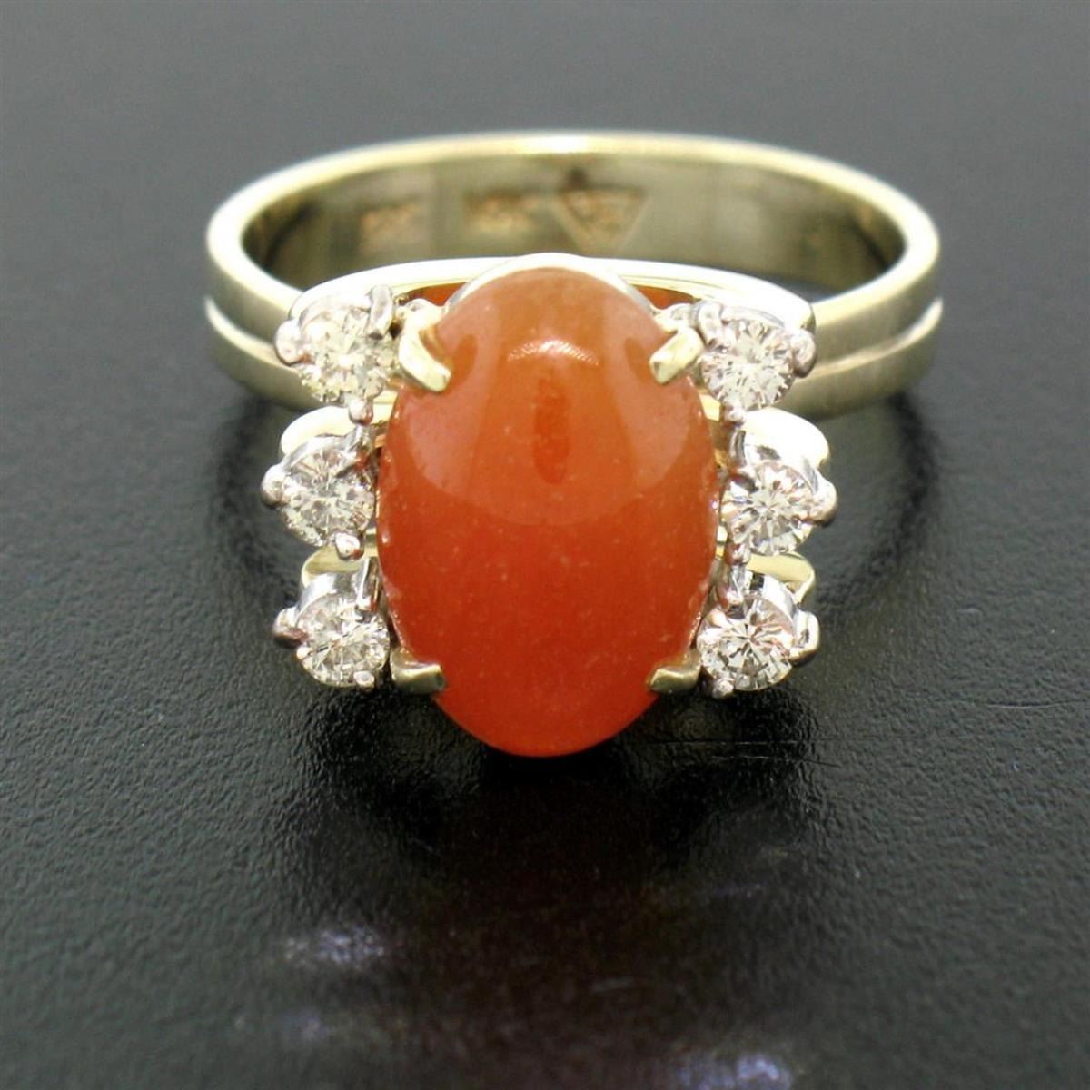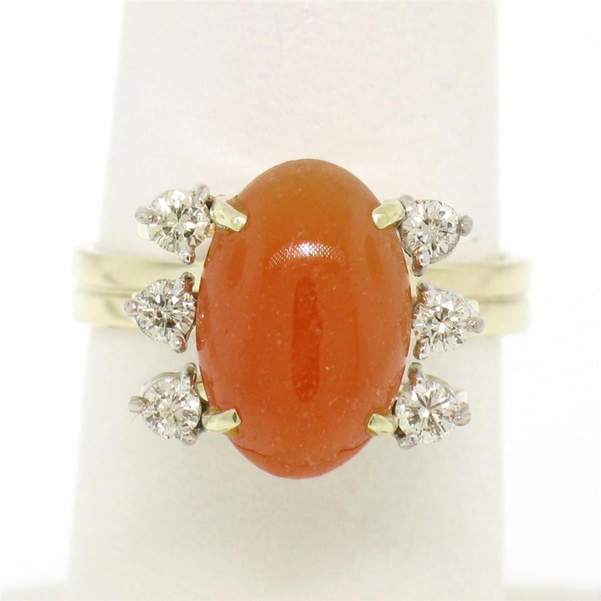 One Estate 14K Two Tone Gold Oval Carnelian Solitaire Ring w/ Round Diamond Accents. Item Details: Material: 14K Solid White & Yellow Gold, Weight: 6.7 Grams, Stone(s): (1) Natural Genuine Carnelian - Oval Shape - Prong Set - Orange Color - 12.6 x 8.5 mm, (6) Natural Genuine Diamonds - Brilliant Cut - Prong Set - H Color SI1 Clarity- 0.30Ctw (approx.), Ring Size: 7.5 (We can custom size this ring.), Ring Width: 12.6 mm, Ring Height: 13.58 mm rise off the finger, Condition: Estate Like New!