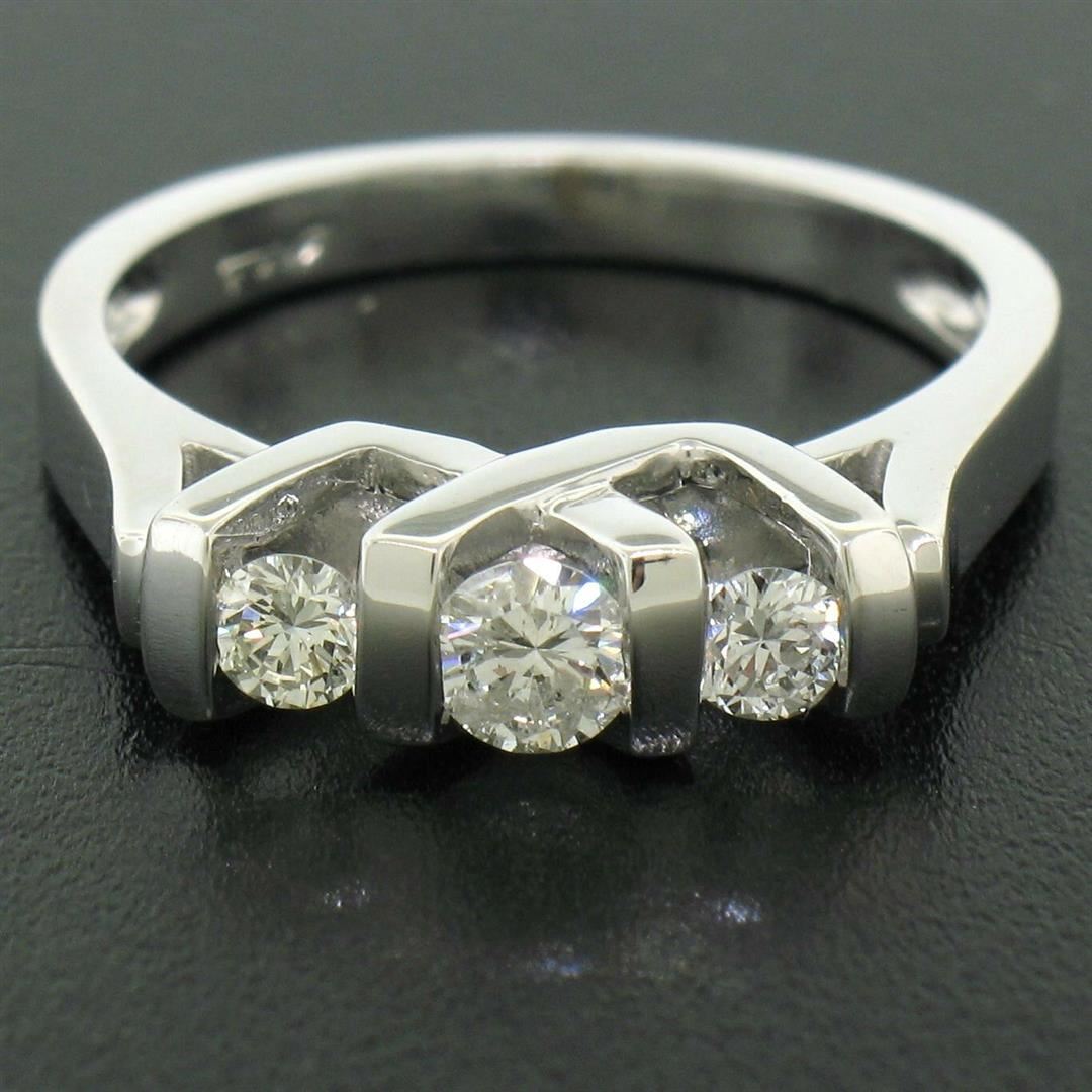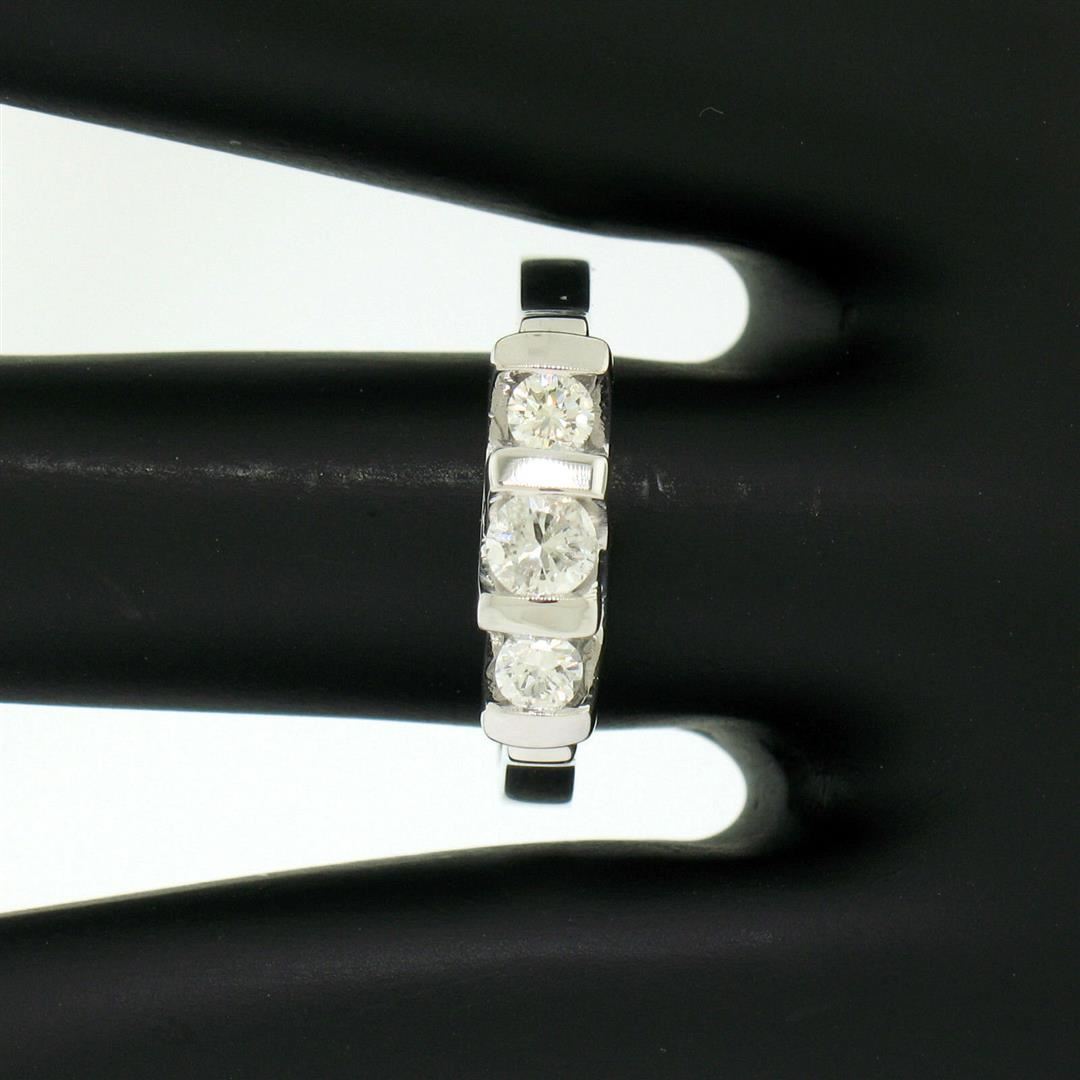 One 14K White Gold 0.40ctw High Bar Set Round Brilliant Cut Diamond Band Ring Sz 6.5. Item Details: Material: 14K Solid White Gold, Weight: 4.16 Grams, Stone(s): (3) Natural Genuine Diamonds - Round Brilliant Cut - Bar Set - G/H Color - VS2/SI1 Clarity, Total Carat Weight: 0.40 (approx.), Ring Size: 6.5 , Ring Width: 4.57mm, Ring Height: 6.33mm rise off the finger, Condition: Like New!