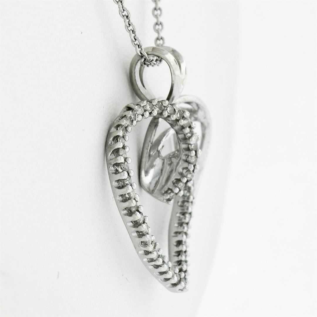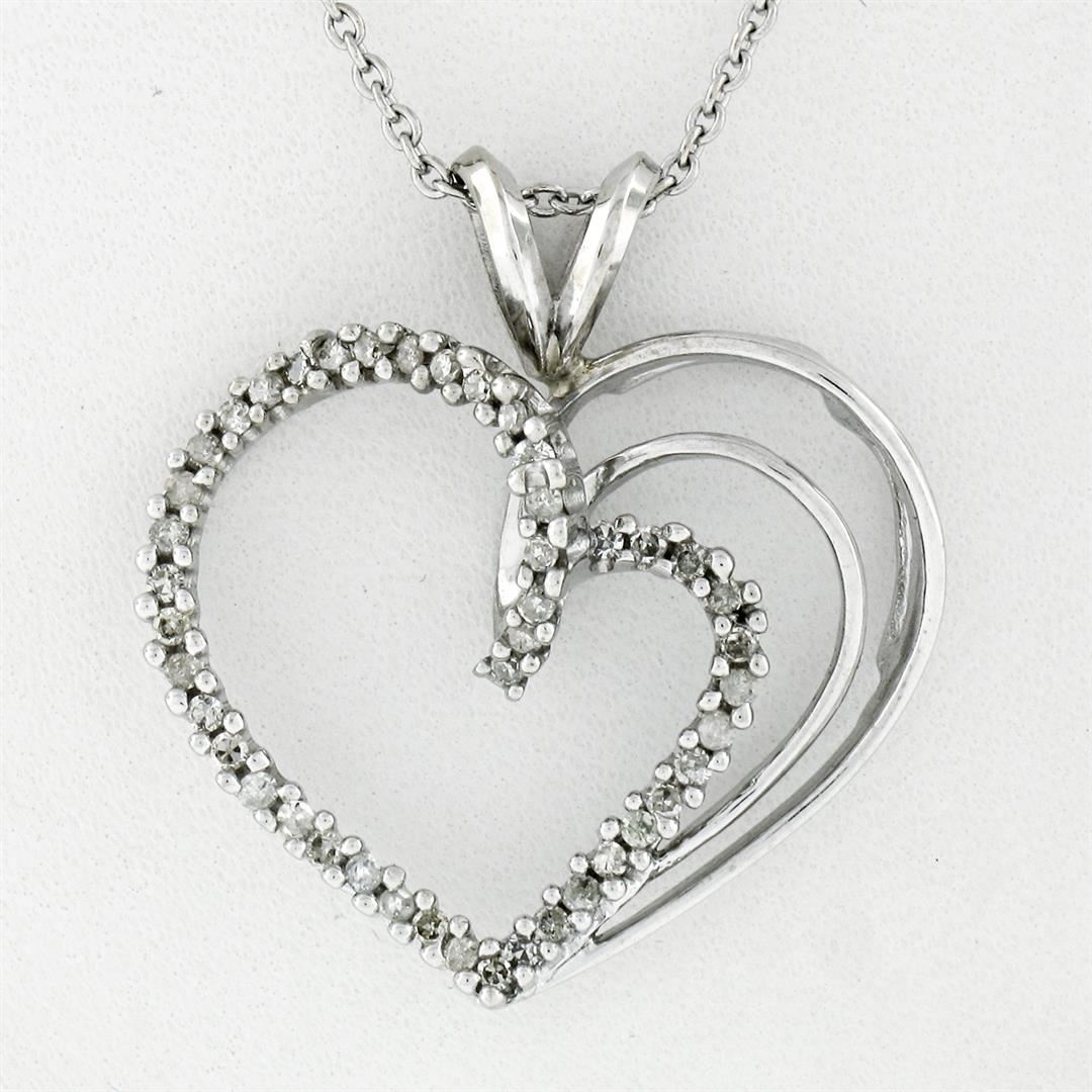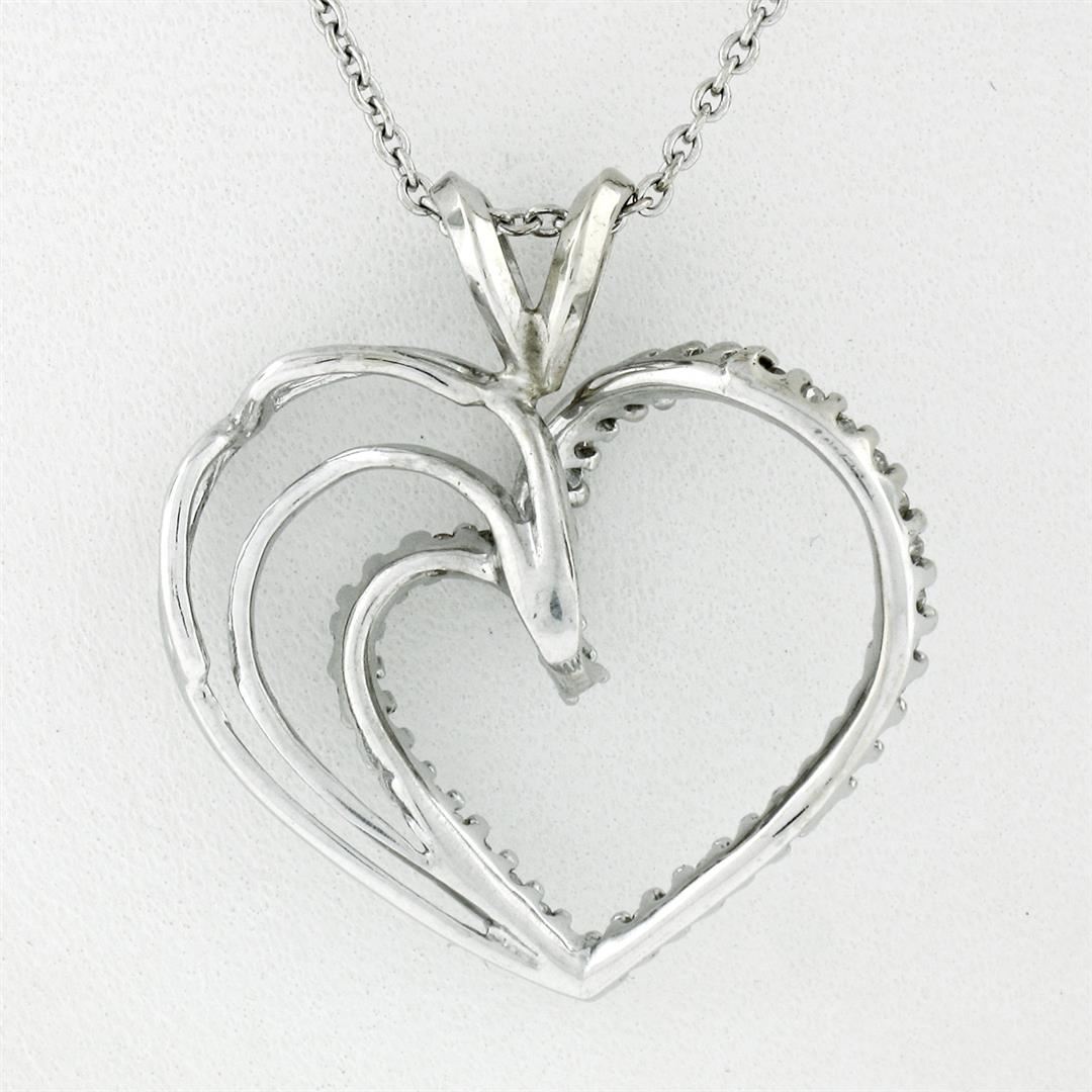 An estate solid 14k white gold heart pendant necklace, with 45 round single cut natural diamonds (H/I - I1/I2; 0.50ctw). The pendant weighs a total of 4.59 grams, measures 24x22.65mm including the bail, and 20 inch fine cable link chain.