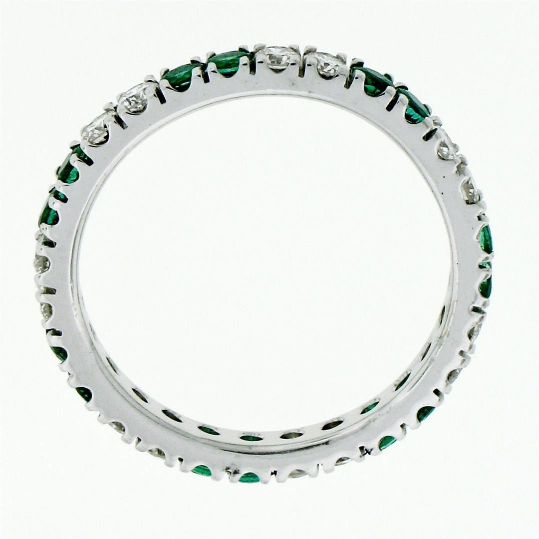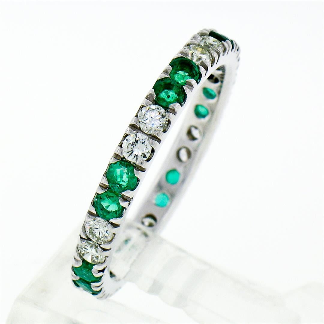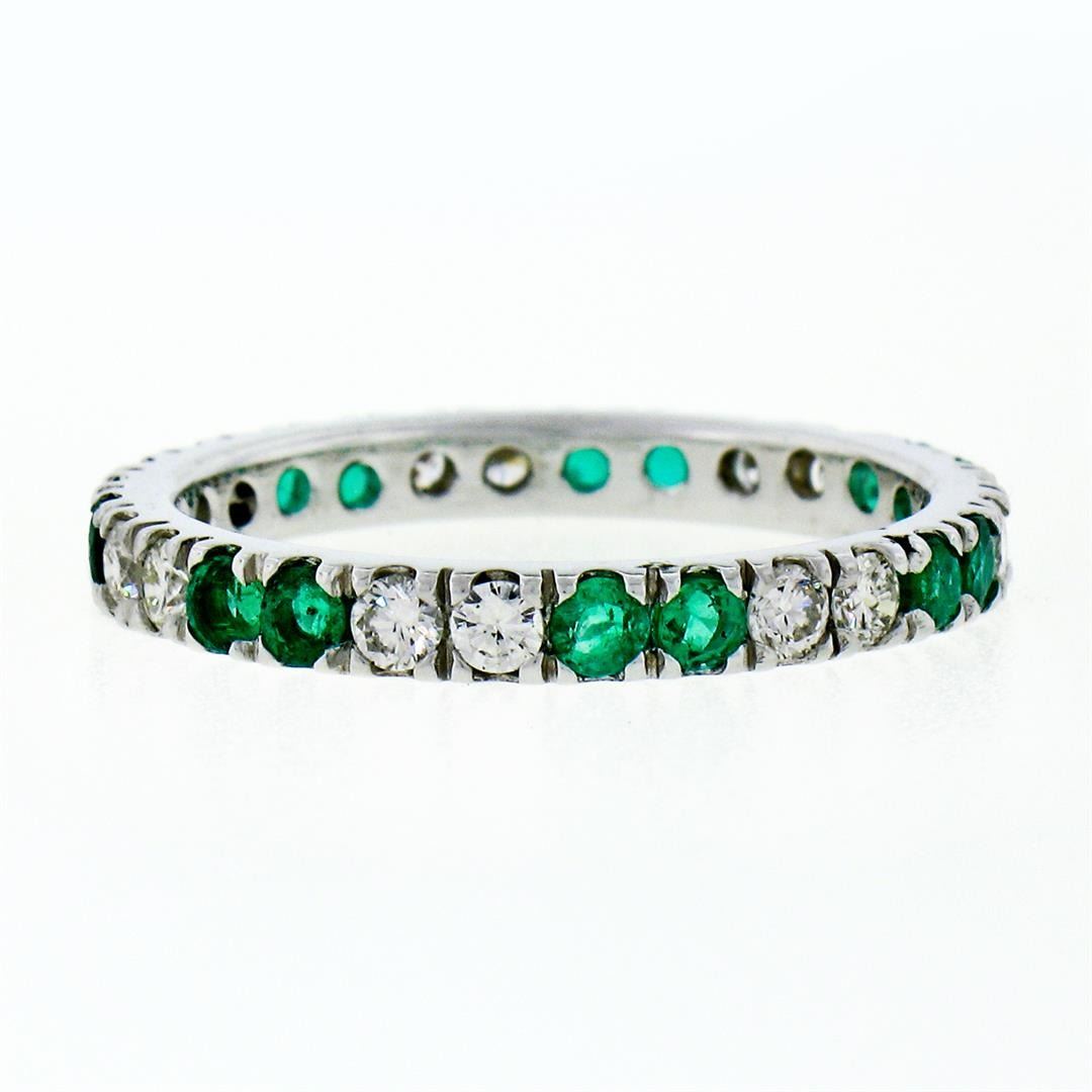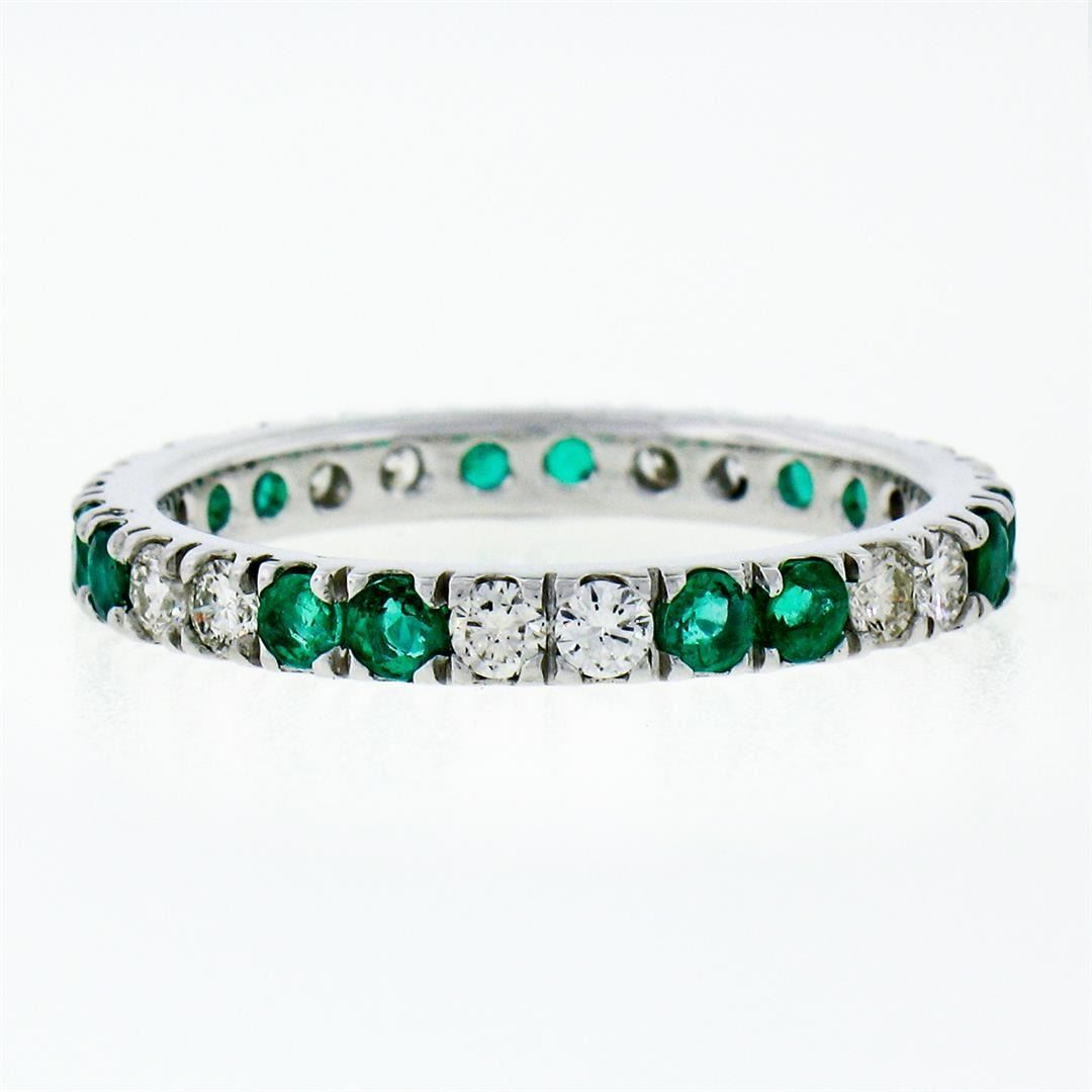 A new solid 14k white gold eternity ban ring, with 14 round brilliant cut natural diamonds (G/H- VS1/VS2; 0.60ctw), and 14 round brilliant cut emerlads (0.80ctw). The ring is size 7.0, weighs a total of 2.24 grams, and measures 2.65mm wide.