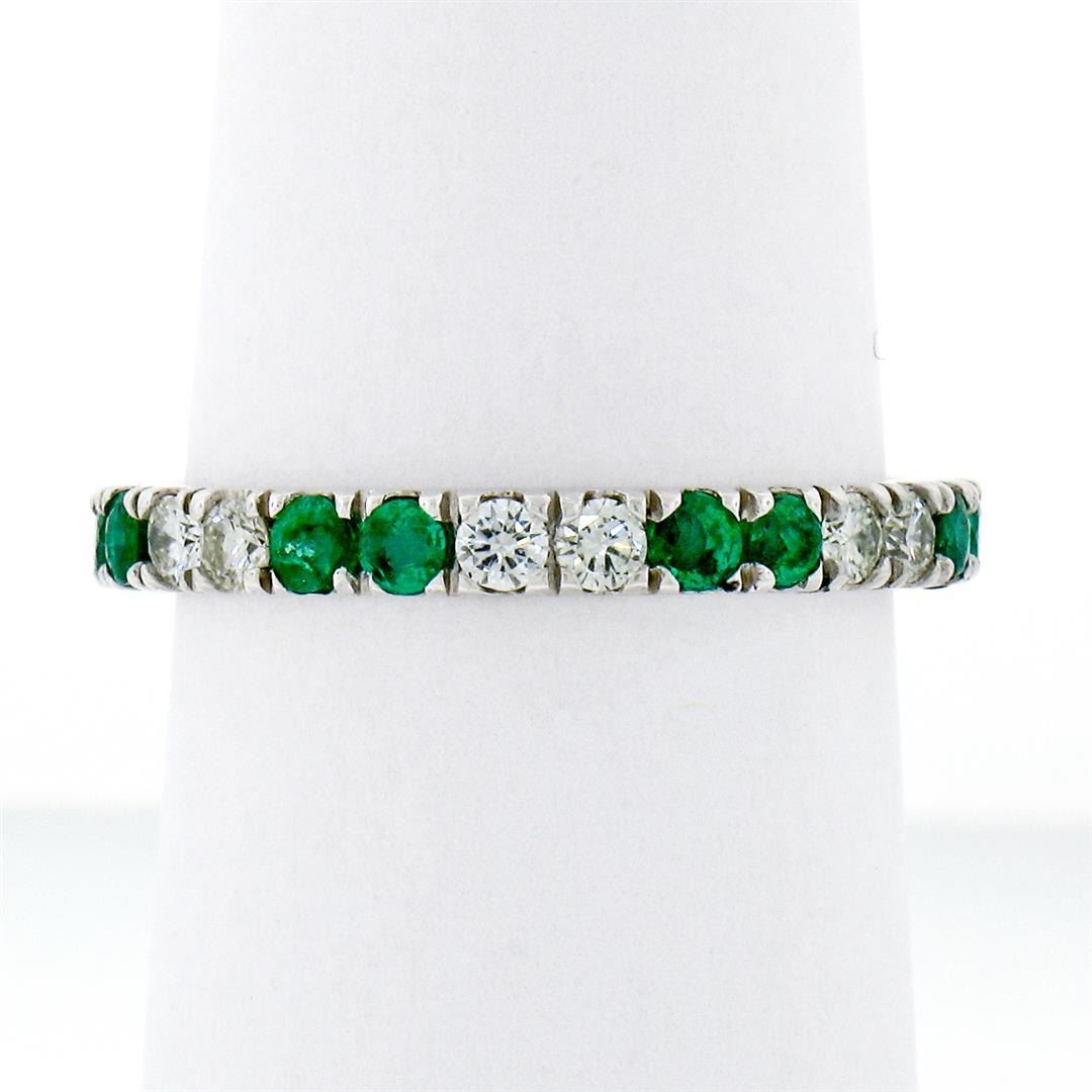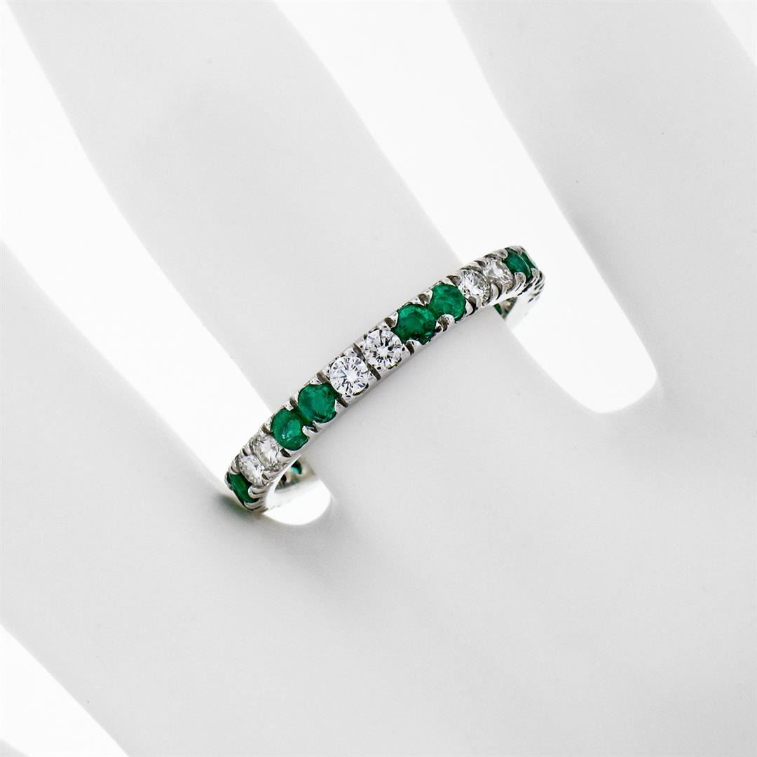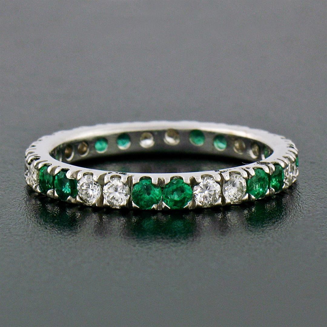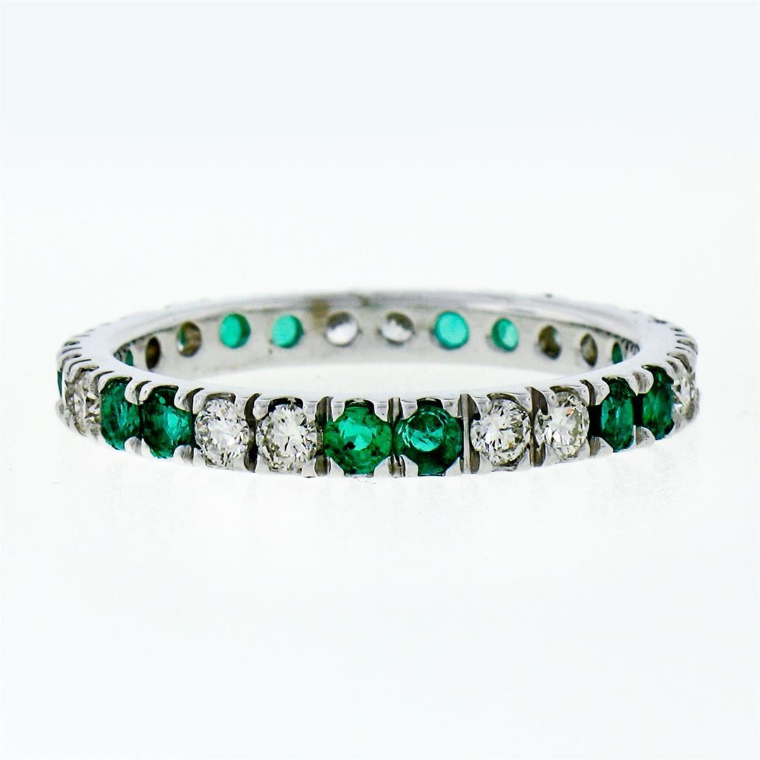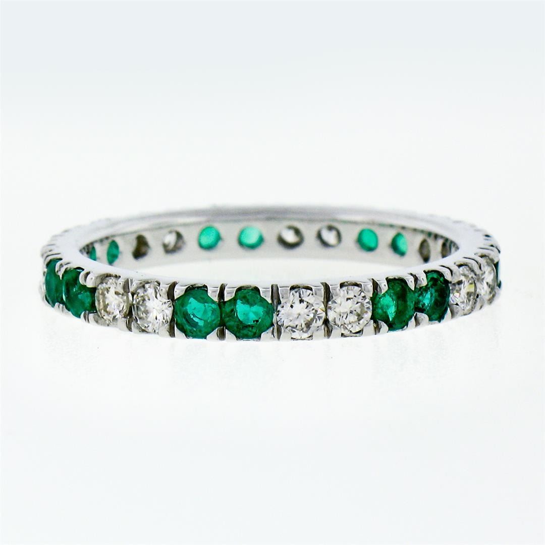 A new solid 14k white gold eternity ban ring, with 14 round brilliant cut natural diamonds (G/H- VS1/VS2; 0.60ctw), and 14 round brilliant cut emerlads (0.80ctw). The ring is size 7.0, weighs a total of 2.24 grams, and measures 2.65mm wide.
