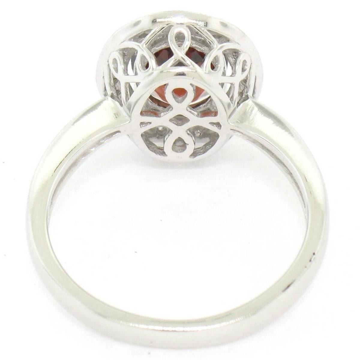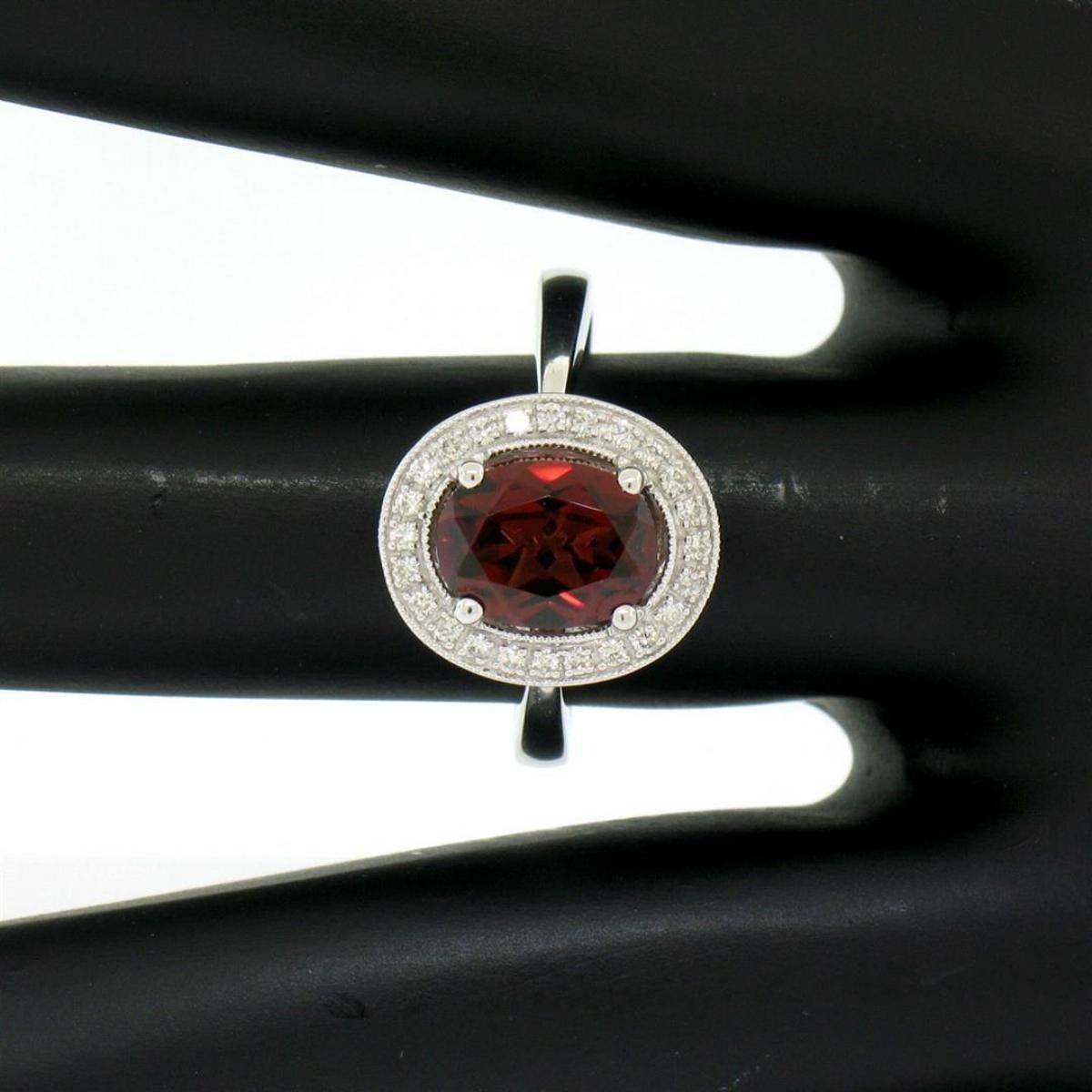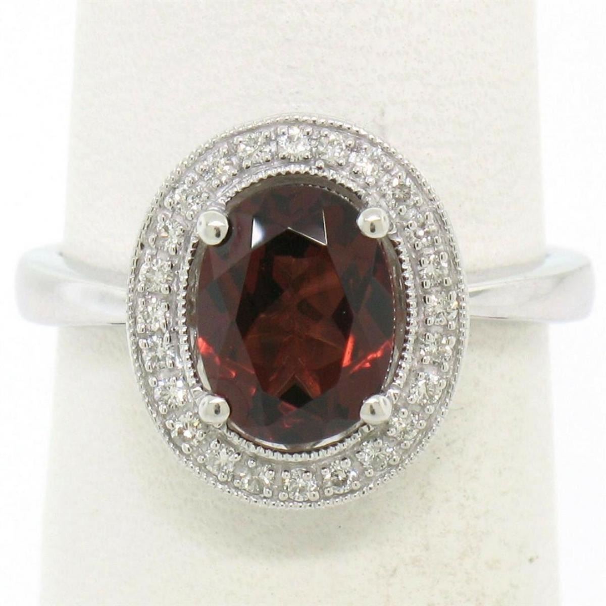 One NEW 14K White Gold 1.59ctw Oval Garnet Ring w/ Milgrain Pave Round Diamond Halo. Item Details: Material: 14K Solid White Gold, Weight: 3.24 Grams, Stone(s): (1) Natural Genuine Garnet - Oval Cut - Prong Set - Deep Brownish Red Color - 8.25x6.25mm / 1.47ct (approx.), (24) Natural Genuine Diamonds - Round Brilliant Cut - Pavé Set - F Color - VS2 Clarity - 0.12ctw (approx.), Total Carat Weight: 1.59 (approx.), Ring Size: 5.5, Ring Width: 12.65mm, Ring Height: 6.60mm rise off the finger. Condition: Brand new w/o tags!