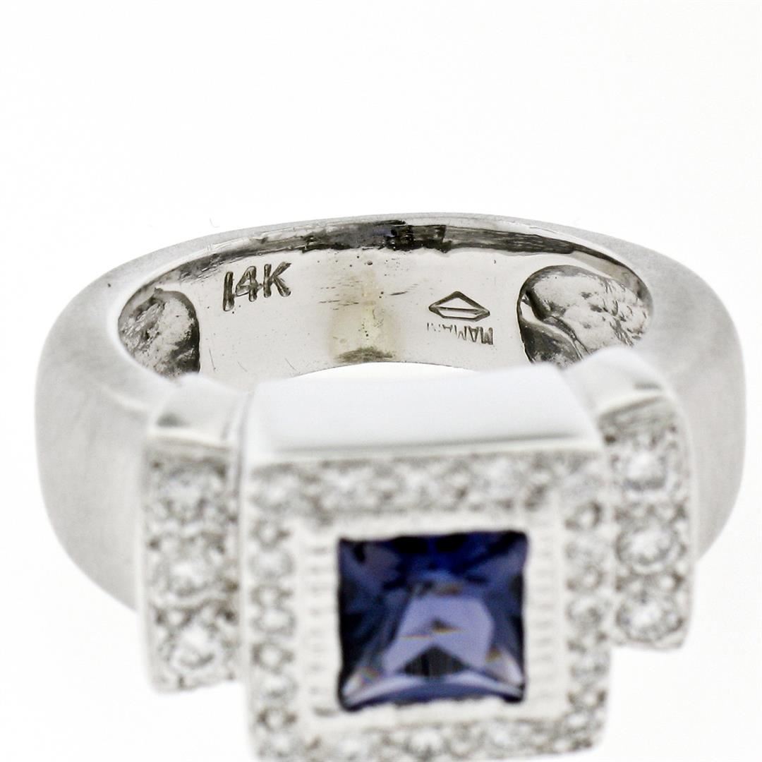 An estate solid 14k white gold ring, with 1 princess cut natural Iolite (1.15ct), and 22 round brilliant cut natural diamonds (F/G - VS1/VS2; 0.50ctw). The ring is size 5.5, weighs a total of 9.30 grams, and measures 10.25mm wide.