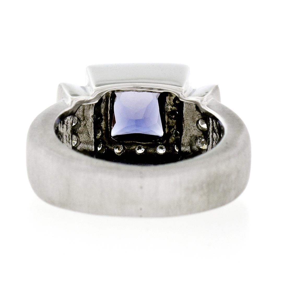 An estate solid 14k white gold ring, with 1 princess cut natural Iolite (1.15ct), and 22 round brilliant cut natural diamonds (F/G - VS1/VS2; 0.50ctw). The ring is size 5.5, weighs a total of 9.30 grams, and measures 10.25mm wide.