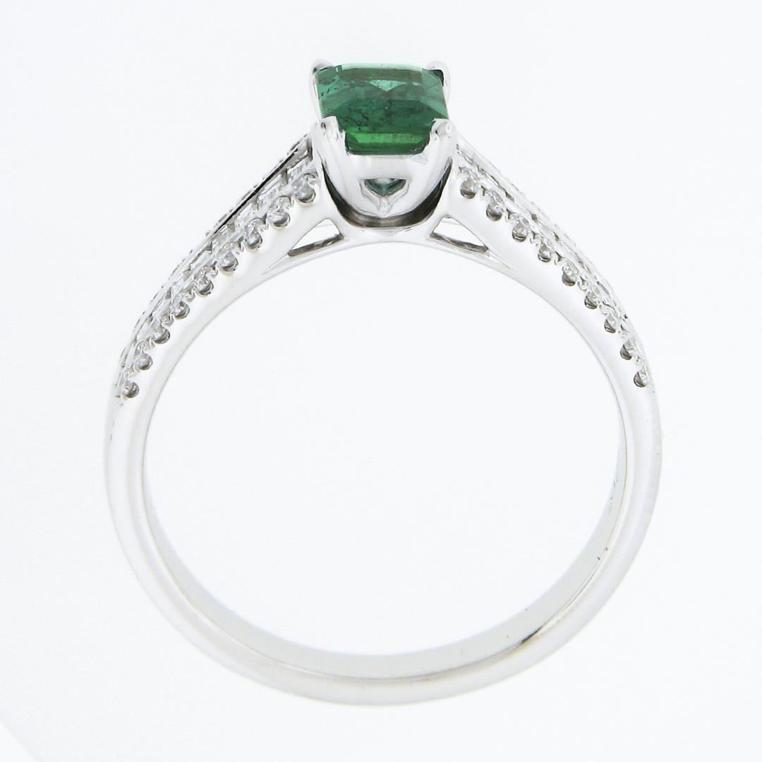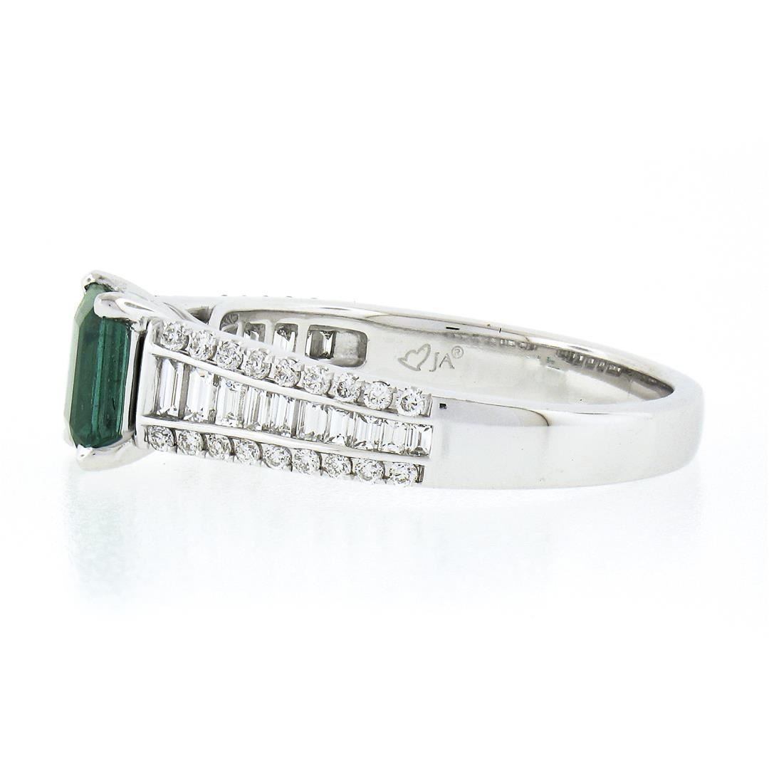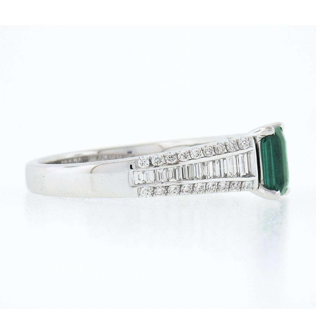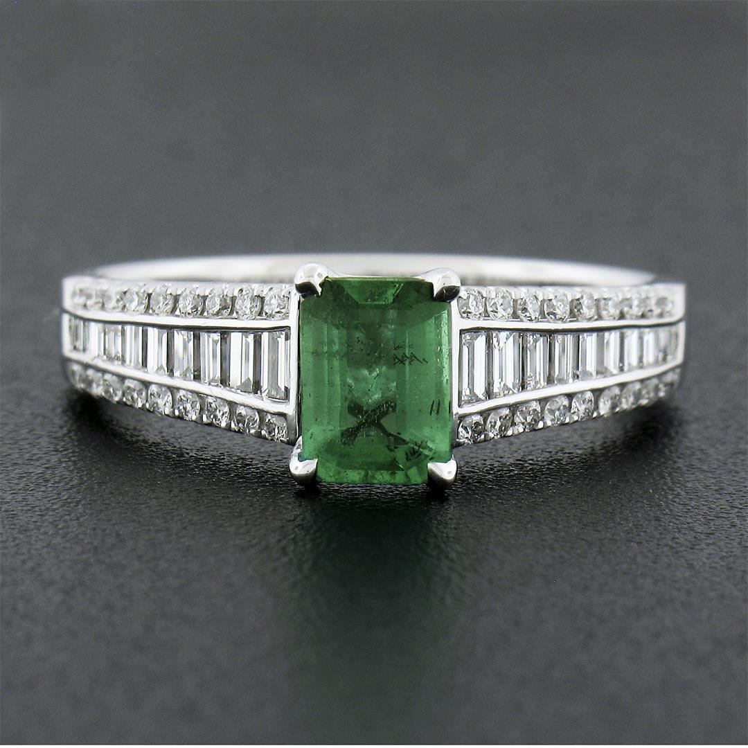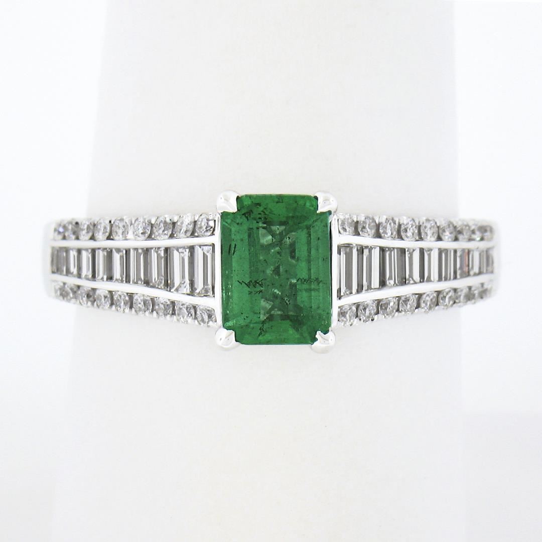 A solid 14k white gold ring, with 1 emerald cut natural emerald (0.75ct), and 20 baguette cut with 36 round brilliant cut natural diamonds (F/G - VS1/VS ; 0.96ctw). The ring is size 8.5, weighs a total of 4.59 grams, and measures 7.5mm wide.