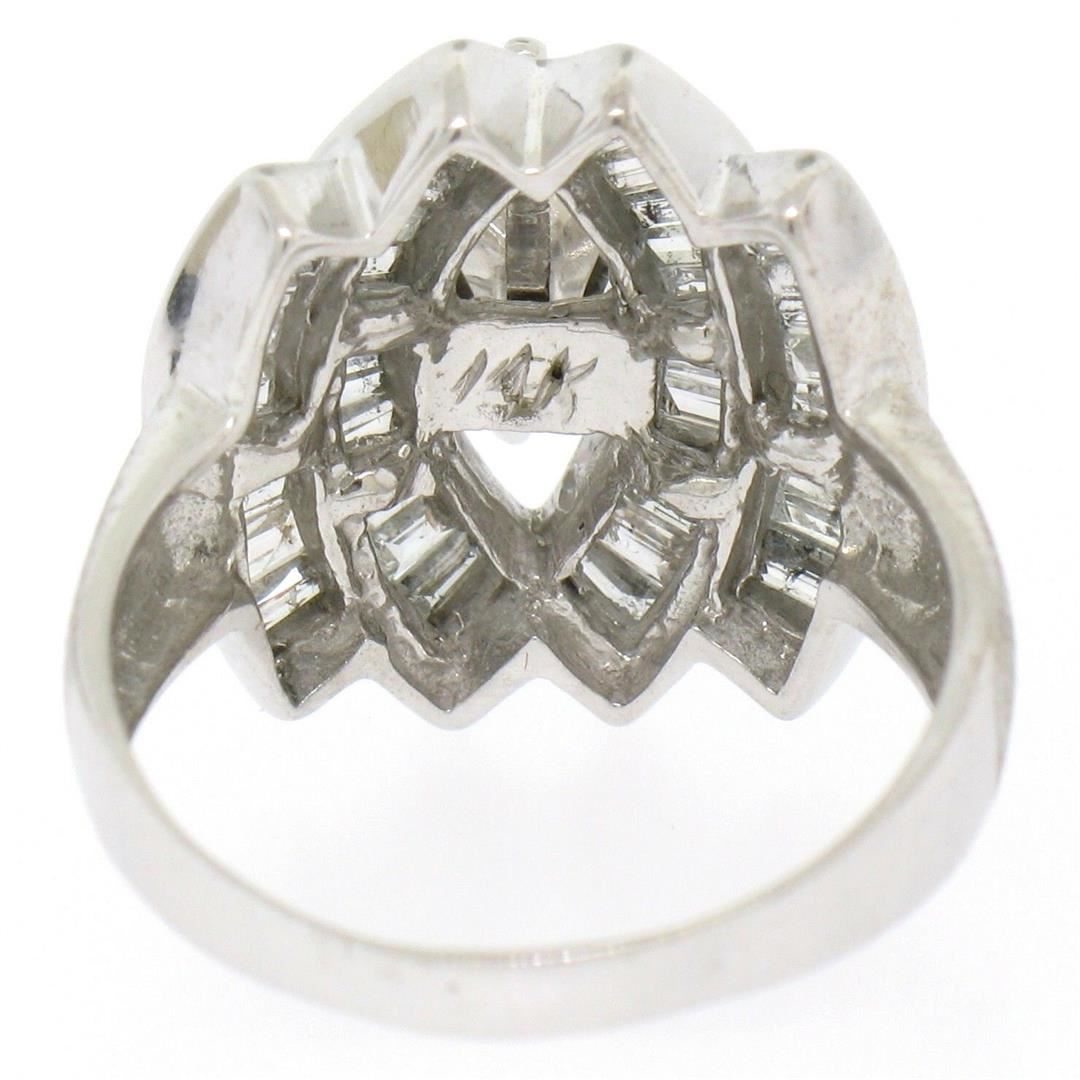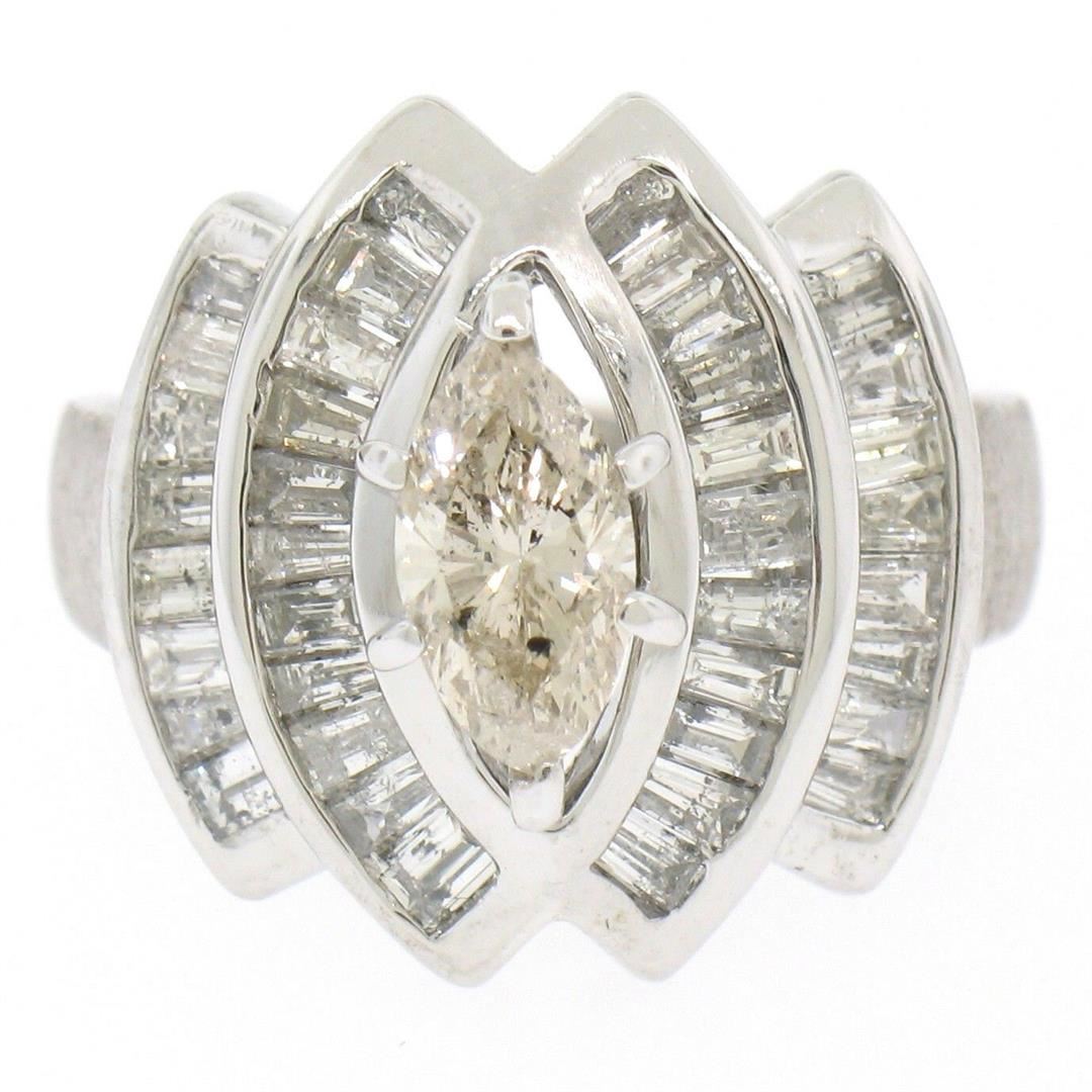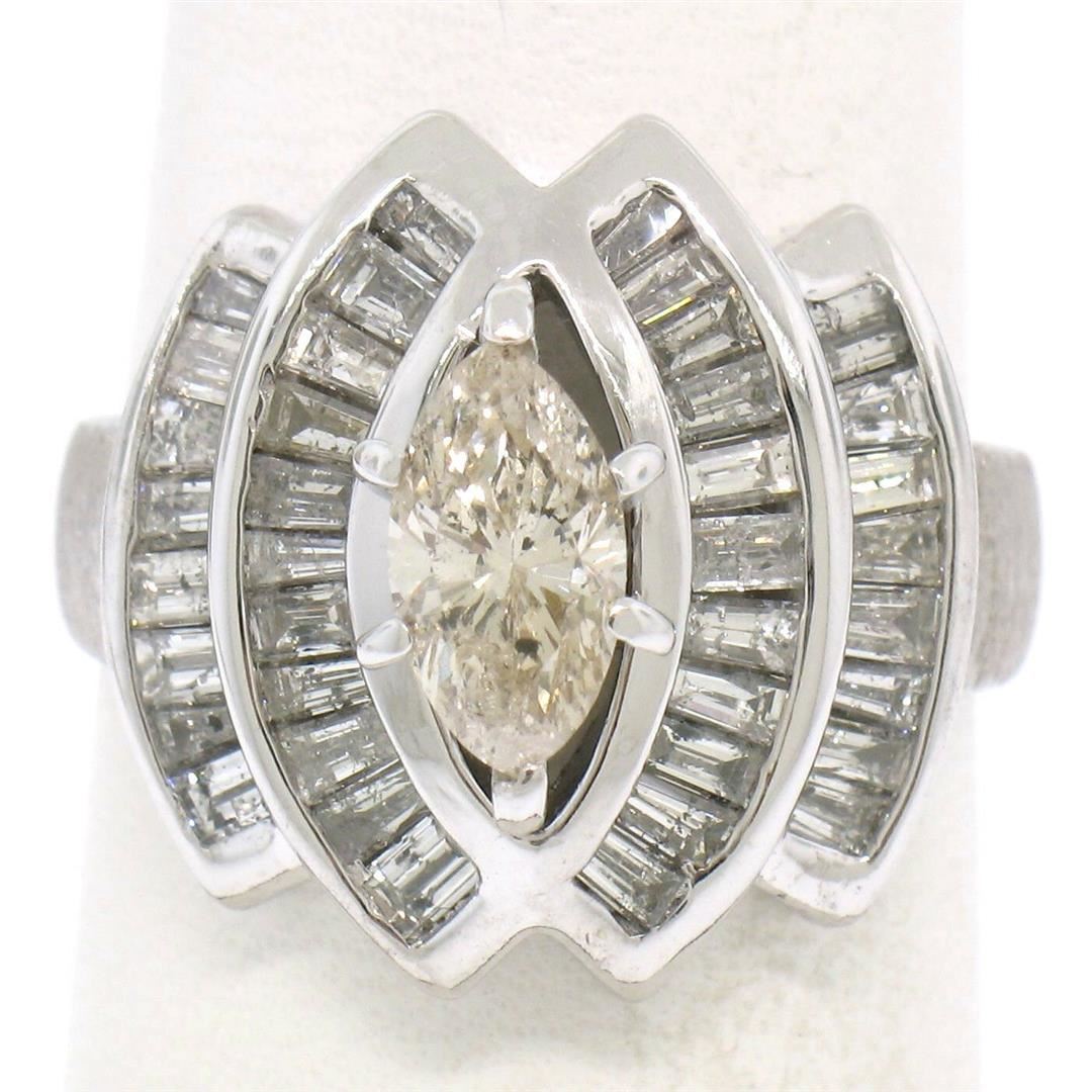 One 14K White Gold 1.74ctw Diamond Engagement Ring w/ Light Champagne Marquise Solitaire. Item Details: Material: 14K Solid White Gold, Weight: 6.6 Grams, Stone(s): (1) Natural Genuine Diamond - Marquise Cut - Prong Set - Light Champagne Color - I1 Clarity - 0.60 (exact), (38) Natural Genuine Diamonds - Baguette Cut - Channel Set - H/I Color - I1 Clarity - 1.14ctw (approx.), Total Carat Weight: 1.74 (approx.), Ring Size: 7.0 , Ring Width: 17.10mm, Ring Height: 9.15mm rise off the finger Condition: Like New!