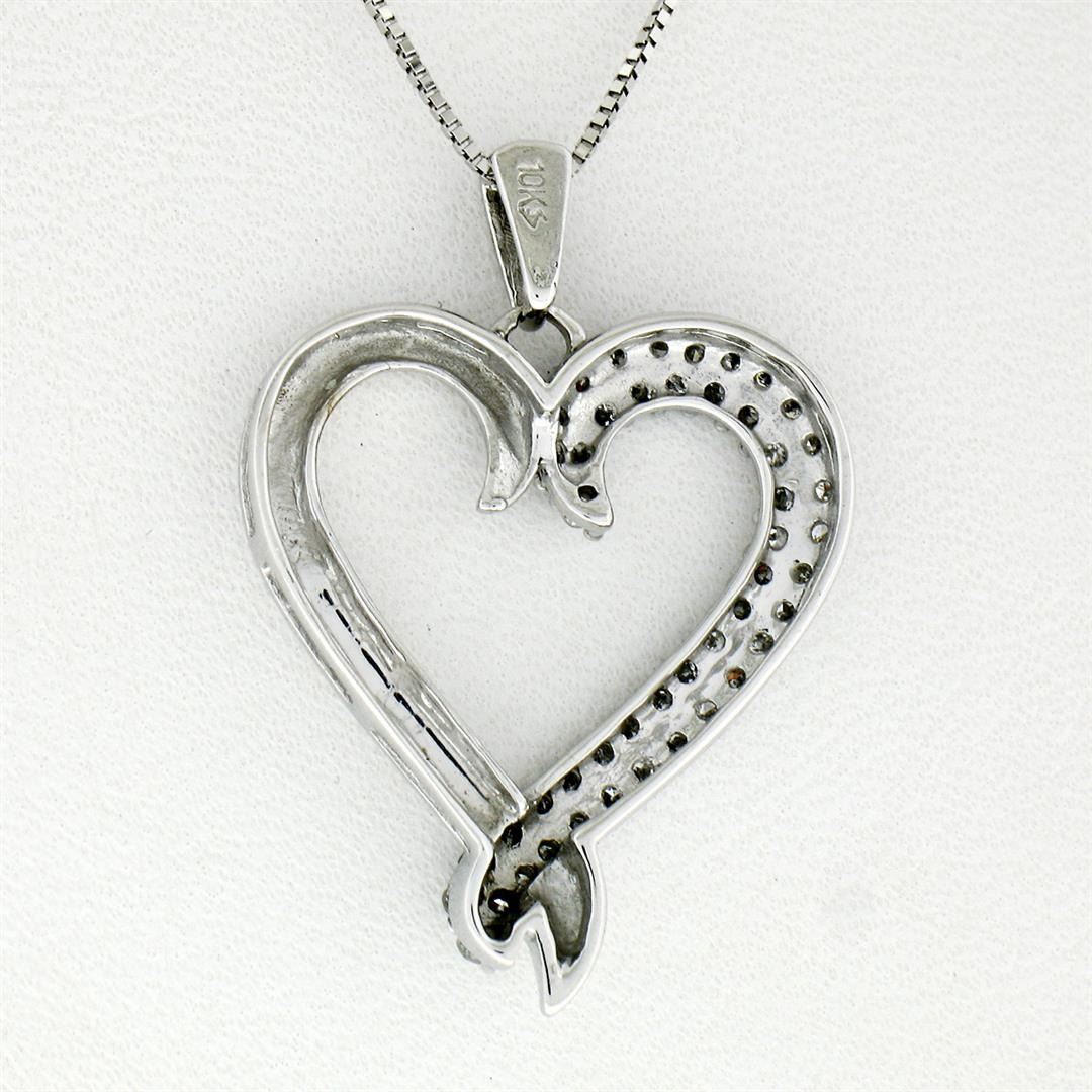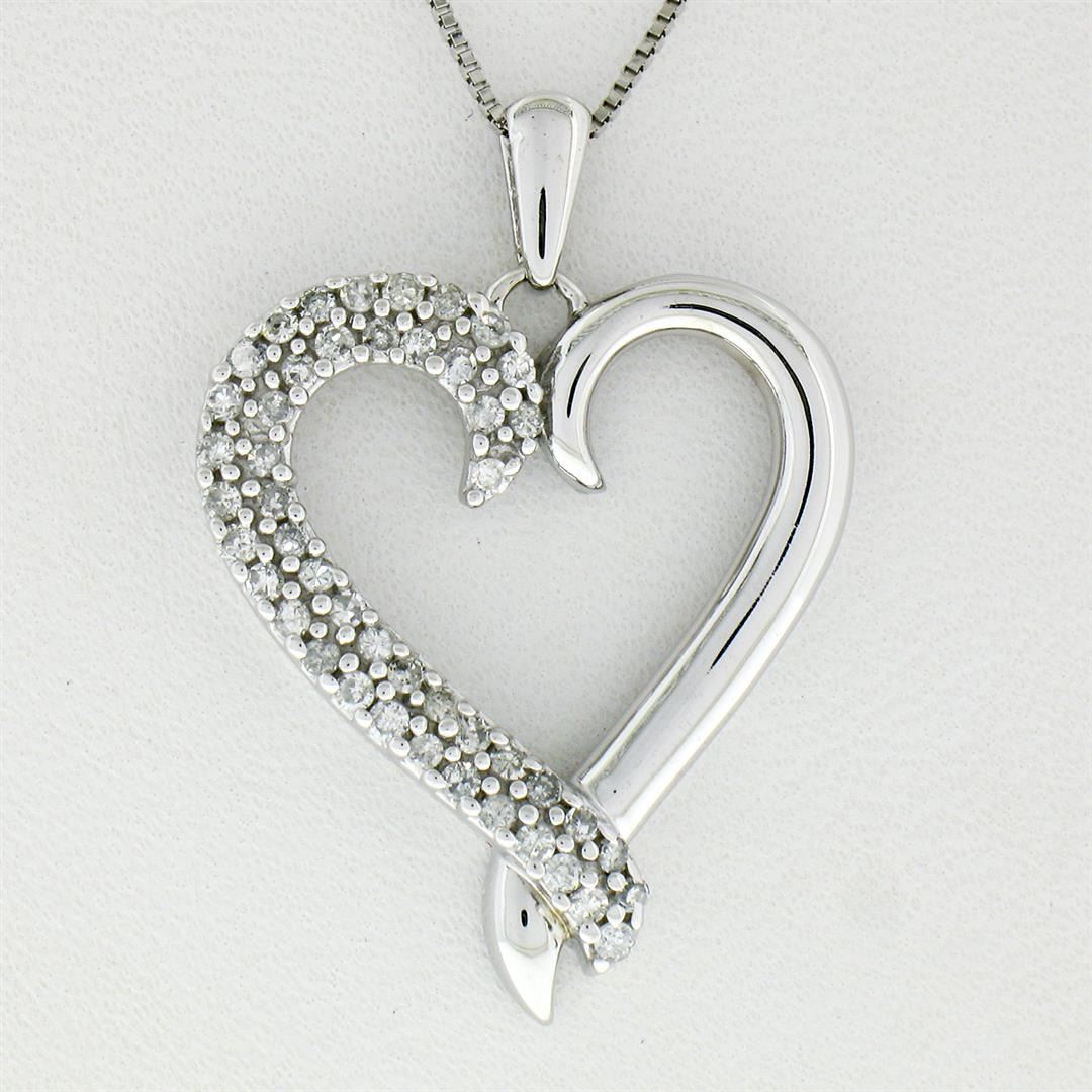 An estate solid 10k white gold heart pendant necklace, with 47 round single cut natural diamonds (H/I - SI2/I1; 0.38ctw). The pendant weighs a total of 2.73 grams, measures 27.25x19.40mm including the bail, and 14k white gold 16 inch fine box link chain.