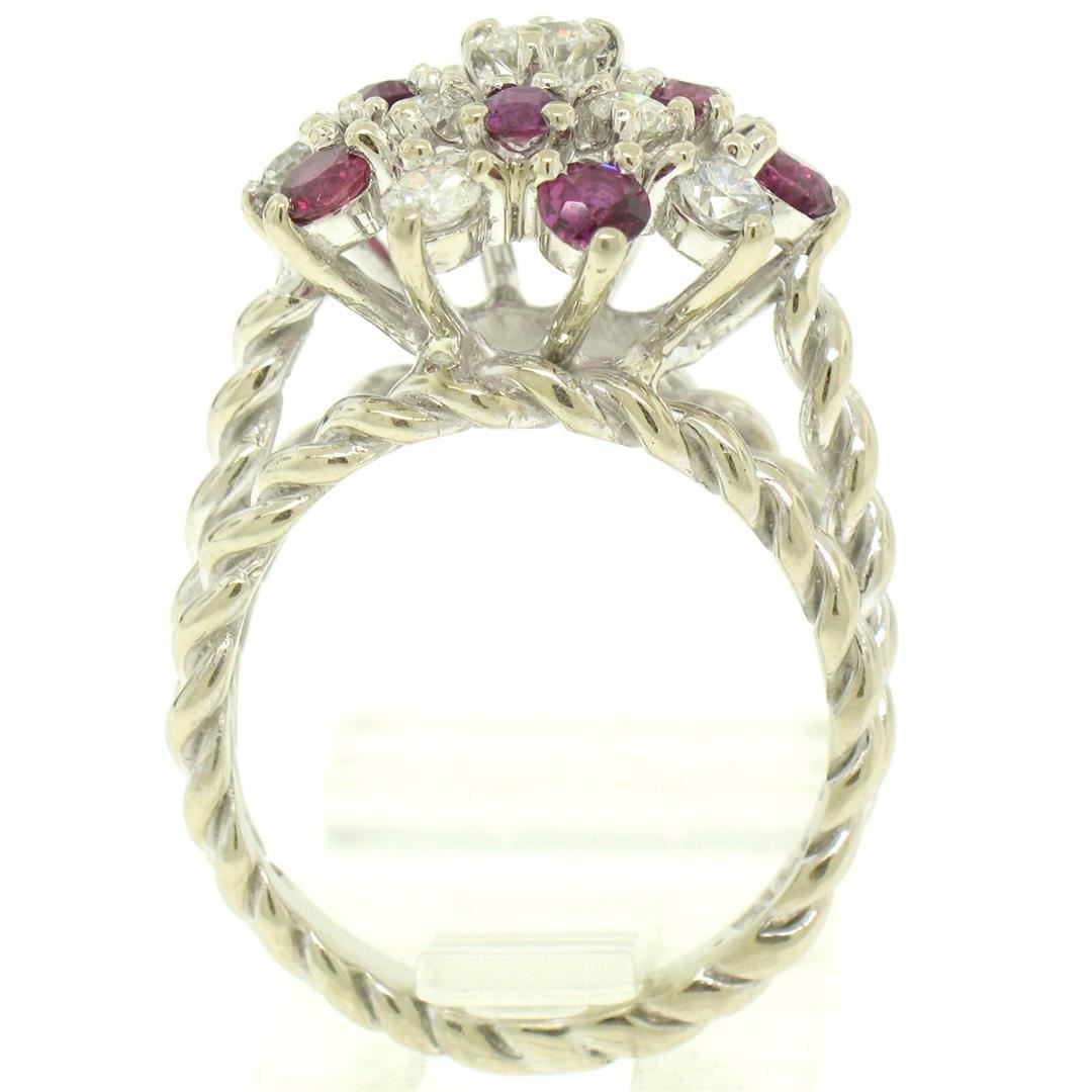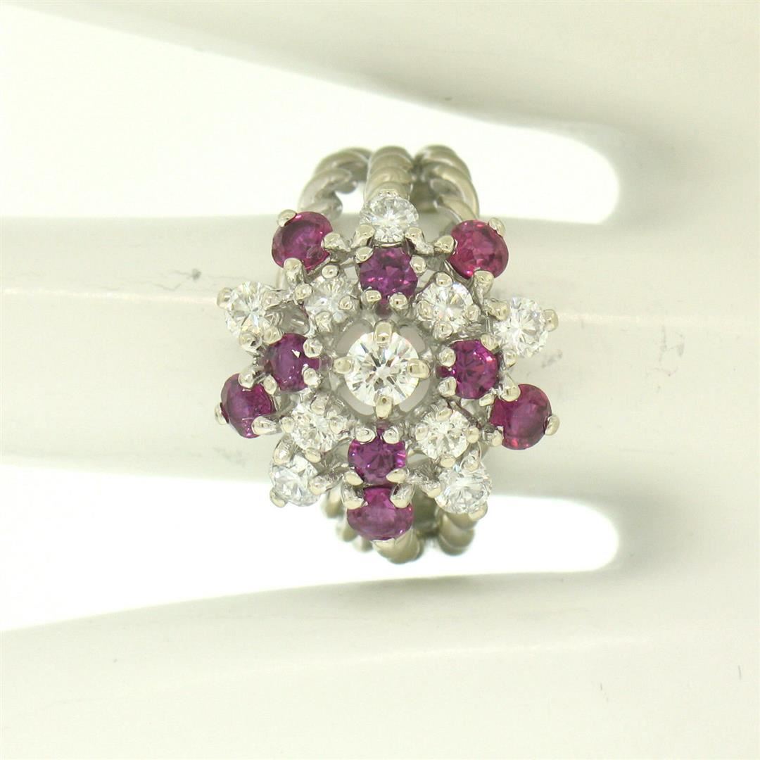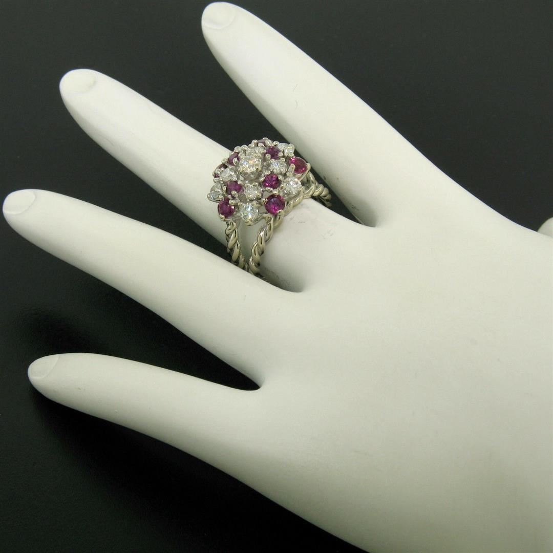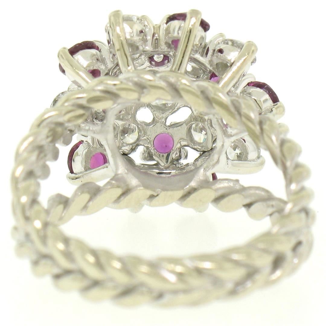 One 14K White Gold 2.10ctw Diamond & Ruby Cluster Daisy Twisted Wire Cocktail Ring. Item Details - Material: Solid 14K White Gold, Weight: 7.50 Grams, Stone(s): (10) Natural Genuine Diamonds - Round Brilliant Cut - Prong Set - F Color - VS1 Clarity - 0.90ctw (approx.), (9) Natural Genuine Rubies - Round Cut - Prong Set - Amazing Burgundy-Red Color - 1.20ctw (approx.), Total Carat Weight: 2.10 (approx.), Ring Size: 6.0, Ring Width: 16.25mm, Ring Height: 11.05mm rise off the finger, Condition: Like New!